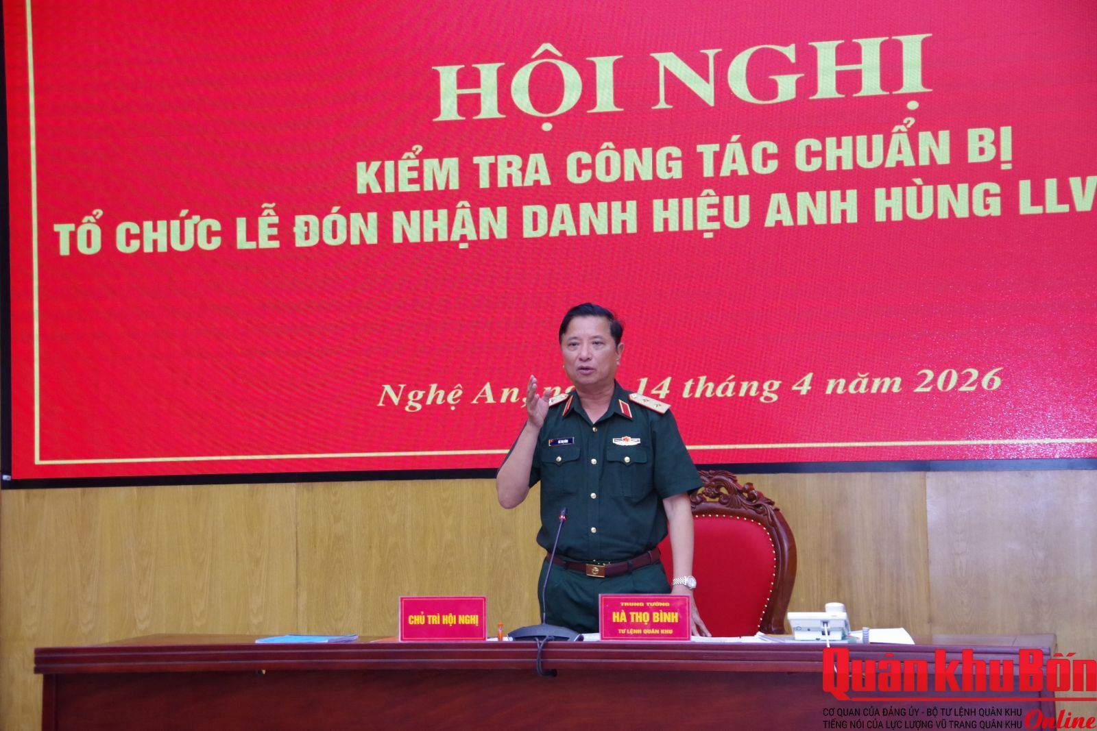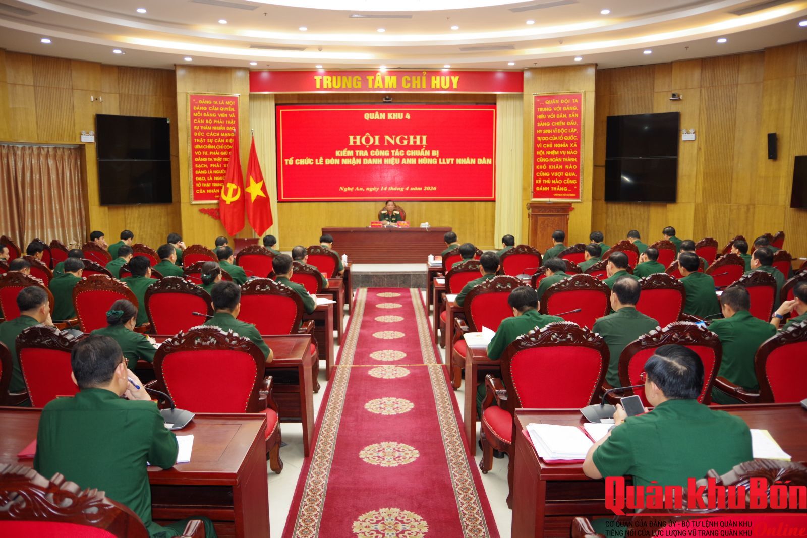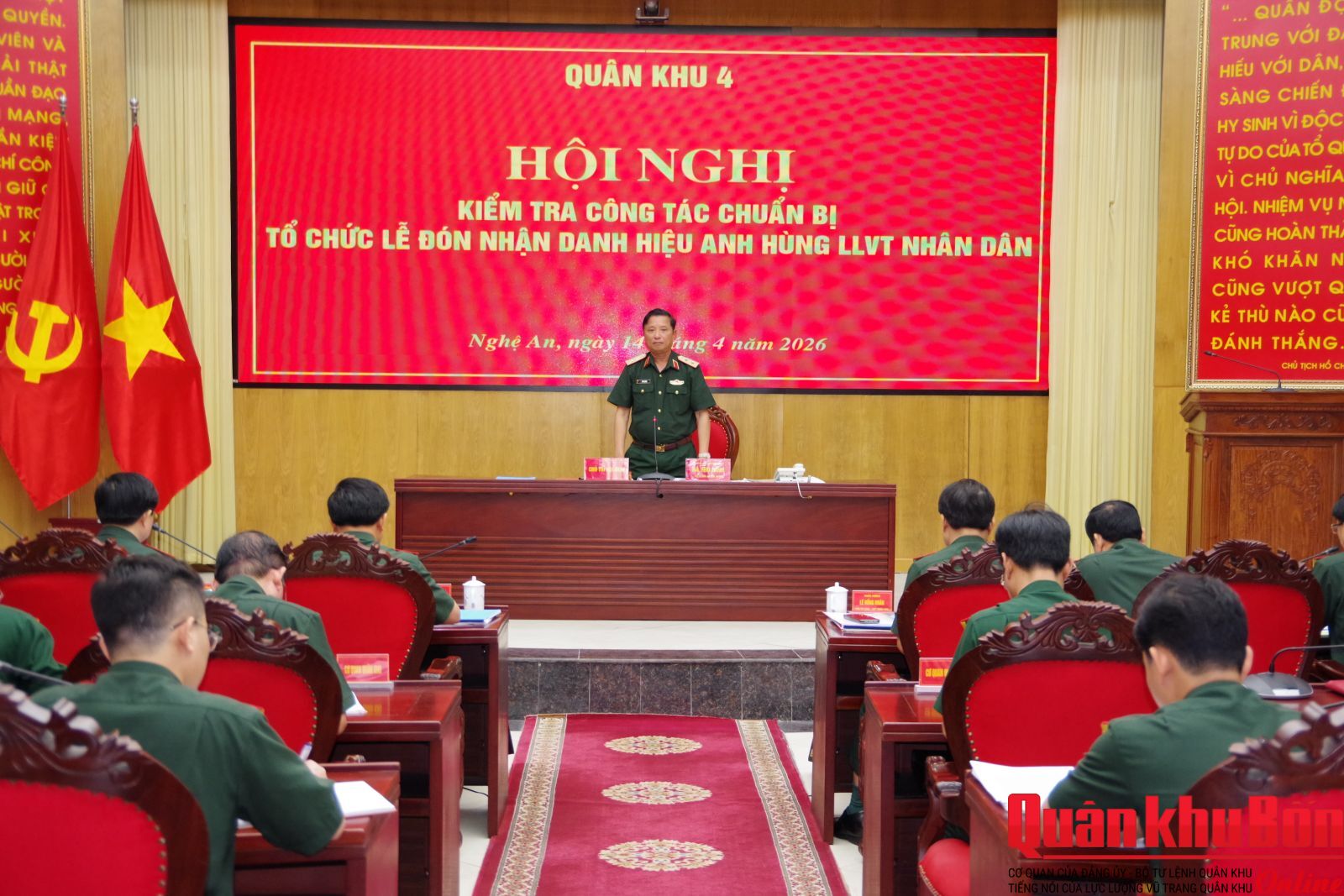 Sáng 14/4/2026, Trung tướng Hà Thọ Bình, Tư lệnh Quân khu 4 chủ trì hội nghị kiểm tra công tác chuẩn bị tổ chức Lễ đón nhận Danh hiệu Anh hùng Lực lượng vũ trang (LLVT) nhân dân của LLVT Quân khu 4.