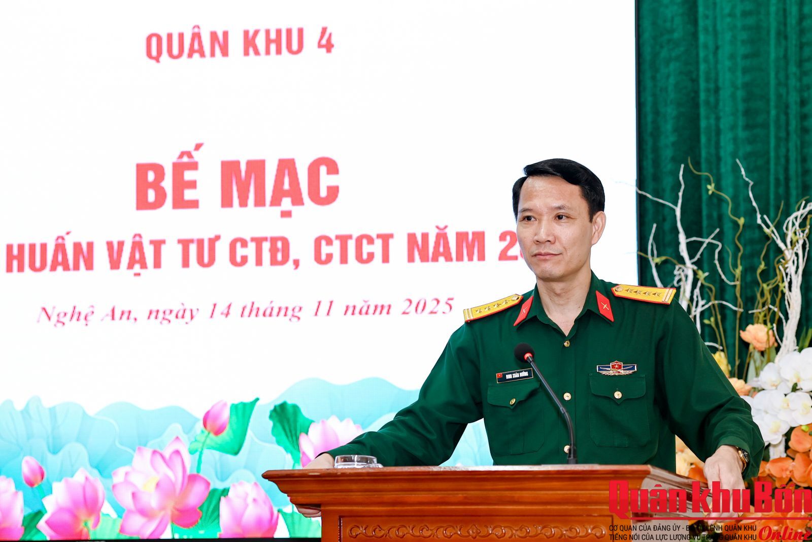 Ngày 14/11/2025, Ban Tổ chức lớp tập huấn đã tổ chức Lễ bế mạc lớp tập huấn vật tư công tác Đảng, công tác chính trị (CTĐ, CTCT) năm 2025. Đại tá Đinh Xuân Hướng, Phó Chủ nhiệm Chính trị Quân khu dự và phát biểu chỉ đạo.