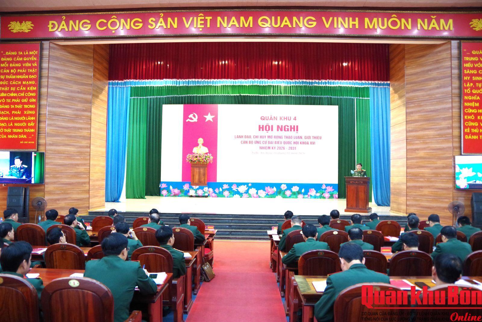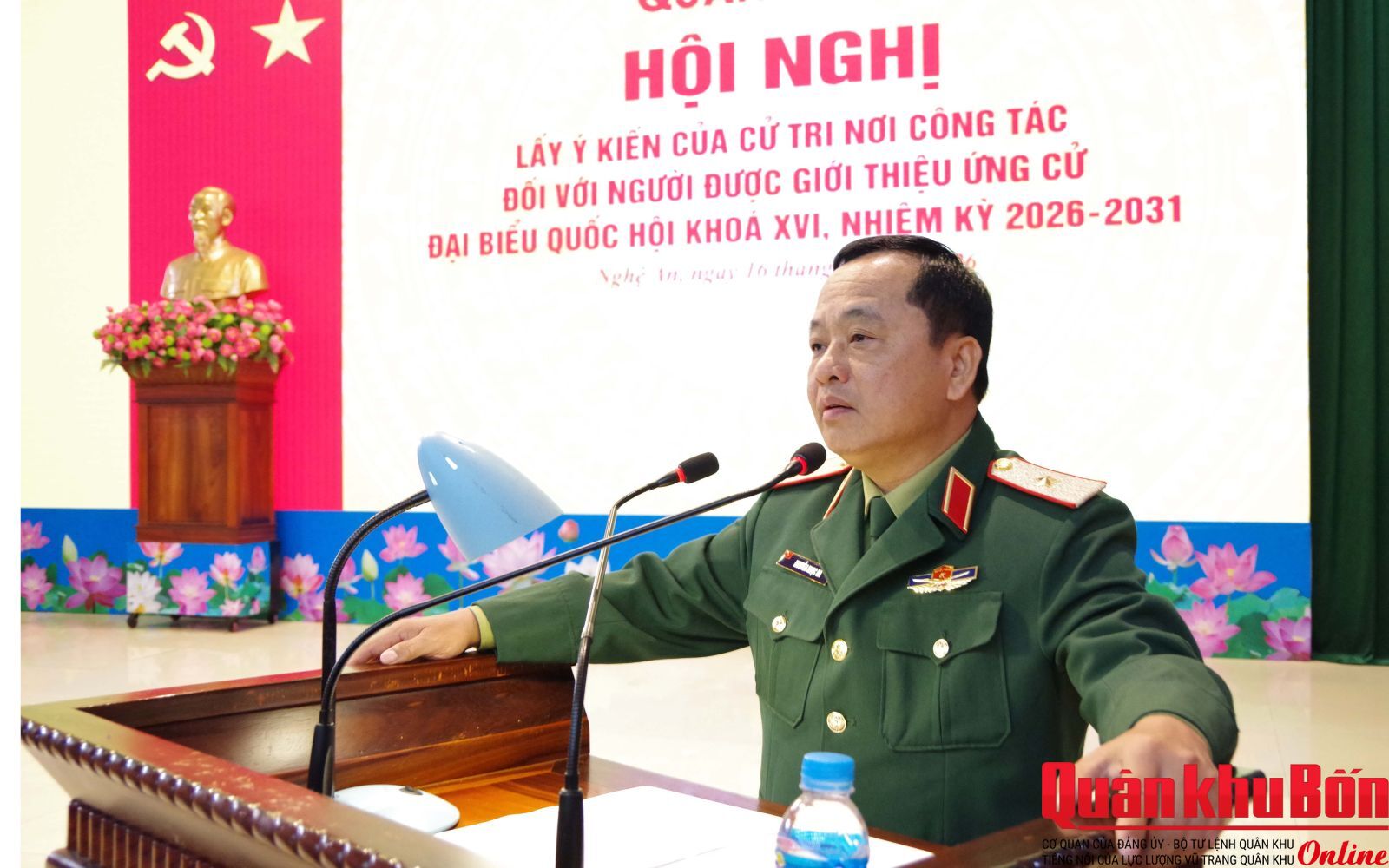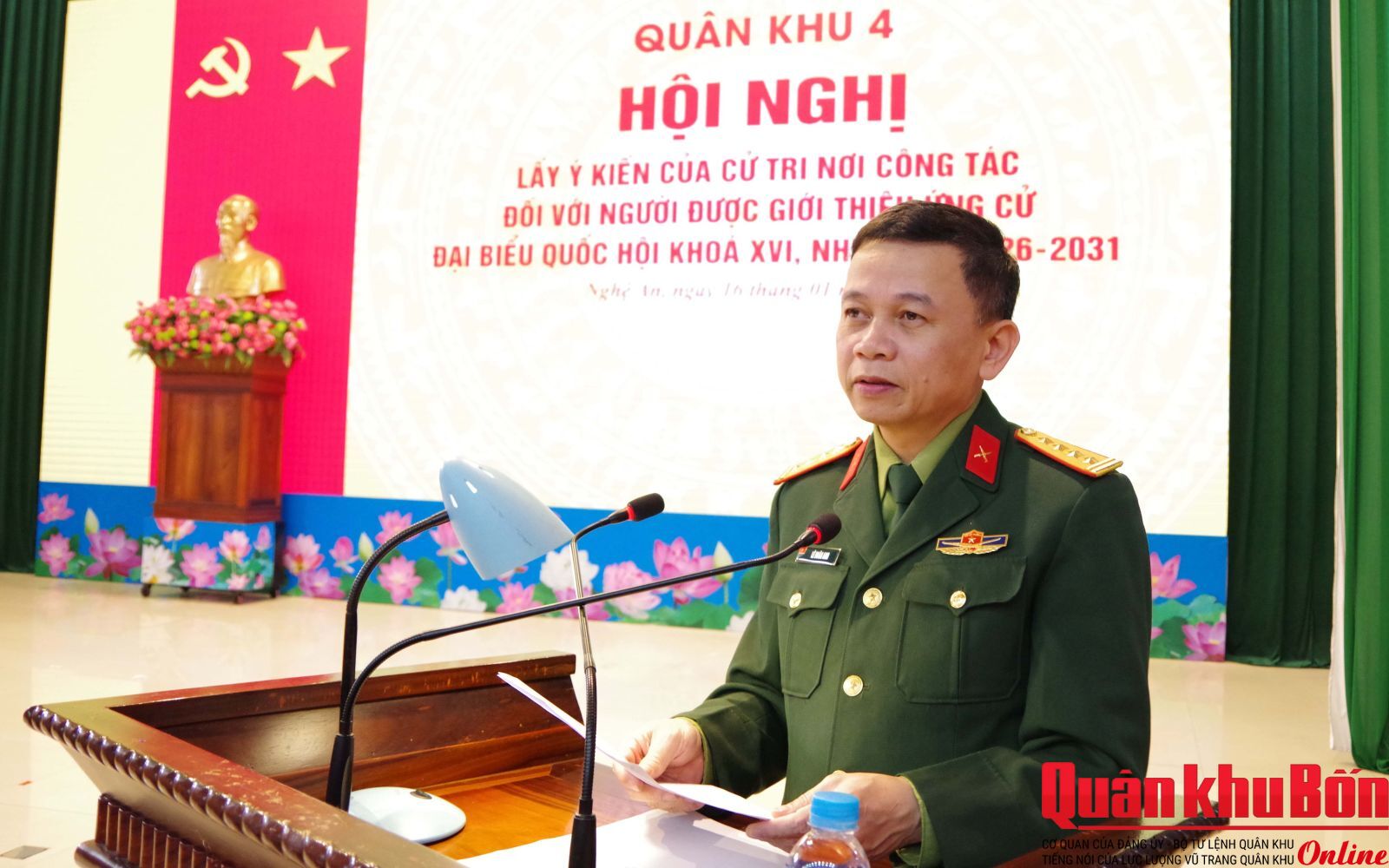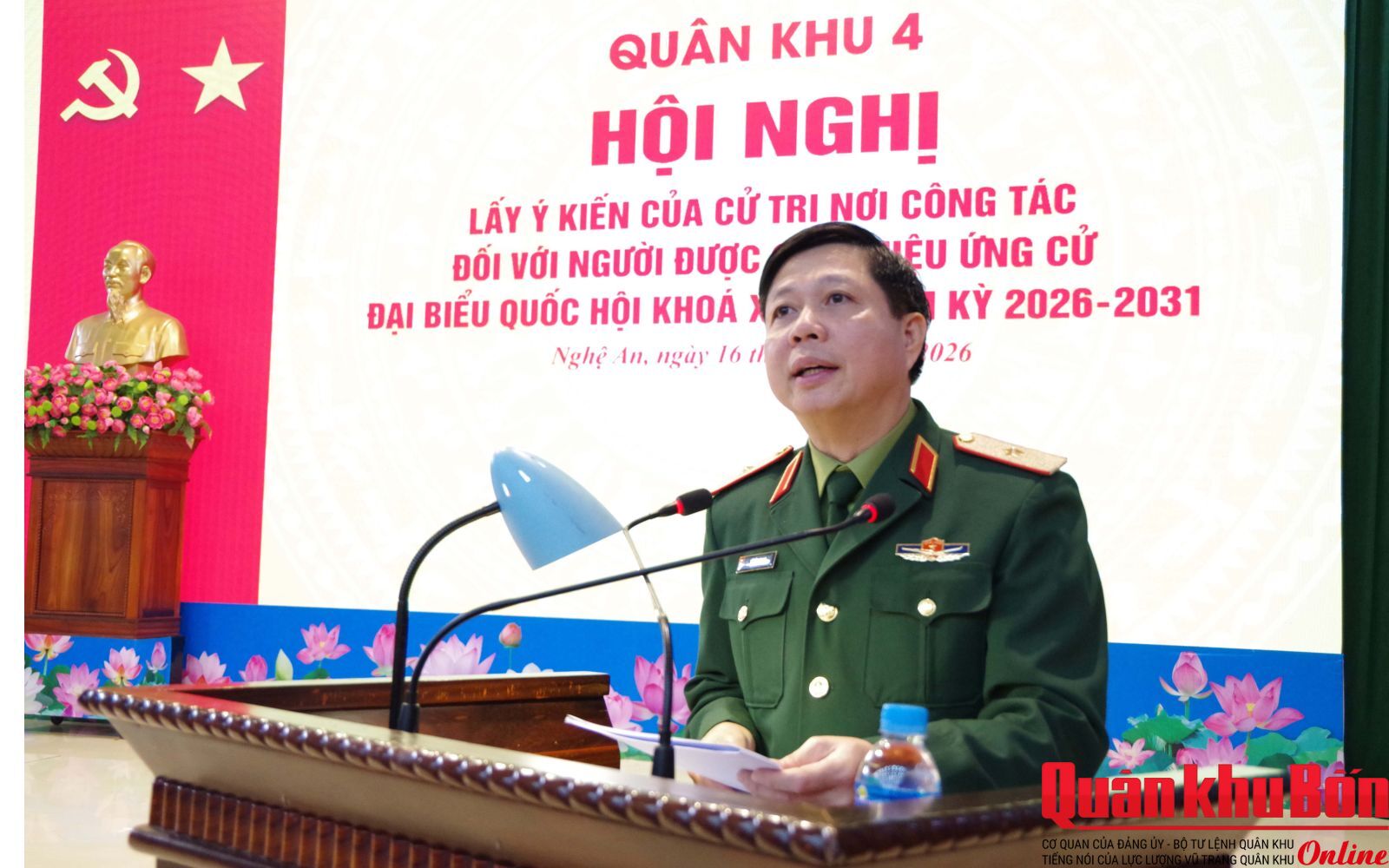 Sáng 16/1/2026, Quân khu 4 tổ chức các Hội nghị thực hiện quy trình đối với nhân sự ứng cử đại biểu Quốc hội khóa XVI, nhiệm kỳ 2026 - 2031. Thiếu tướng Đoàn Xuân Bường, Bí thư Đảng ủy, Chính ủy Quân khu chủ trì Hội nghị lãnh đạo, chỉ huy mở rộng; Thiếu tướng Lê Văn Trung, Ủy viên Ban Thường vụ Đảng ủy, Phó Chính ủy Quân khu chủ trì hội nghị lấy ý kiến của cư tri nơi công tác.