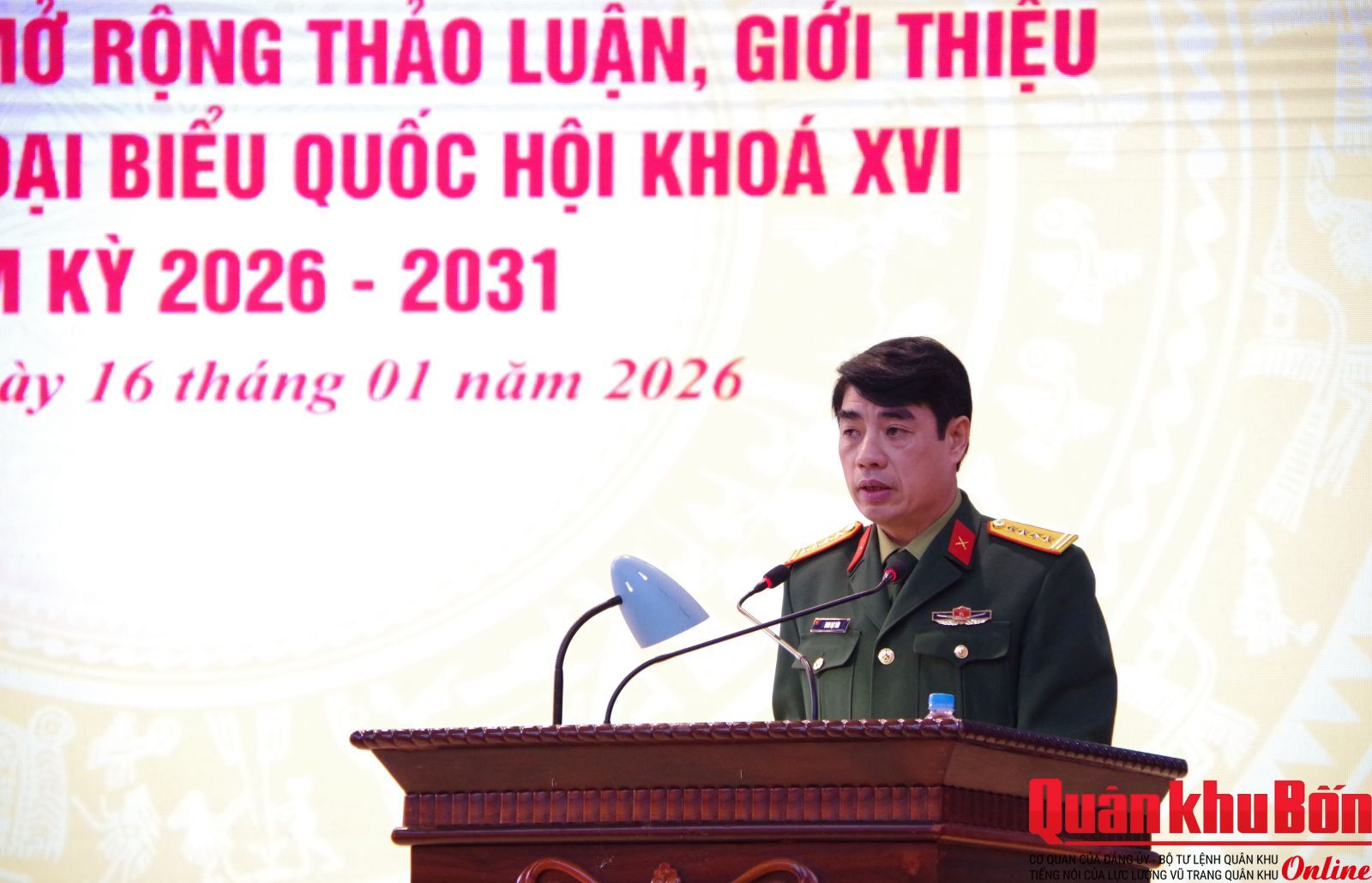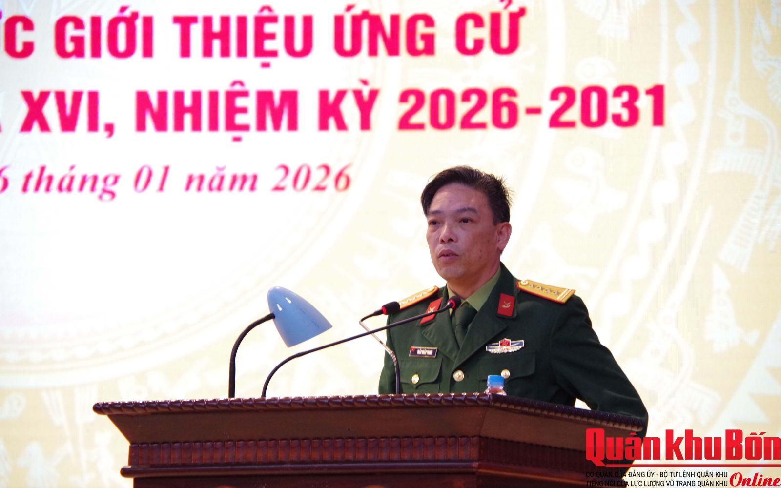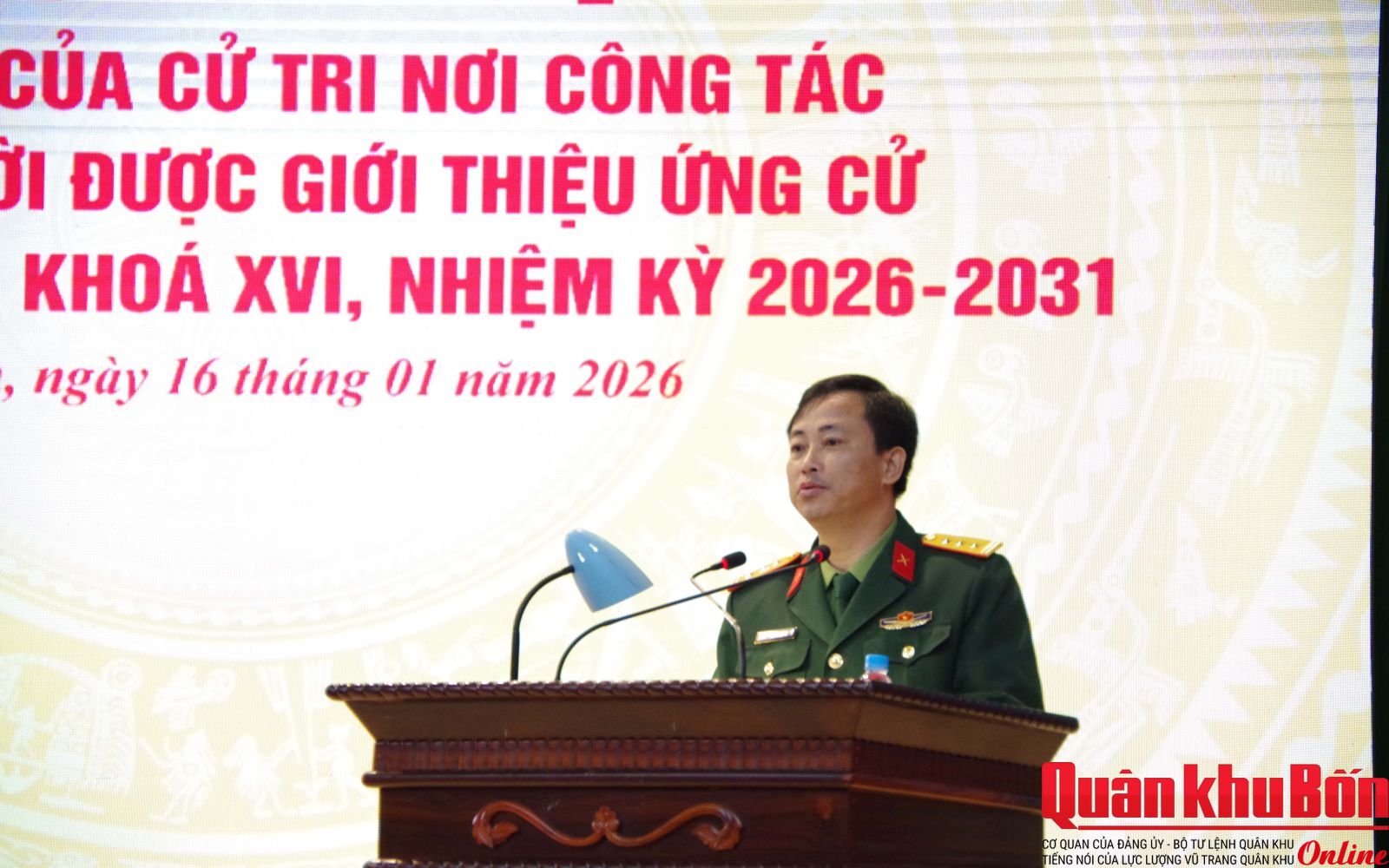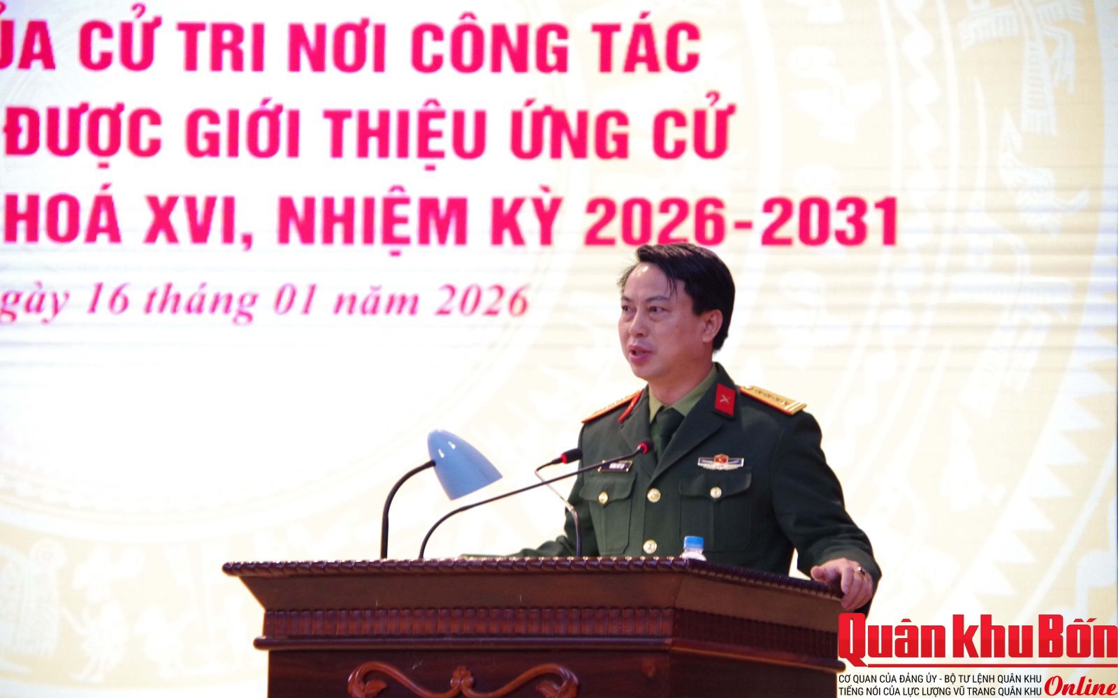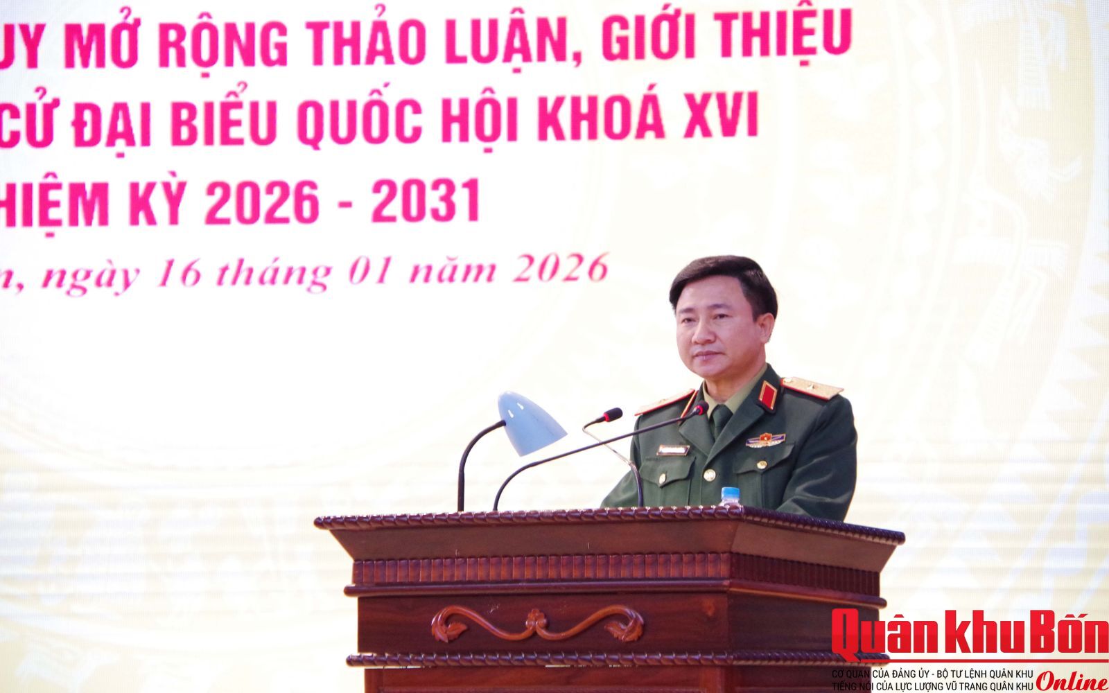 Sáng 16/1/2026, Quân khu 4 tổ chức các Hội nghị thực hiện quy trình đối với nhân sự ứng cử đại biểu Quốc hội khóa XVI, nhiệm kỳ 2026 - 2031. Thiếu tướng Đoàn Xuân Bường, Bí thư Đảng ủy, Chính ủy Quân khu chủ trì Hội nghị lãnh đạo, chỉ huy mở rộng; Thiếu tướng Lê Văn Trung, Ủy viên Ban Thường vụ Đảng ủy, Phó Chính ủy Quân khu chủ trì hội nghị lấy ý kiến của cư tri nơi công tác.