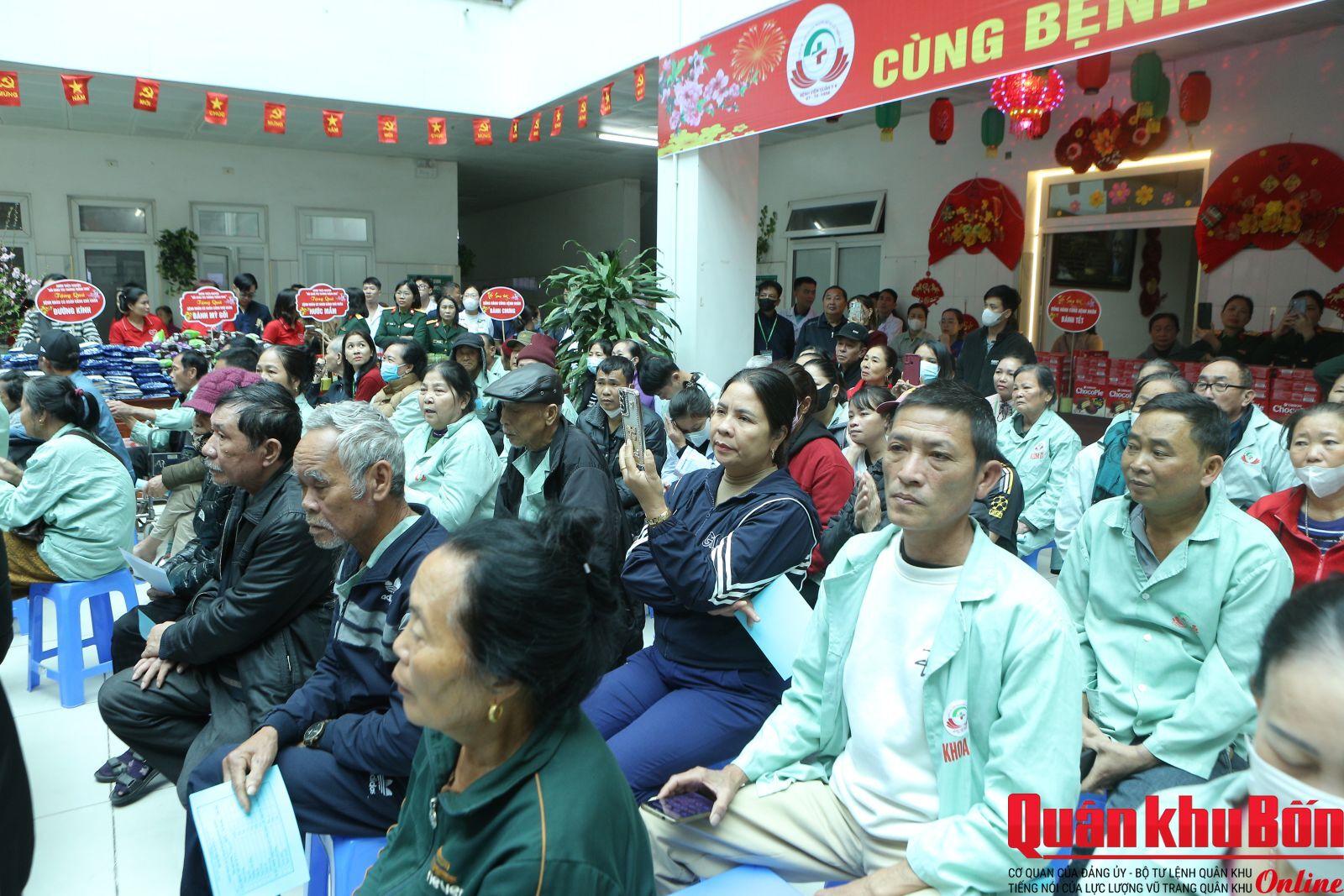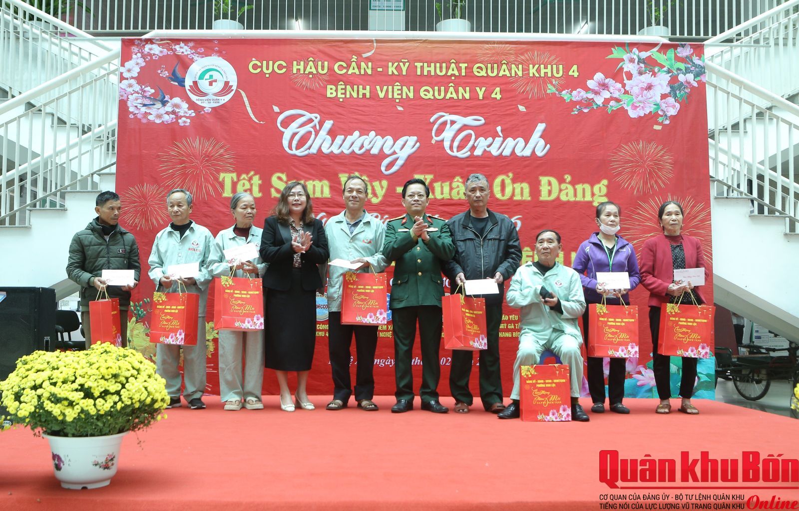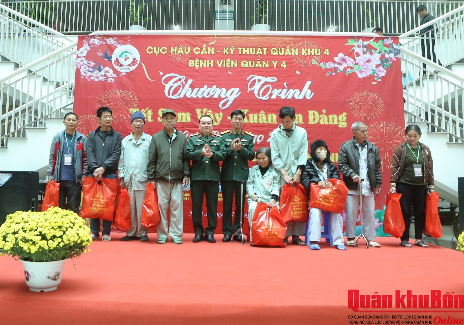 Tại chương trình, Bệnh viện Quân y 4 đã biểu dương, tri ân các nhà hảo tâm, nhóm thiện nguyện tích cực đồng hành, góp phần triển khai hiệu quả các hoạt động thiện nguyện tại Bệnh viện trong năm 2026. Dịp này, hơn 200 bệnh nhân nghèo và người nhà bệnh nhân có hoàn cảnh khó khăn đang điều trị, chăm sóc người bệnh tại Bệnh viện được thủ trưởng Cục Chính trị, Cục Hậu cần – Kỹ thuật Quân khu, Ban Giám đốc Bệnh viện và các tổ chức, cá nhân thăm hỏi, động viên, trao tặng quà Tết.
