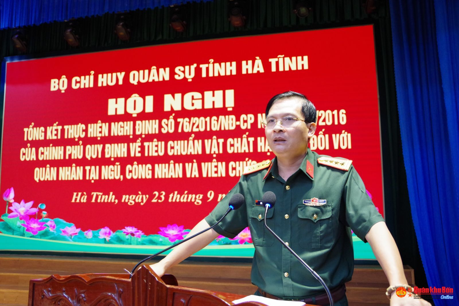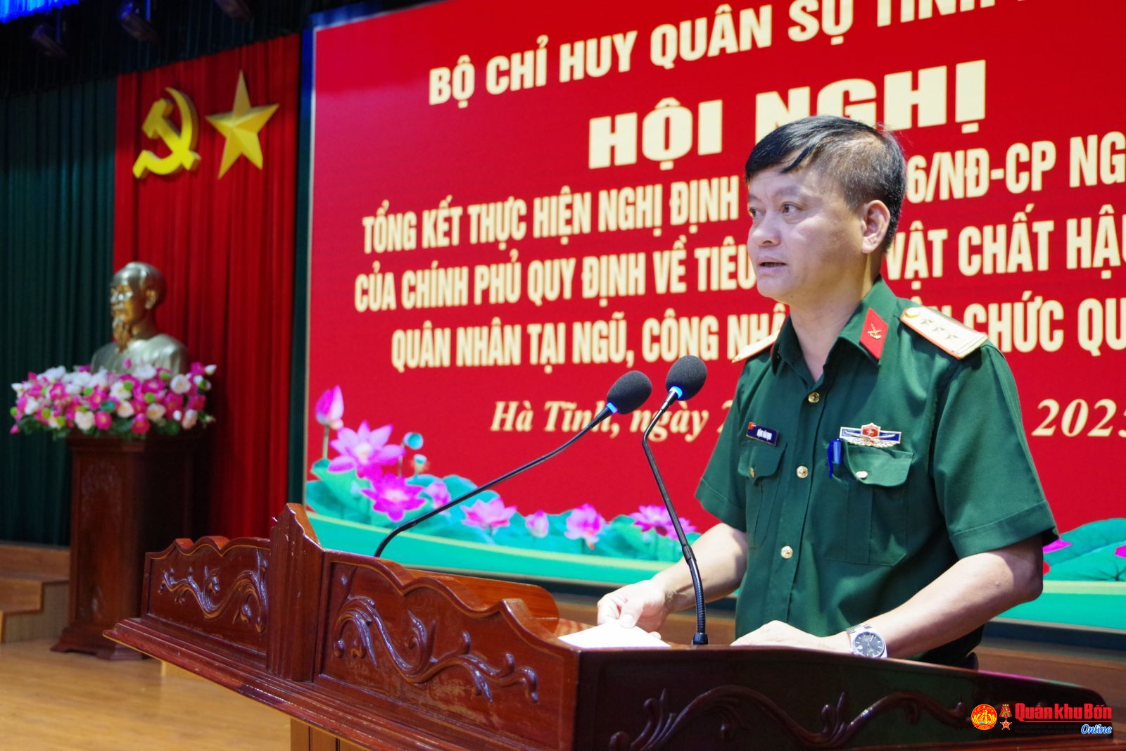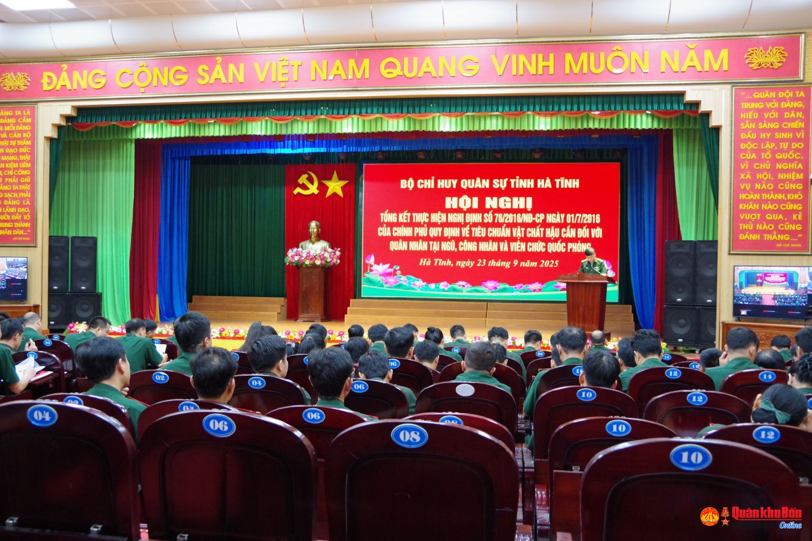 Sáng ngày 23/9/2025, Bộ Chỉ huy Quân sự (CHQS) tỉnh Hà Tĩnh tổ chức Hội nghị tổng kết thực hiện Nghị định số 76/2016/NĐ-CP ngày 1/7/2016 của Chính phủ quy định về tiêu chuẩn vật chất hậu cần đối với quân nhân tại ngũ, công nhân và viên chức quốc phòng trong Bộ Quốc phòng (gọi tắt là Nghị định 76). Đại tá Nguyễn Tú Tài, Phó Chỉ huy trưởng Bộ CHQS tỉnh chủ trì hội nghị.