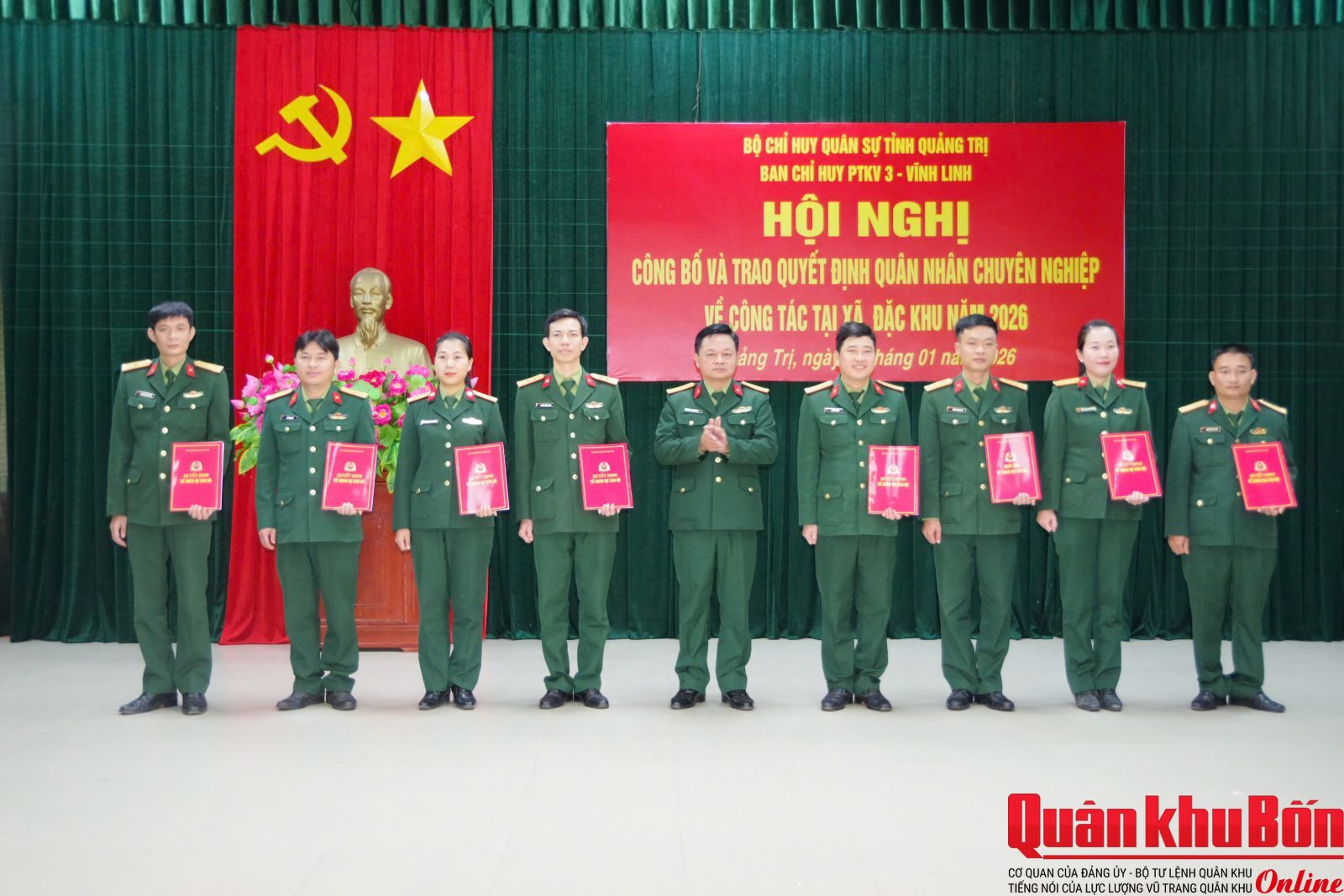 Sáng 21/1/2026, Bộ Chỉ huy Quân sự (CHQS) tỉnh Quảng Trị tổ chức hội nghị công bố và trao quyết định điều động 113 quân nhân chuyên nghiệp (QNCN) về công tác tại Ban CHQS các xã, phường và đặc khu trên địa bàn tỉnh.