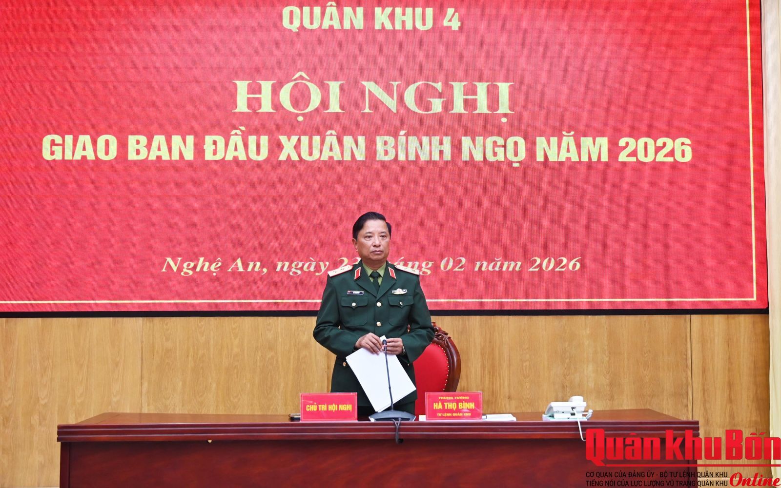 Sáng 23/2/2026, Bộ Tư lệnh Quân khu 4 tổ chức Hội nghị giao ban đầu Xuân Bính Ngọ 2026 nhằm đánh giá tình hình trước, trong và sau kỳ nghỉ Tết Nguyên đán; triển khai nhiệm vụ trọng tâm thời gian tới. Trung tướng Hà Thọ Bình, Tư lệnh Quân khu chủ trì Hội nghị.