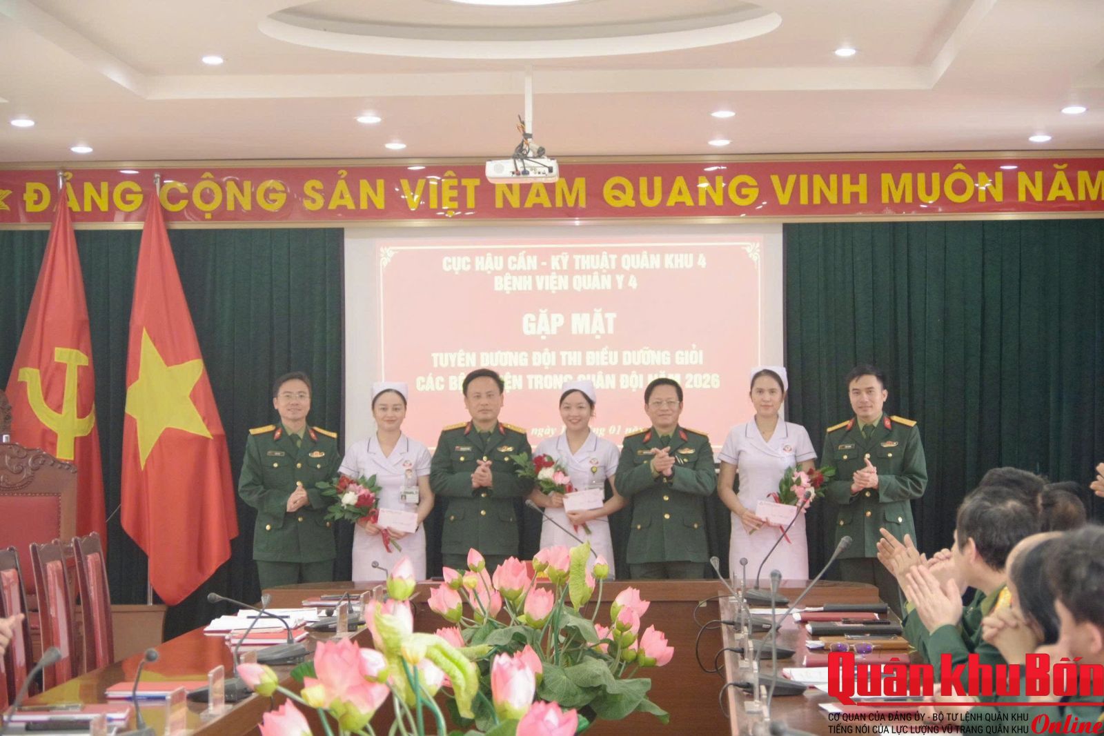 Chiều ngày 15/01/2026, Bệnh viện Quân y 4 (Cục Hậu cần Kỹ thuật Quân khu 4) tổ chức gặp mặt tuyên dương đội thi điều dưỡng giỏi Bệnh viện trong Quân đội năm 2026. Đồng chí Đại tá Nguyễn An Giang, Bí thư Đảng uỷ, Giám đốc Bệnh viện chủ trì buổi gặp mặt. Tham dự buổi gặp mặt có các đồng chí trong Thường vụ Đảng uỷ, Ban Giám đốc và lãnh đạo, chỉ huy các phòng, ban, khoa cùng lực lượng được tuyên dương.