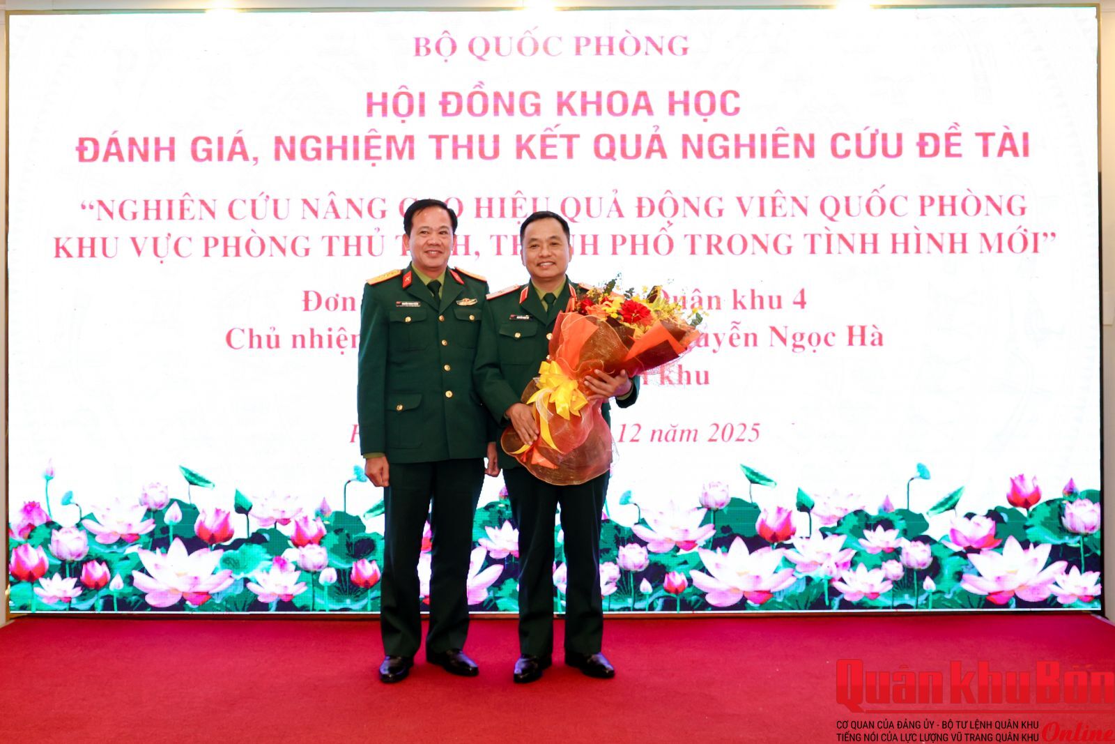 Chiều ngày 26/12/2025, tại Hà Nội, Hội đồng khoa học Bộ Quốc phòng tổ chức Hội thảo đánh giá, nghiệm thu kết quả nghiên cứu đề tài khoa học cấp Bộ Quốc phòng: “Nghiên cứu nâng cao hiệu quả động viên quốc phòng khu vực phòng thủ tỉnh, thành phố trong tình hình mới”. Trung tướng, Phó Giáo sư, Tiến sĩ Ngô Trọng Cường, Phó Giám đốc Học viện Quốc phòng, Chủ tịch Hội đồng, chủ trì phiên nghiệm thu. Thiếu tướng Nguyễn Ngọc Hà, Phó Tư lệnh Quân khu 4, Chủ nhiệm đề tài.