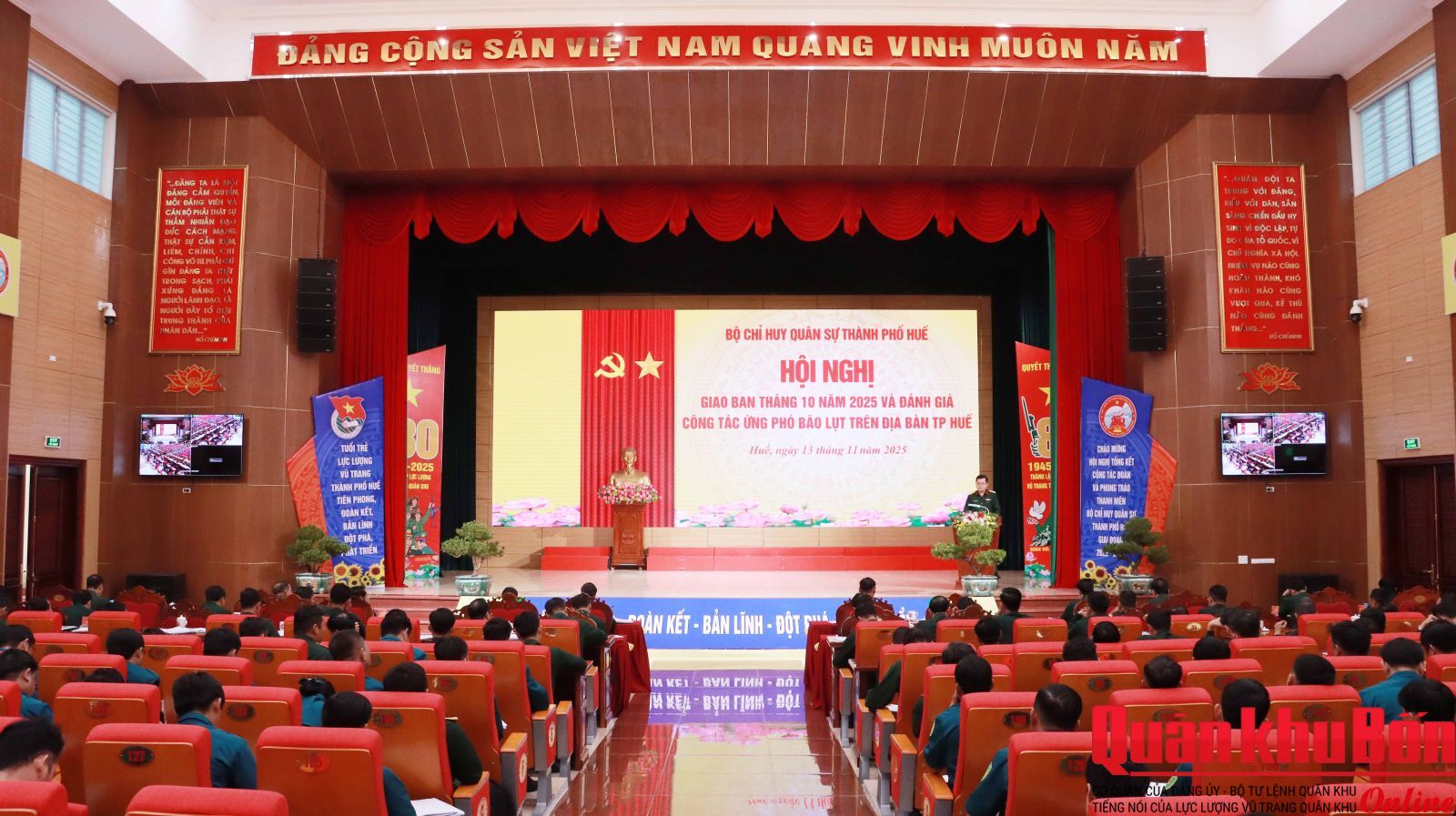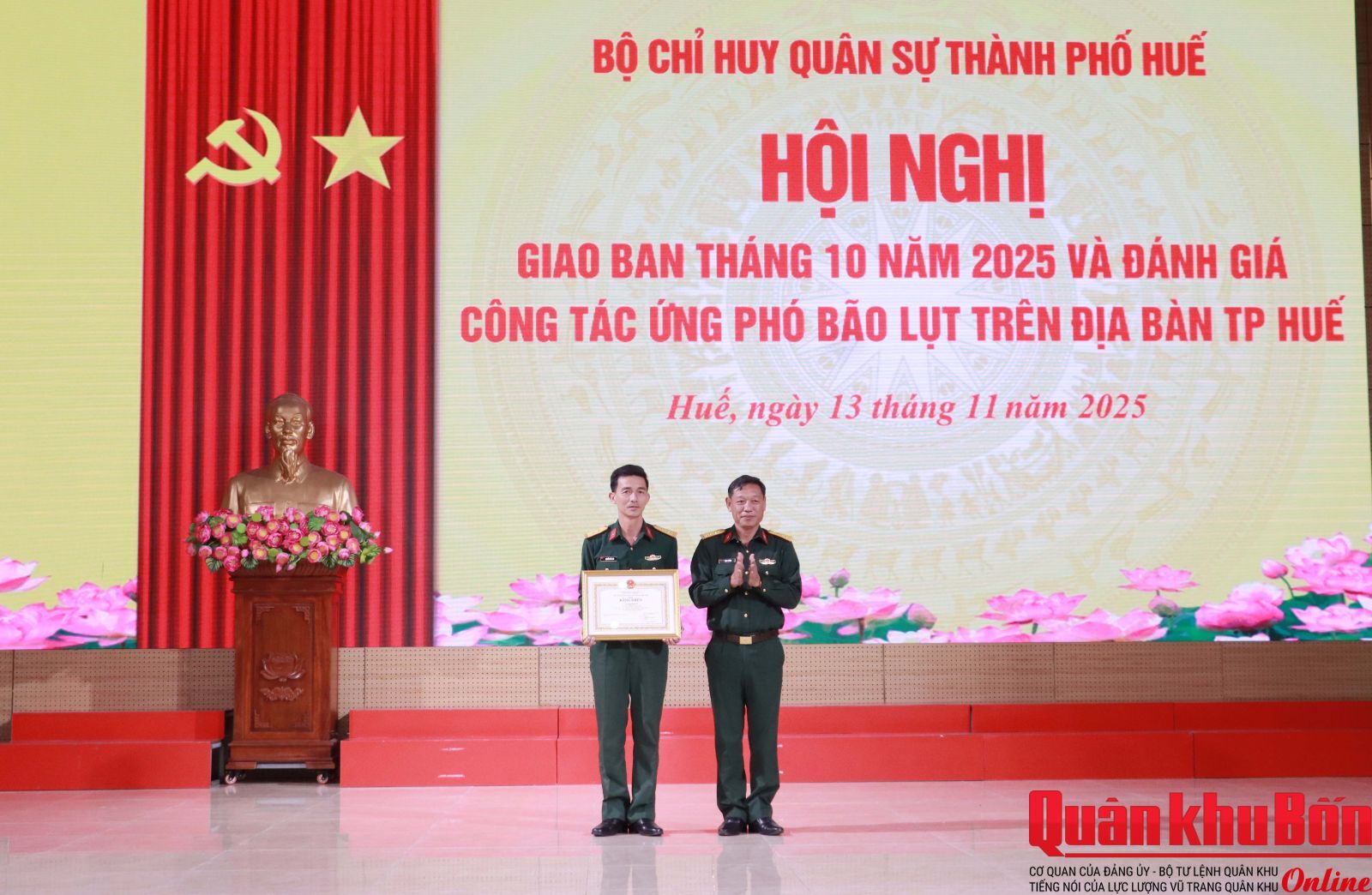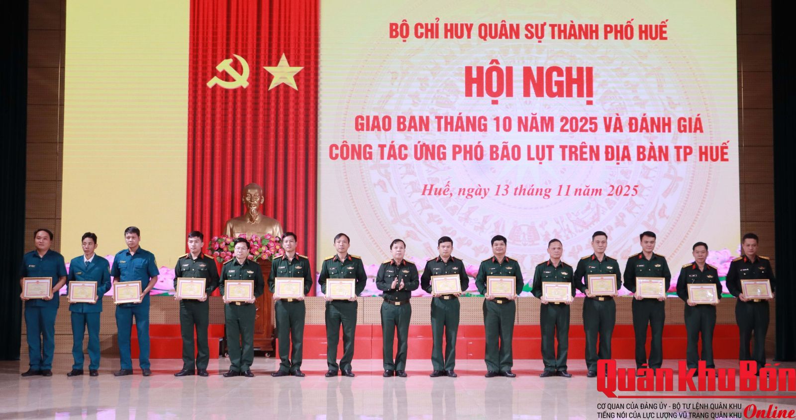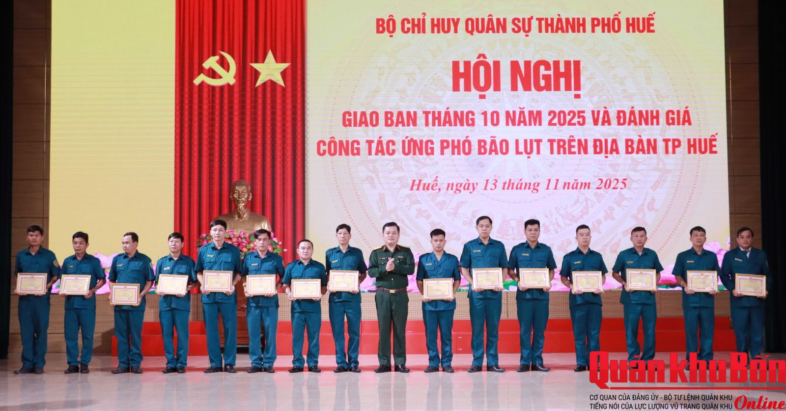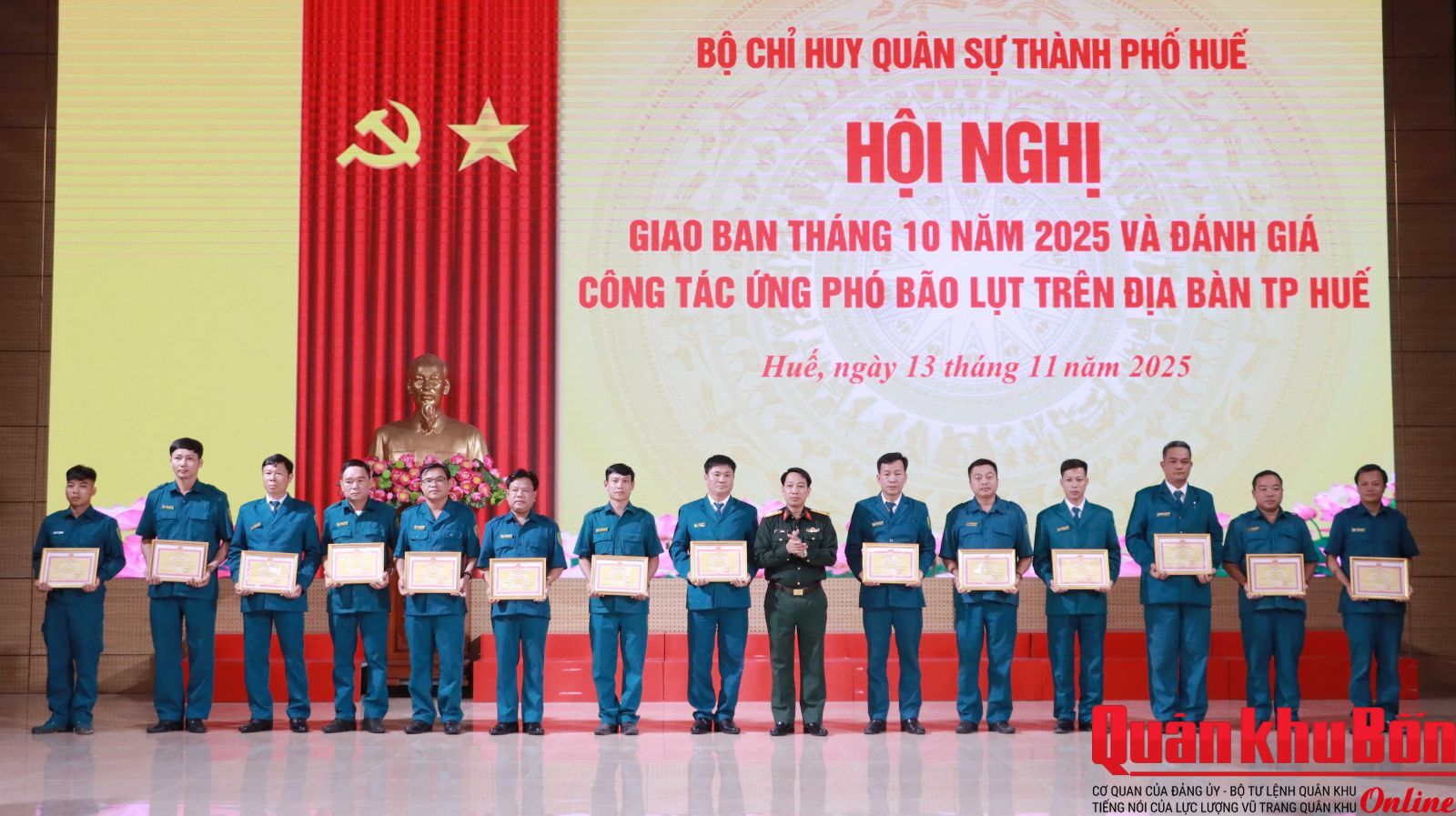 Sáng ngày 13/11/2025, Bộ Chỉ huy Quân sự (CHQS) thành phố Huế tổ chức Hội nghị giao ban, đánh giá công tác ứng phó bão lụt trên địa bàn thành phố và khen thưởng các tập thể, cá nhân có thành tích xuất sắc trong công tác phòng, chống, khắc phục hậu quả do mưa lũ năm 2025. Đại tá Phan Thắng, Ủy viên Ban Thường vụ Thành ủy, Chỉ huy trưởng Bộ CHQS thành phố Huế chủ trì hội nghị. Tham dự có Thượng tá Trương Viết Hải, Chính ủy, cùng các đồng chí trong Thủ trưởng Bộ CHQS thành phố.