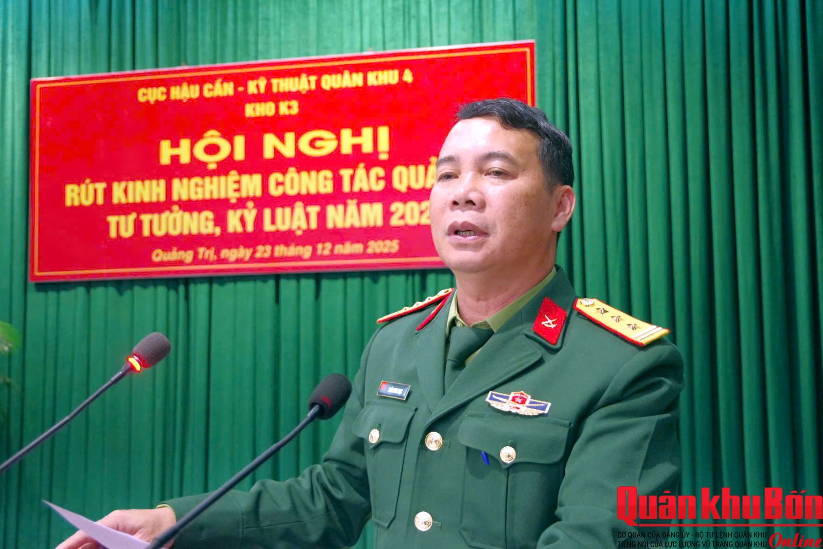Sáng 23/12/2025, Kho K3 (Cục Hậu cần - Kỹ thuật Quân khu 4) tổ chức Hội nghị rút kinh nghiệm công tác quản lý tư tưởng, kỷ luật năm 2025. Thượng tá Đoàn Minh Ngọc, Bí thư Đảng ủy, Chính trị viên Kho chủ trì hội nghị. Dự hội nghị có các đồng chí trong Thường vụ Đảng ủy, chỉ huy Kho; đại diện các tổ chức quần chúng, cán bộ cấp đại đội, tương đương trở lên và trợ lý các cơ quan.