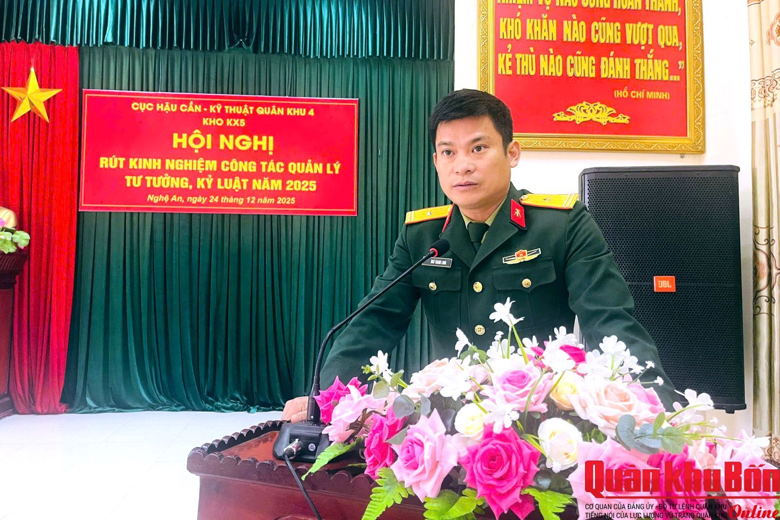 Sáng ngày 24/12/2025, Kho KX5, Cục Hậu cần - Kỹ thuật Quân khu 4 tổ chức Hội nghị rút kinh nghiệm công tác quản lý tư tưởng, kỷ luật năm 2025. Thượng úy Nguyễn Tiến Dũng, Bí thư Đảng ủy, Chính trị viên Kho chủ trì Hội nghị. Dự, theo dõi Hội nghị có đại biểu Phòng Chính trị (Cục Hậu cần - Kỹ thuật). Tham dự Hội nghị có các đồng chí trong Đảng ủy, chỉ huy Kho; cùng toàn thể cán bộ, quân nhân chuyên nghiệp, hạ sĩ quan-binh sĩ trong đơn vị.
