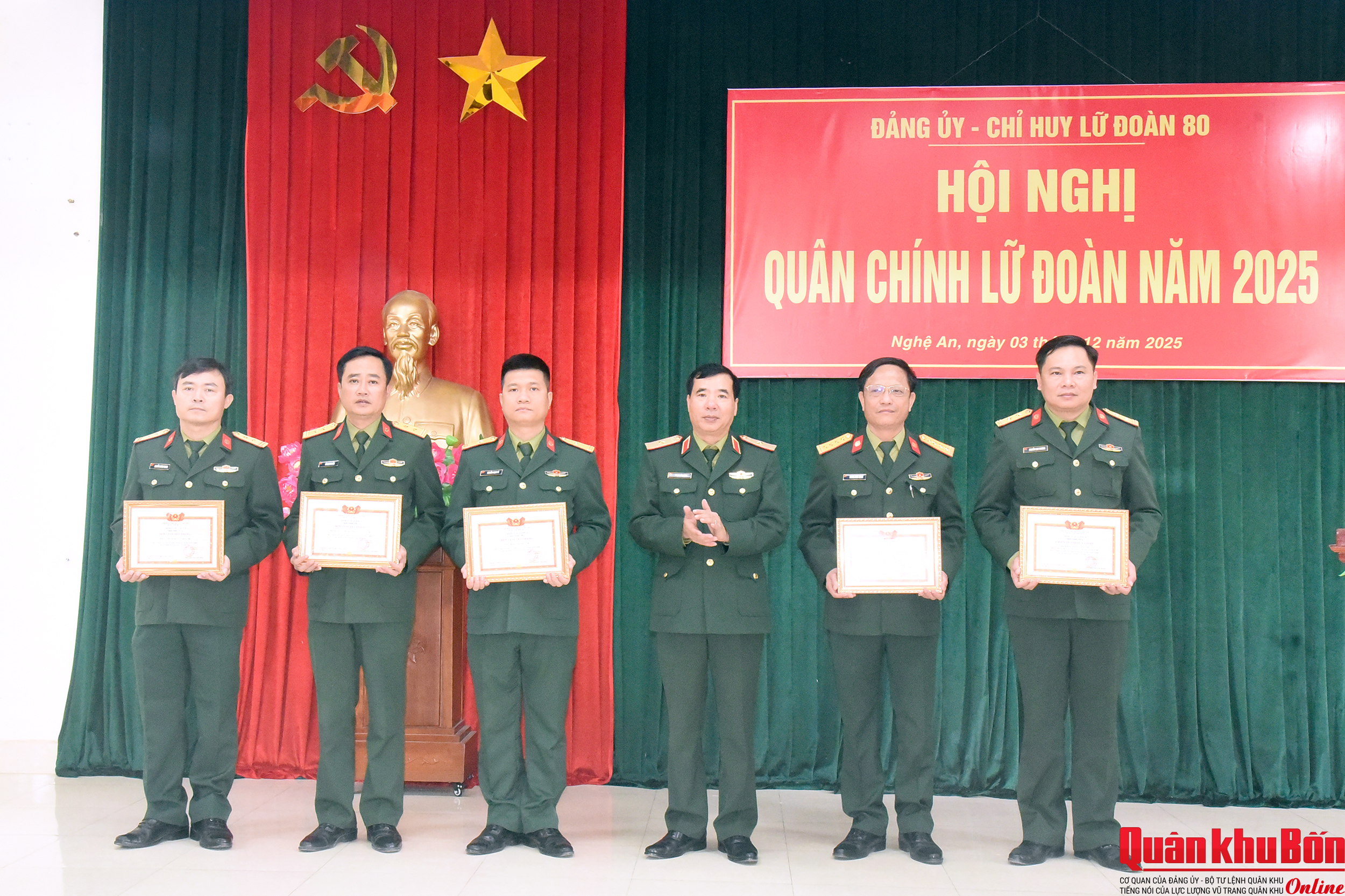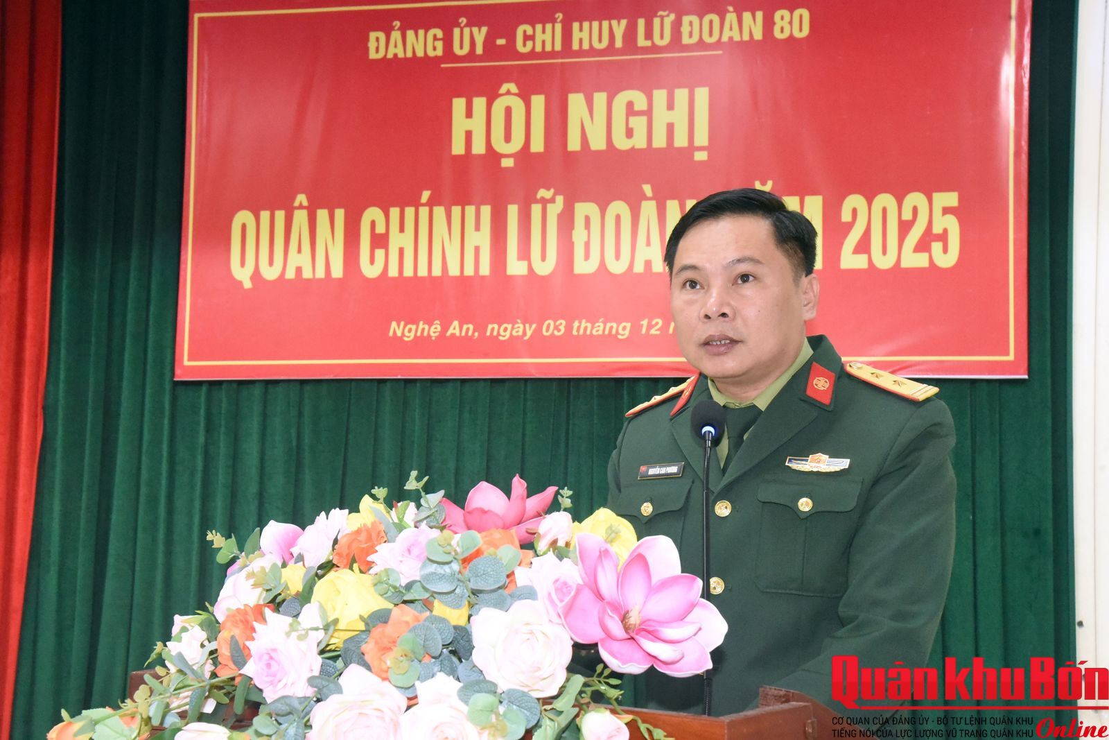 Sáng ngày 3/12/2025, Lữ đoàn Thông tin 80 (Quân khu 4) tổ chức Hội nghị Quân chính năm 2025 nhằm đánh giá kết quả thực hiện nhiệm vụ trong năm và đề ra phương hướng, nhiệm vụ năm 2026. Thiếu tướng Phạm Văn Đông, Ủy viên Ban Thường vụ Đảng ủy, Chủ nhiệm Chính trị Quân khu dự, chỉ đạo. Dự Hội nghị có Đại tá Nguyễn Bình Nguyên, Trưởng phòng Thông tin Quân khu; Đại tá Lê Kiên Cường, Trưởng phòng Bảo vệ An ninh Quân khu. Đại tá Hoàng Đình Thắng, Lữ đoàn trưởng Lữ đoàn Thông tin 80 chủ trì Hội nghị.