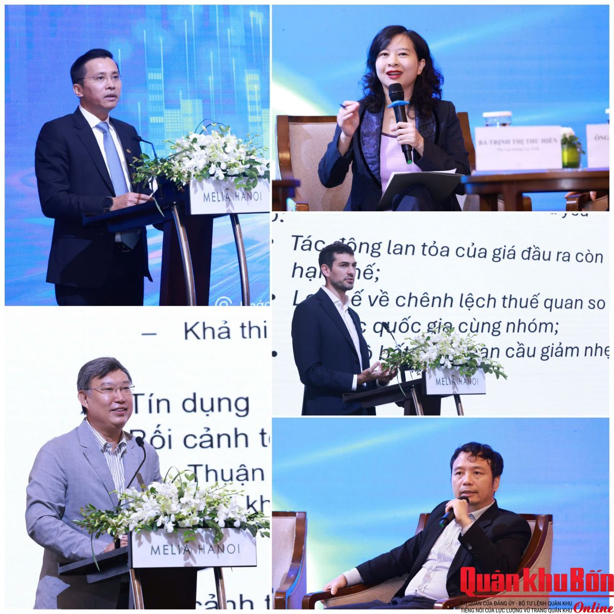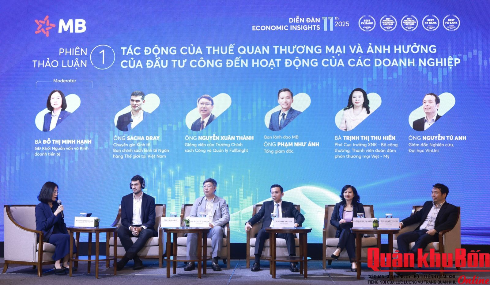 Phiên thảo luận 1 với chủ đề “Tác động của Thuế quan thương mại và Đầu tư công đến hoạt động của doanh nghiệp” có sự góp mặt của Bà Trịnh Thị Thu Hiền - Phó Cục trưởng Cục Xuất nhập khẩu - Bộ Công thương, TS. Nguyễn Tú Anh – Giám đốc nghiên cứu - Đại học VinUni, TS. Nguyễn Xuân Thành, chuyên gia kinh tế World Bank và Ban lãnh đạo MB. Các chuyên gia đã thảo luận sâu về các kịch bản thay đổi thuế quan, tác động đến từng ngành xuất nhập khẩu trọng điểm; đồng thời phân tích vai trò của đầu tư công như một động lực tăng trưởng và đề xuất cải cách thể chế nhằm thúc đẩy khu vực tư nhân.