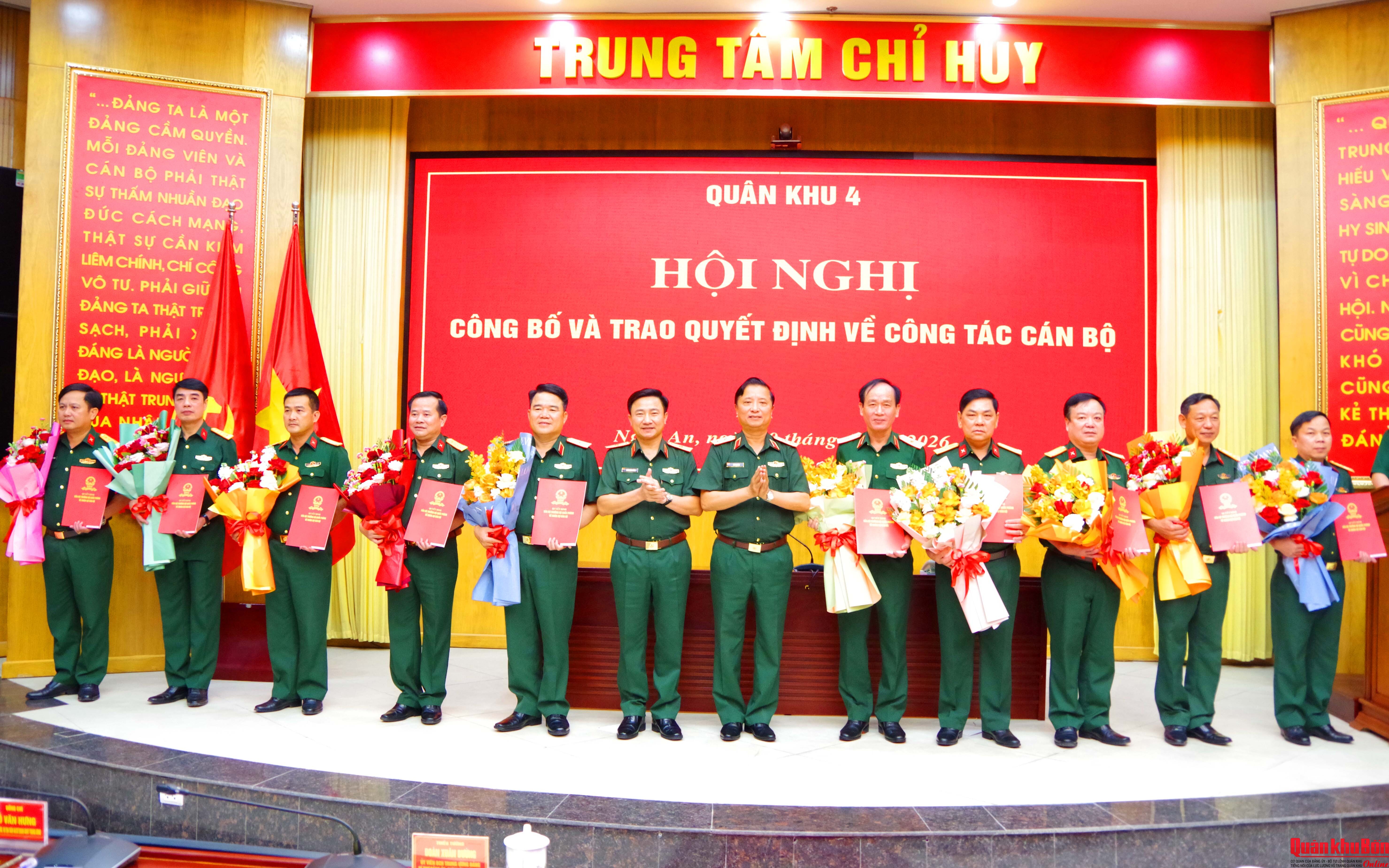 Hội nghị cũng nghe công bố và trao quyết định của Bộ trưởng Bộ Quốc phòng về bổ nhiệm lại Đại tá Phạm Văn Dũng, Phó Tham mưu trưởng Quân khu 4; điều động bổ nhiệm có thời hạn 8 đồng chí: Đại tá Đinh Bạt Văn, Chỉ huy trưởng Bộ CHQS tỉnh Nghệ An giữ chức Chỉ huy trưởng Bộ CHQS tỉnh Thanh Hóa; Thiếu tướng Vũ Văn Tùng, Chỉ huy trưởng Bộ CHQS tỉnh Thanh Hóa giữ chức Chỉ huy trưởng Bộ CHQS tỉnh Nghệ An; Đại tá Nguyễn Xuân Thắng, Chỉ huy trưởng Bộ CHQS tỉnh Hà Tĩnh giữ chức Phó Tham mưu trưởng Quân khu; Đại tá Hoàng Xuân Đông, Phó Chỉ huy trưởng Bộ CHQS tỉnh Quảng Trị giữ chức Chỉ huy trưởng Bộ CHQS tỉnh Hà Tĩnh; Đại tá Đoàn Sinh Hòa, Chỉ huy trưởng Bộ CHQS tỉnh Quảng Trị giữ chức Chỉ huy trưởng Bộ CHQS thành phố Huế; Đại tá Lê Hồng Việt, Chính ủy Bộ CHQS tỉnh Quảng Trị giữ chức Chính ủy Bộ CHQS thành phố Huế; Đại tá Phan Thắng, Chỉ huy trưởng Bộ CHQS thành phố Huế giữ chức Chỉ huy trưởng Bộ CHQS tỉnh Quảng Trị; Đại tá Trương Viết Hải, Chính ủy Bộ CHQS thành phố Huế giữ chức Chính ủy Bộ CHQS tỉnh Quảng Trị.