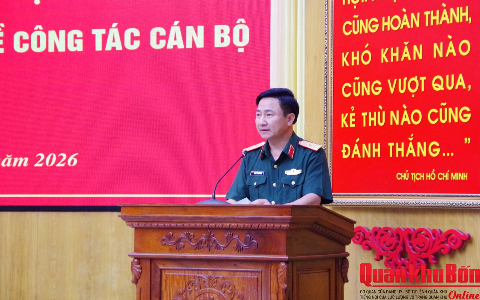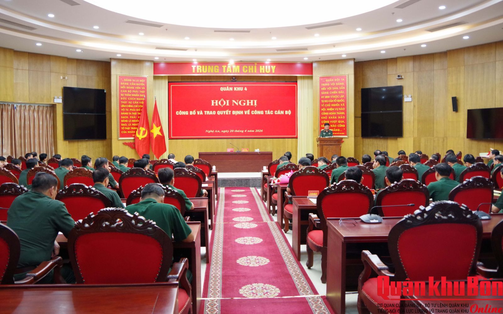 Chiều ngày 20/4/2026, Quân khu 4 tổ chức Hội nghị công bố, trao quyết định về công tác cán bộ. Đồng chí Đỗ Văn Hưng, Phó Vụ trưởng, Vụ Địa bàn IA, Cơ quan Ủy ban Kiểm tra Trung ương và đại biểu của Ủy ban Kiểm tra Quân ủy Trung ương dự Hội nghị.