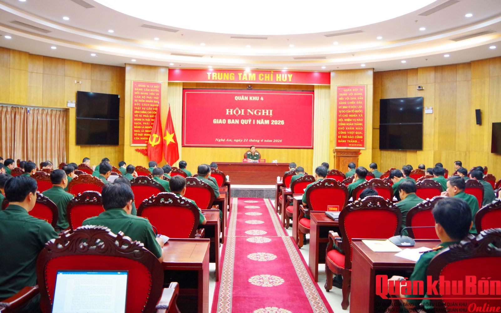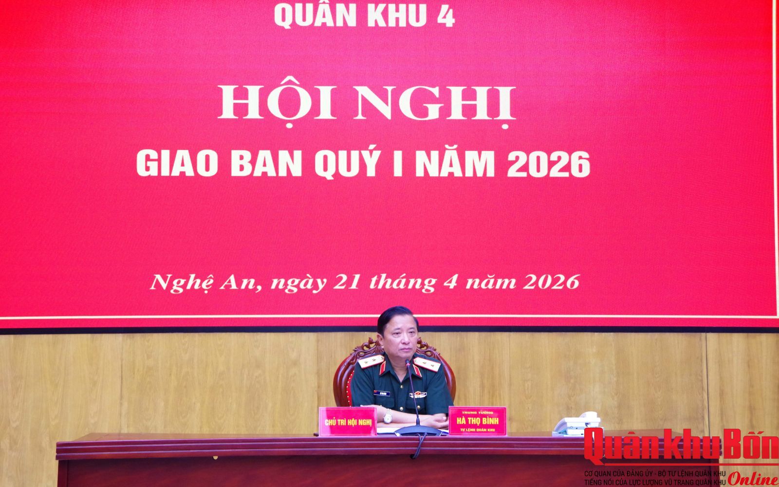 Sáng 21/4/2026, Quân khu 4 tổ chức Hội nghị giáo ban Quý I năm 2026. Trung tướng Hà Thọ Bình, Tư lệnh Quân khu chủ trì Hội nghị. Tham dự Hội nghị có các đồng chí trong Thường vụ Đảng ủy, Bộ Tư lệnh Quân khu; các cơ quan Quân khu và đơn vị trực thuộc.
