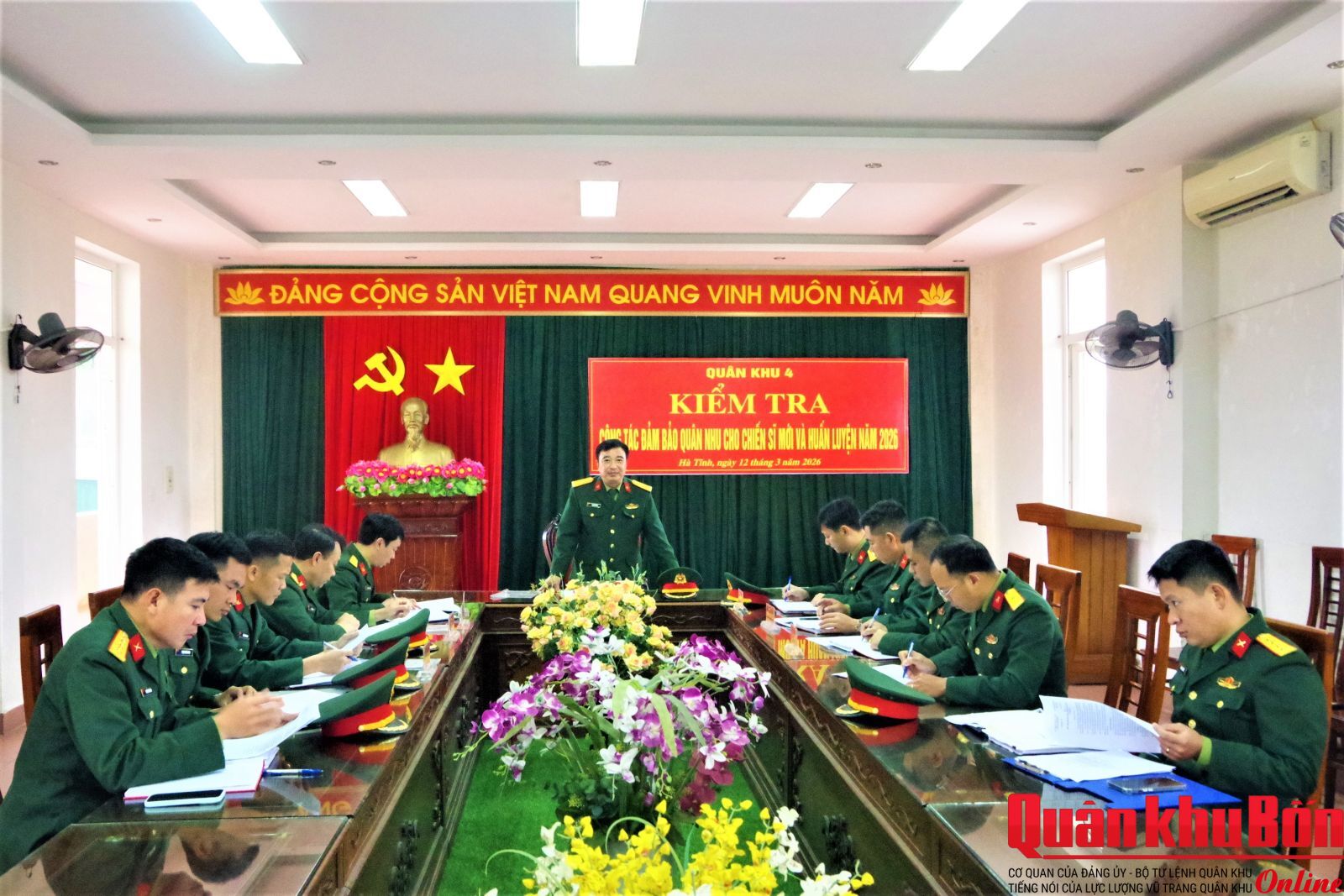 Từ ngày 6 đến 12/3/2026, đoàn công tác Quân khu 4 do Đại tá Đinh Viết Liệu, Trưởng phòng Quân nhu, Cục Hậu cần - Kỹ thuật làm trưởng đoàn đã tiến hành kiểm tra công tác bảo đảm quân nhu cho nhiệm vụ sẵn sàng chiến đấu, đón nhận chiến sĩ mới và ra quân huấn luyện năm 2026 tại các đơn vị: Lữ đoàn Công binh 414, Lữ đoàn Thông tin 80, Lữ đoàn Phòng không 283, Sư đoàn 324, Sư đoàn 341; Sư đoàn 968, Bộ CHQS các tỉnh Thanh Hóa, Nghệ An, Hà Tĩnh, Quảng trị và thành phố Huế.