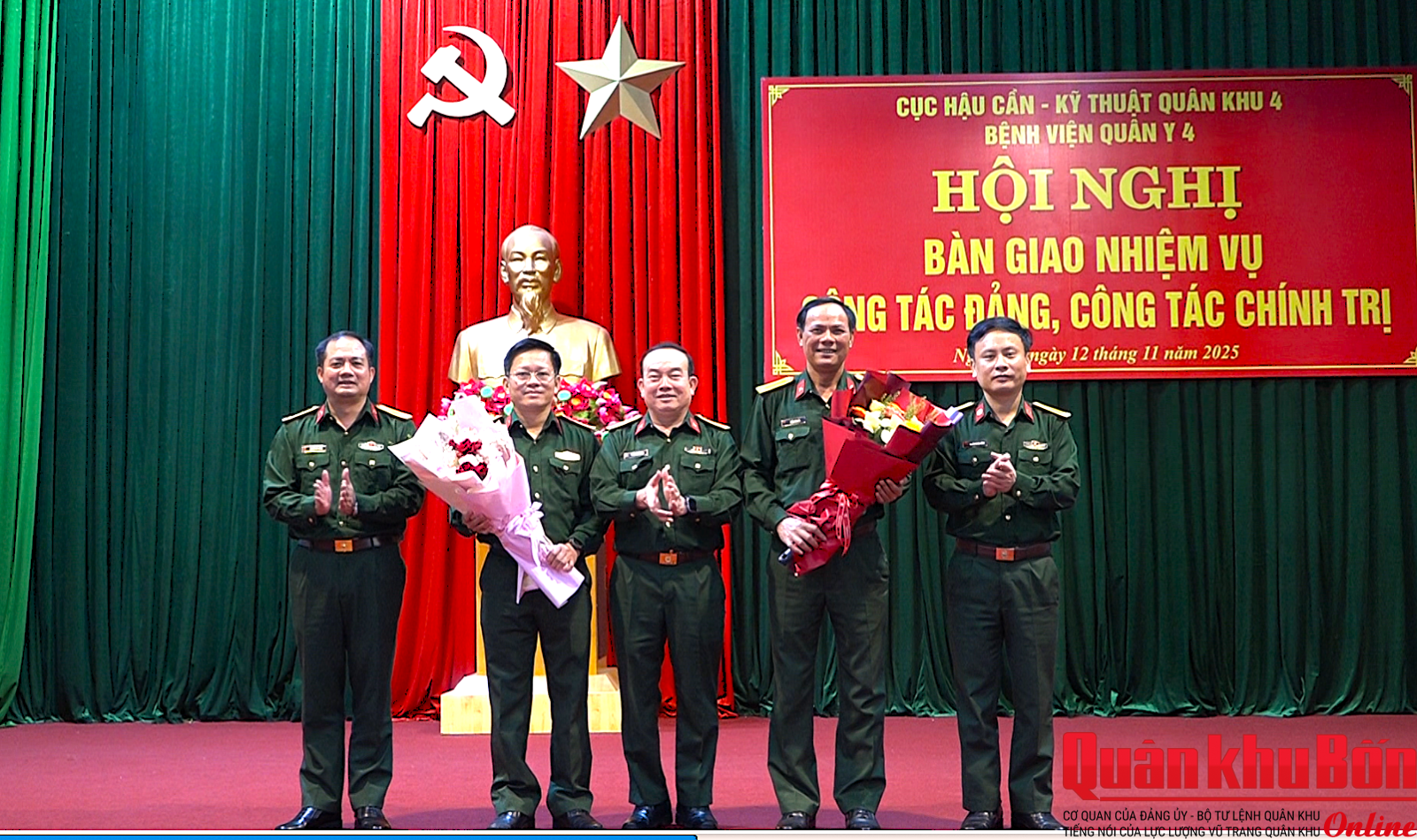 Sáng ngày 12/11/2025, Bệnh viện Quân y 4 (Cục Hậu cần – Kỹ thuật Quân khu 4) tổ chức Hội nghị bàn giao nhiệm vụ công tác đảng, công tác chính trị Bệnh viện. Đại tá Phan Gia Thuận, Bí thư Đảng ủy, Chính ủy Cục Hậu cần - Kỹ thuật Quân khu 4 chủ trì và phát biểu chỉ đạo. Tham dự còn có đại diện các Phòng: Tham mưu, Chính trị và Quân y (Cục Hậu cần – Kỹ thuật); các đồng chí trong Thường vụ, Đảng ủy, Ban giam đốc; lãnh đạo, chỉ huy các Phòng, Khoa, Ban trong toàn Bệnh viện.