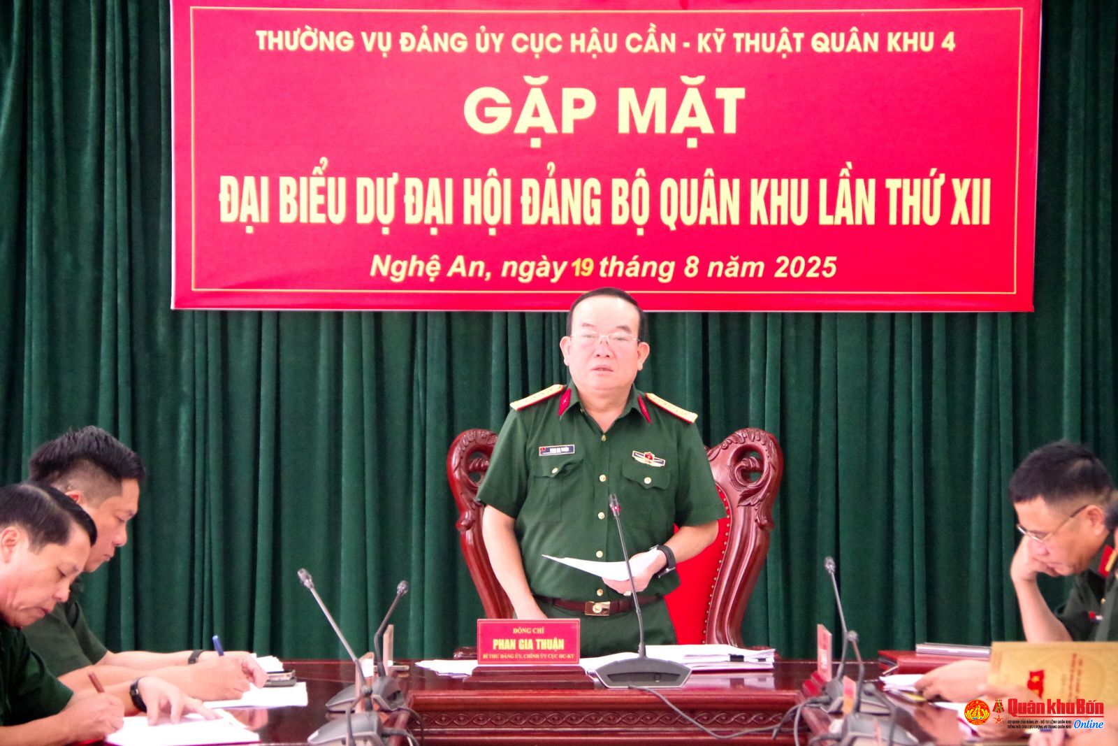 Theo kế hoạch, Đại hội đại biểu Đảng bộ Quân khu 4 lần thứ XII, nhiệm kỳ 2025 – 2030 sẽ diễn ra từ ngày 20 đến ngày 22/8/2025. Đoàn đại biểu Cục Hậu cần – Kỹ thuật tham dự Đại hội có 35 đồng chí, do Đại tá Phan Gia Thuận, Bí thư Đảng ủy, Chính ủy Cục làm đoàn trưởng. Tại buổi gặp mặt, Đại tá Hà Huy Hoàng, Ủy viên Thường vụ Đảng ủy, Chủ nhiệm Chính trị thông báo quyết định về việc triệu tập và thành lập các đoàn Đại biểu dự đại hội Đại biểu Đảng bộ Quân khu 4 lần thứ XII, nhiệm kỳ 2025 – 2030.