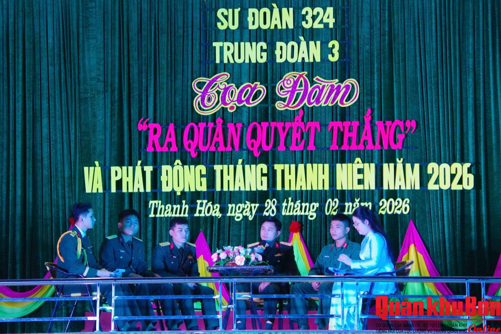Tối 28/2/2026, các trung đoàn trực thuộc Sư đoàn 324 (Quân khu 4) tổ chức chương trình giao lưu, tọa đàm “Ra quân Quyết thắng”, kết hợp phát động Tháng Thanh niên năm 2026. Chương trình diễn ra trong không khí sôi nổi, thể hiện rõ quyết tâm chính trị và khí thế thi đua của cán bộ, chiến sĩ bước vào năm huấn luyện mới.