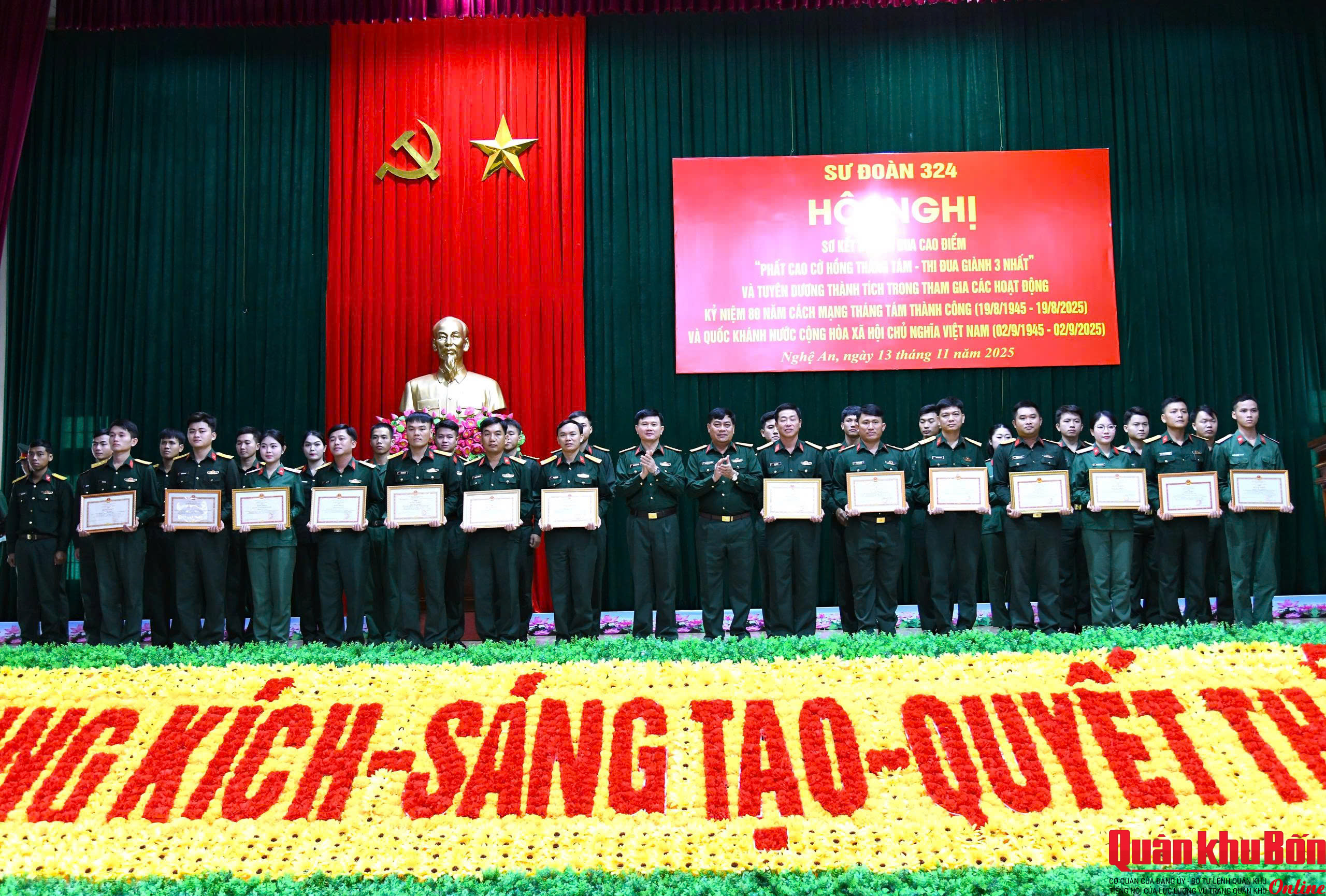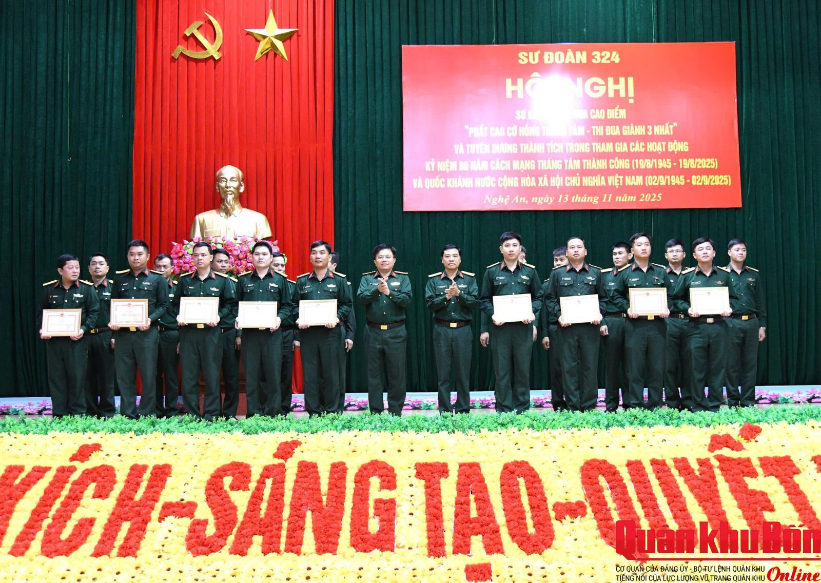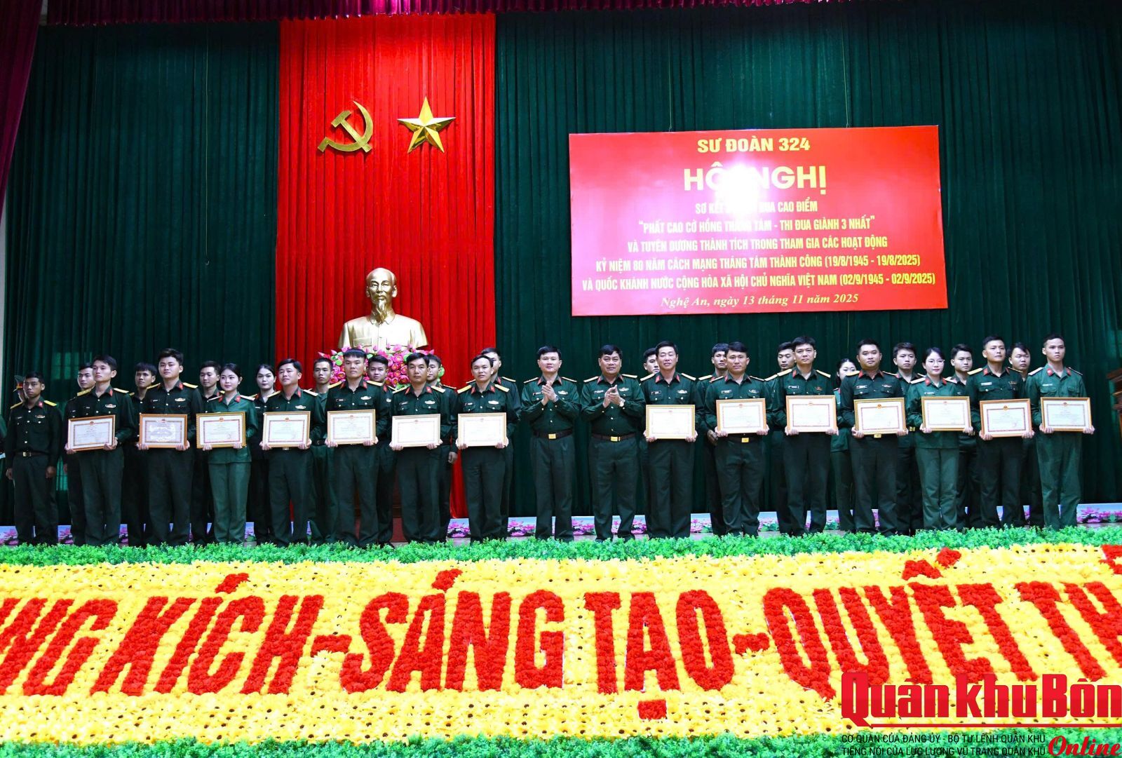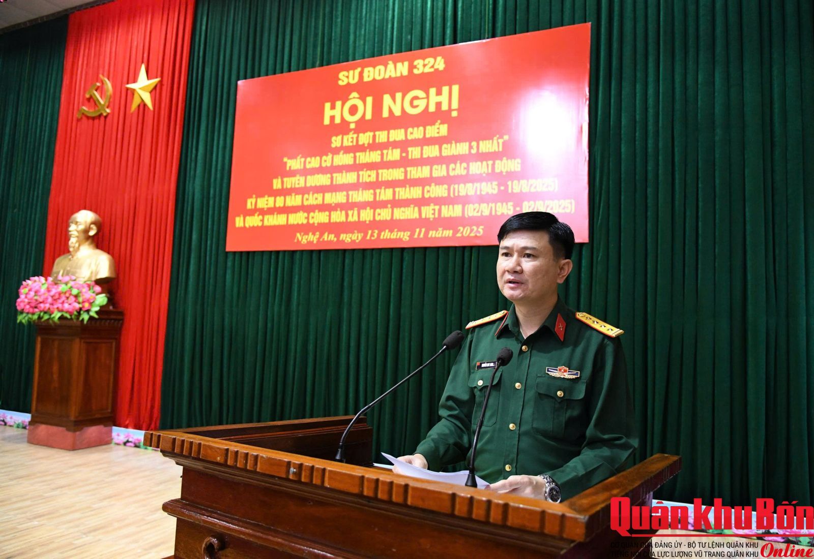 Sáng ngày 13/11/2025, Sư đoàn 324 tổ chức Hội nghị sơ kết đợt thi đua cao điểm “Phất cao cờ hồng tháng Tám - Thi đua giành 3 nhất”, tuyên dương, khen thưởng các tập thể, cá nhân có thành tích xuất sắc trong tham gia các hoạt động kỷ niệm 80 năm Cách mạng Tháng Tám và Quốc khánh nước Cộng hòa xã hội chủ nghĩa Việt Nam (2/9/1945 - 2/9/2025). Dự và chủ trì Hội nghị có đồng chí Đại tá Nguyễn Huy Long, Bí thư Đảng ủy, Chính ủy Sư đoàn, Chủ tịch Hội đồng Thi đua - Khen thưởng Sư đoàn; đồng chí Đại tá Nguyễn Thao Trường, Phó Bí thư Đảng ủy, Sư đoàn trưởng, Phó Chủ tịch Hội đồng Thi đua - Khen thưởng Sư đoàn.