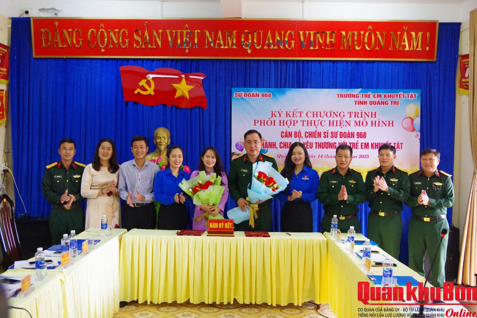 Ngày 14/11/2025, Sư đoàn 968 (Quân khu 4) phối hợp với Trường Trẻ em khuyết tật tỉnh Quảng Trị ký kết chương trình phối hợp triển khai thực hiện mô hình “Cán bộ, chiến sĩ Sư đoàn 968 đồng hành, chia sẻ yêu thương với trẻ em khuyết tật”.