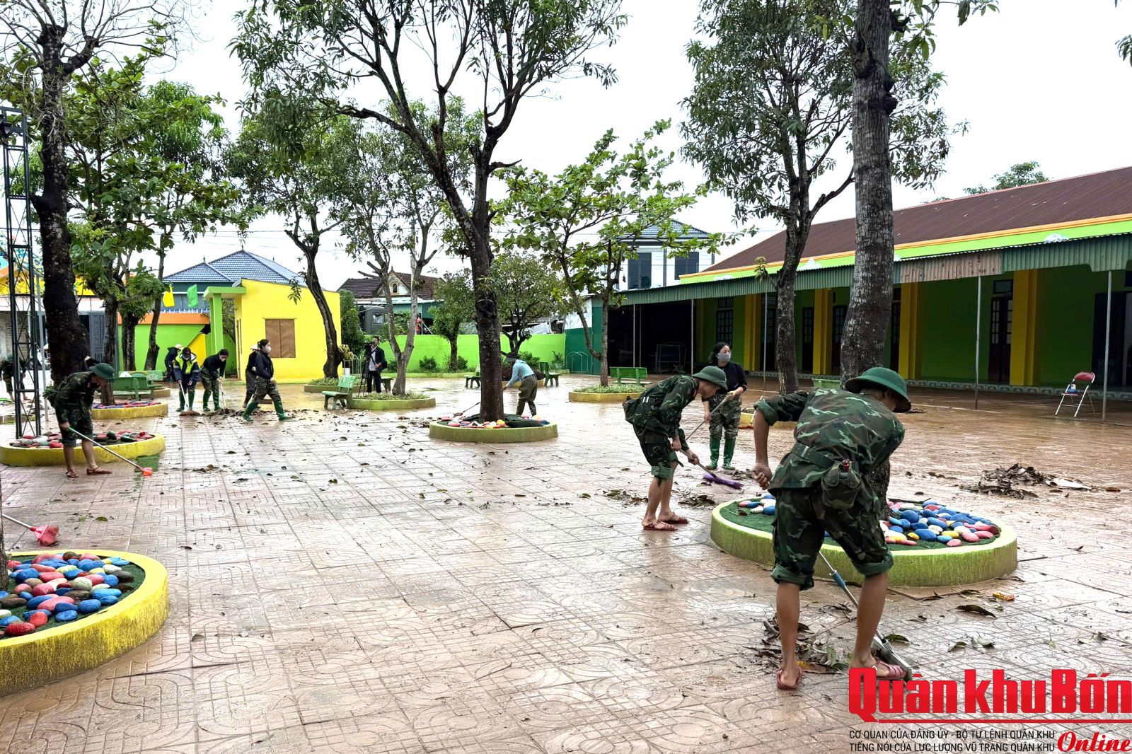 Ngay sau khi có mặt tại hiện trường, cán bộ, chiến sĩ Trung đoàn không quản ngại mưa lạnh, bùn lầy; khẩn trương bám địa bàn, bám dân, chia thành từng tổ công tác nhỏ đến từng khu dân cư, từng hộ gia đình hỗ trợ nạo vét bùn đất, thu dọn vệ sinh, tu sửa nhà cửa, trường học, trạm y tế, các công trình công cộng. Đơn vị tranh thủ thời điểm nước vừa rút để giúp các trường học dọn dẹp lớp học, sân trường, bàn ghế, thiết bị để học sinh sớm trở lại học tập.