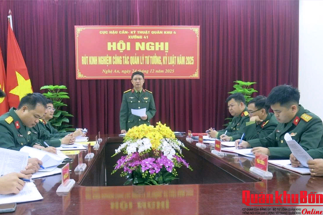 Sáng 24/12/2025, Xưởng 41, Cục Hậu cần - Kỹ thuật Quân khu 4 tổ chức Hội nghị rút kinh nghiệm công tác quản lý tư tưởng, kỷ luật năm 2025. Thượng tá Bùi Mạnh Hùng, Bí thư Đảng ủy, Chính trị viên Xưởng chủ trì hội nghị. Dự hội nghị có các đồng chí trong Đảng ủy, chỉ huy Xưởng; đại diện các tổ chức quần chúng, trưởng các ban, quản đốc, phó quản đốc các phân xưởng, tổ trưởng sản xuất và trợ lý các cơ quan.