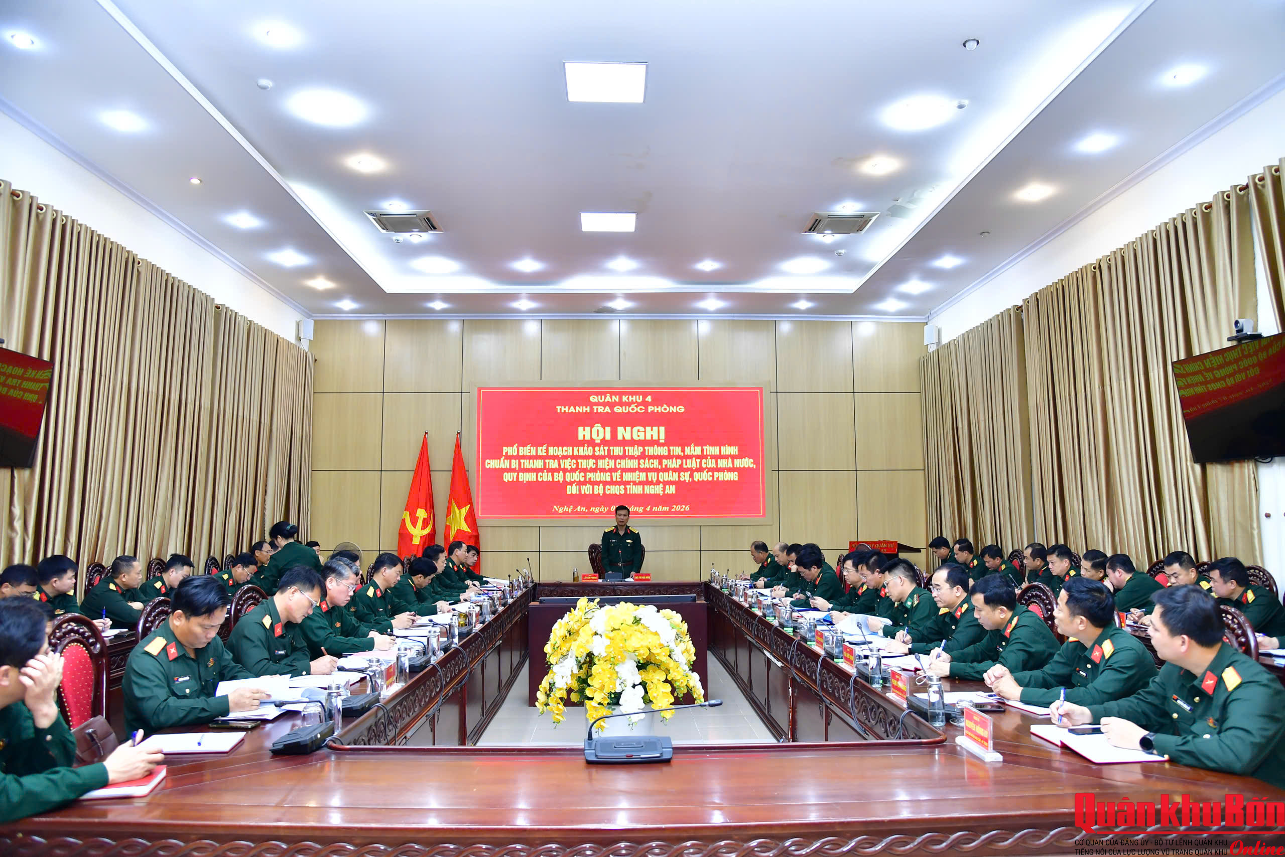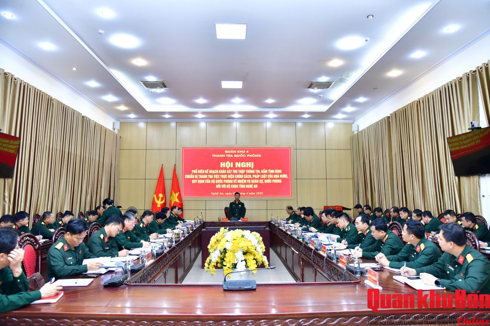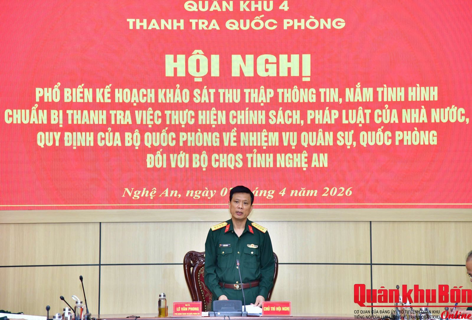 Thực hiện Kế hoạch số 62/KH-TTr ngày 24/3/2026 của Thanh tra Quốc phòng Quân khu 4 về khảo sát, thu thập thông tin, nắm tình hình chuẩn bị thanh tra việc thực hiện chính sách, pháp luật của Nhà nước, quy định của Bộ Quốc phòng về nhiệm vụ quân sự, quốc phòng, đoàn công tác Thanh tra Quốc phòng Quân khu 4 vừa tổ chức khảo sát tại Bộ Chỉ huy Quân sự (CHQS) tỉnh Nghệ An và các cơ quan, đơn vị liên quan. Đoàn công tác do Đại tá Lê Văn Phong, Phó Chánh Thanh tra Quốc phòng Quân khu 4 làm Trưởng đoàn, cùng các thành viên là cán bộ Thanh tra Quốc phòng Quân khu.