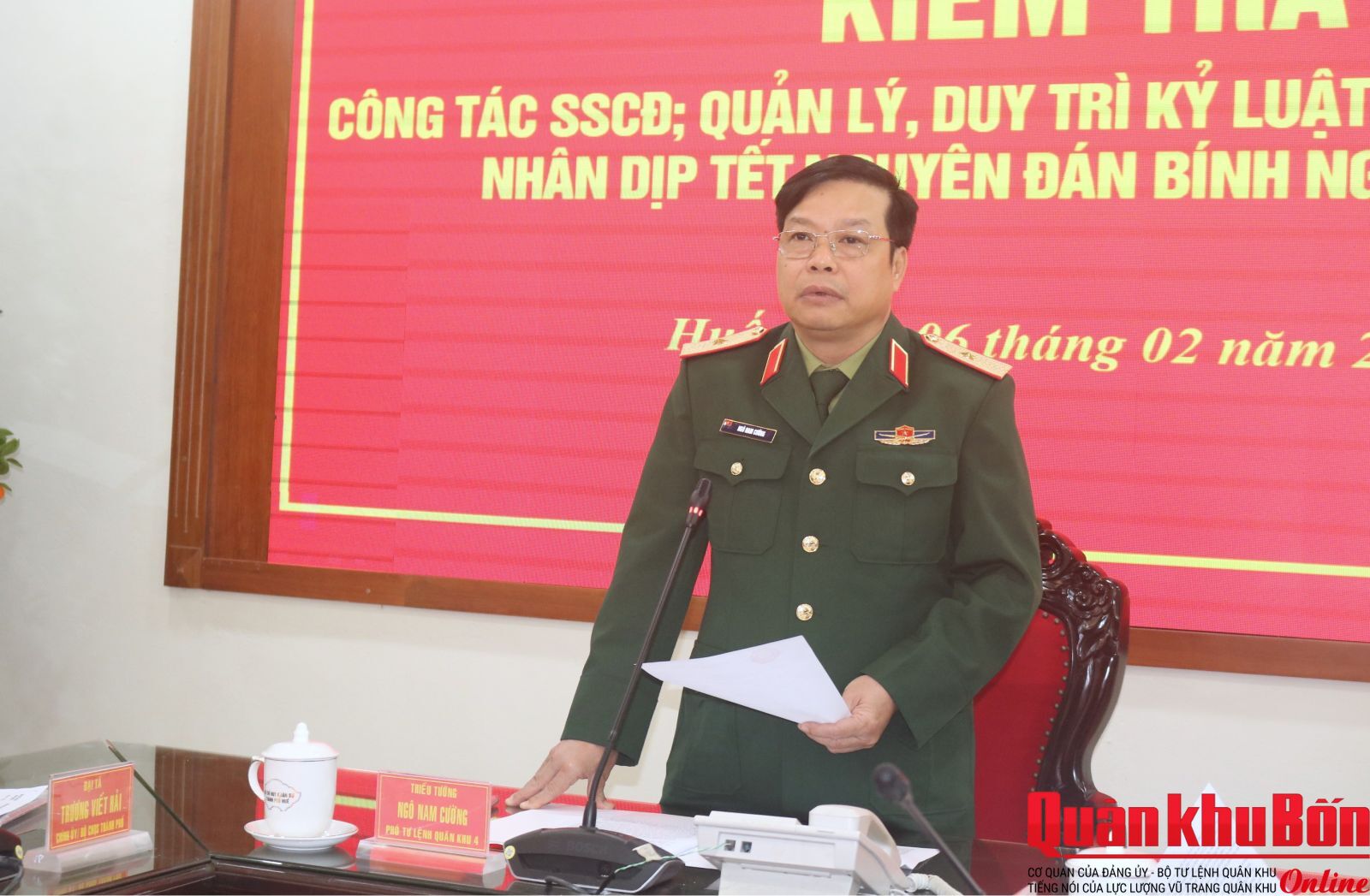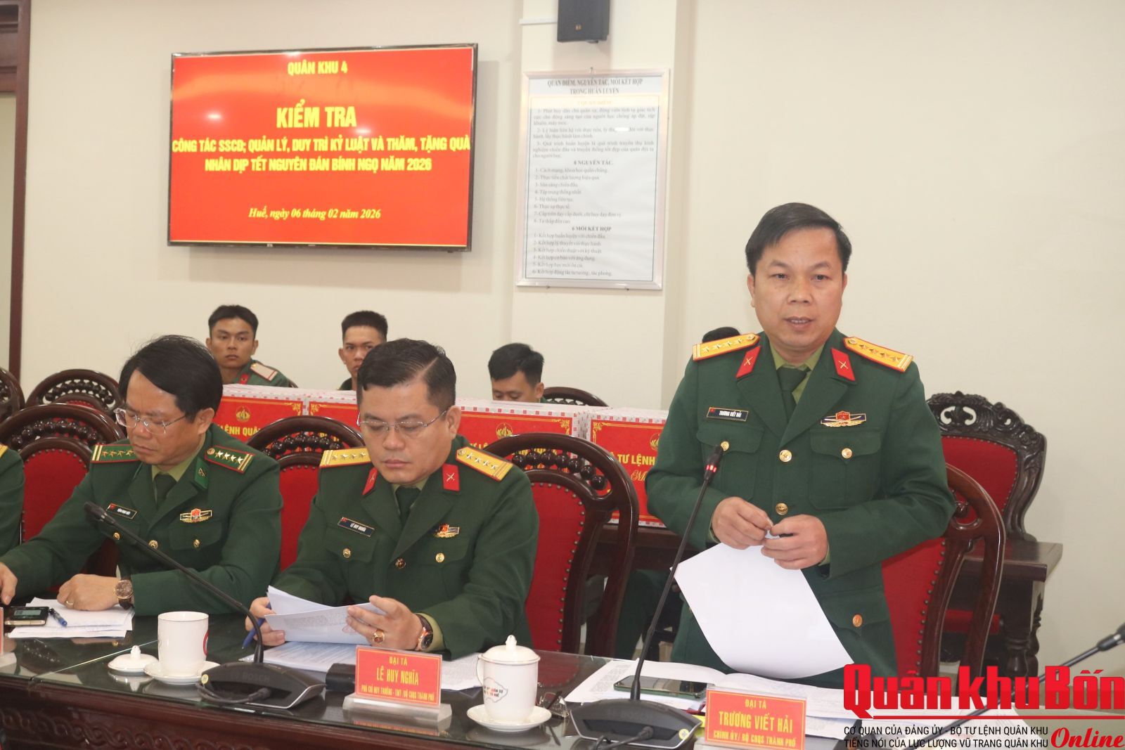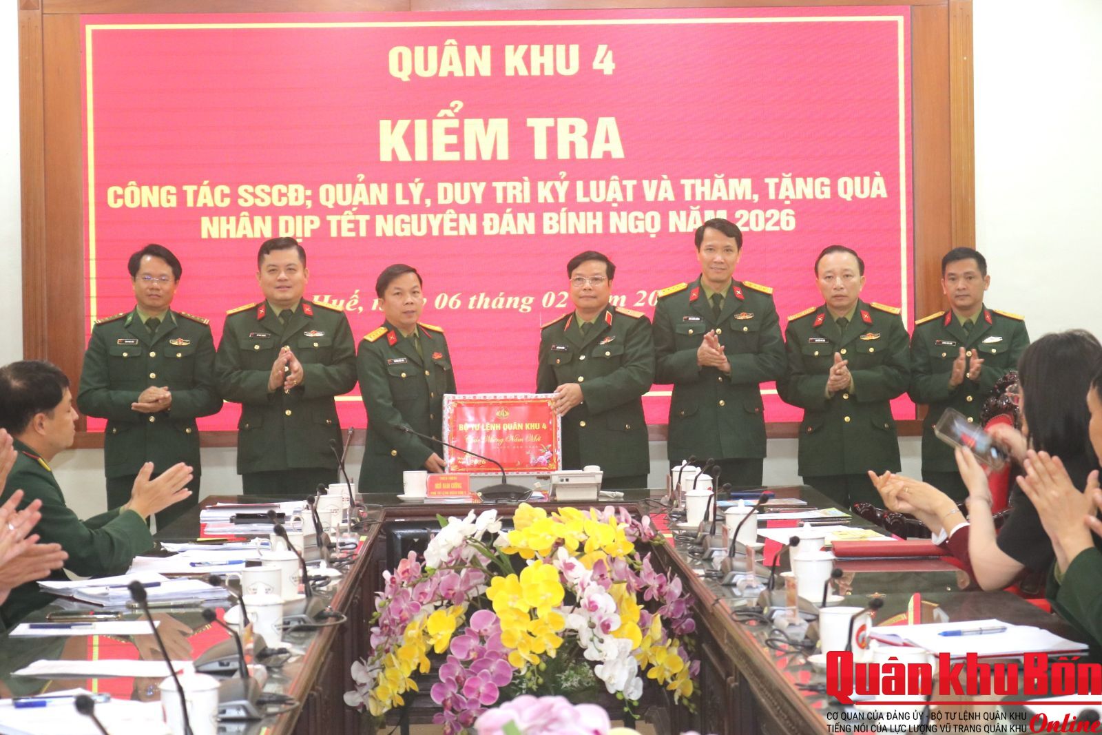 Nhân dịp đón Tết cổ truyền Bính Ngọ 2026, ngày 6/2/2026, Đoàn công tác của Quân khu do Thiếu tướng Ngô Nam Cường, Phó Tư lệnh Quân khu làm trưởng đoàn đã đến kiểm tra công tác sẵn sàng chiến đấu và chúc Tết cán bộ, chiến sĩ Bộ CHQS thành phố Huế và các cơ quan, đơn vị trên địa bàn. Đại tá Đinh Xuân Hướng, Phó Chủ nhiệm Chính trị Quân khu tham gia đoàn công tác.
