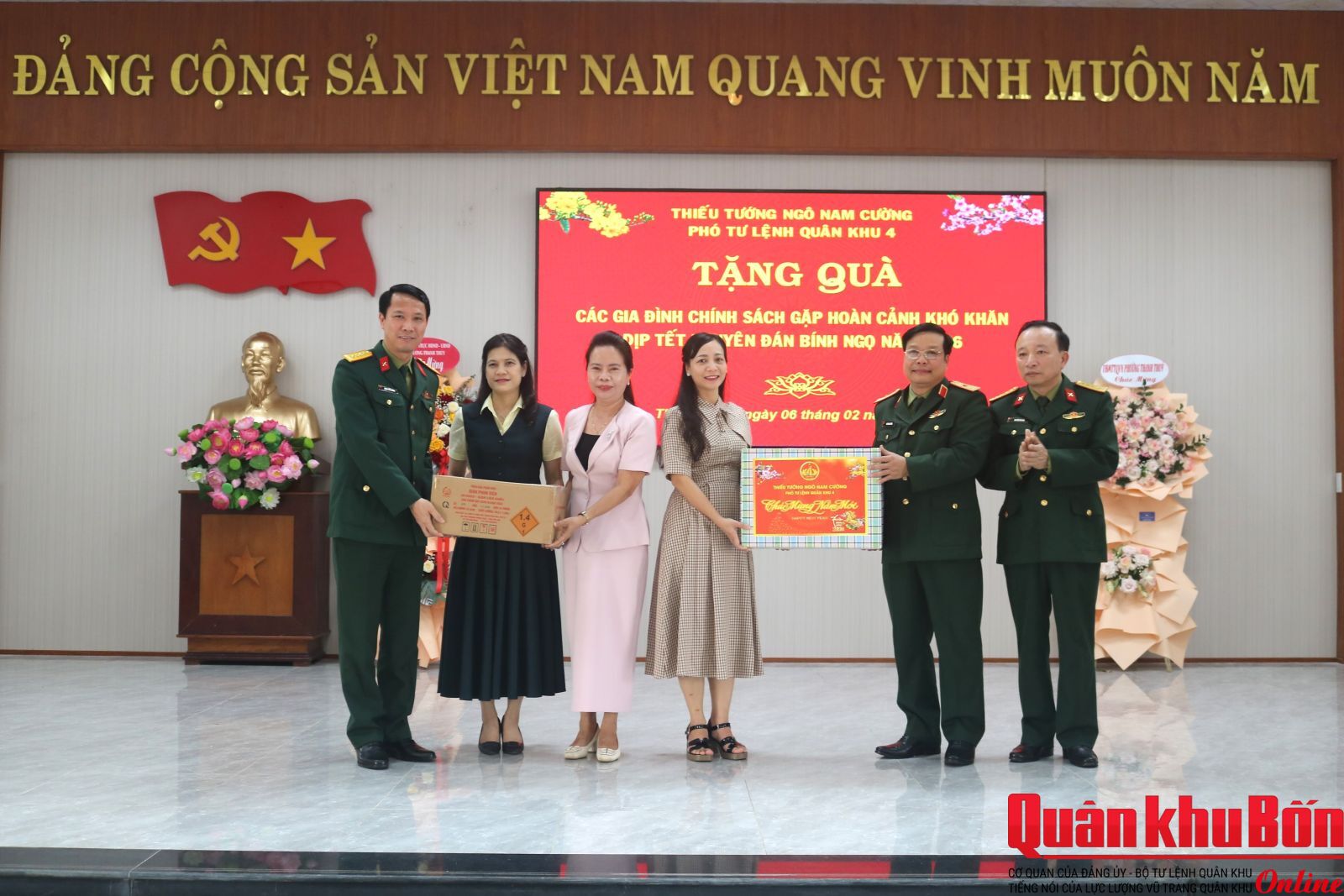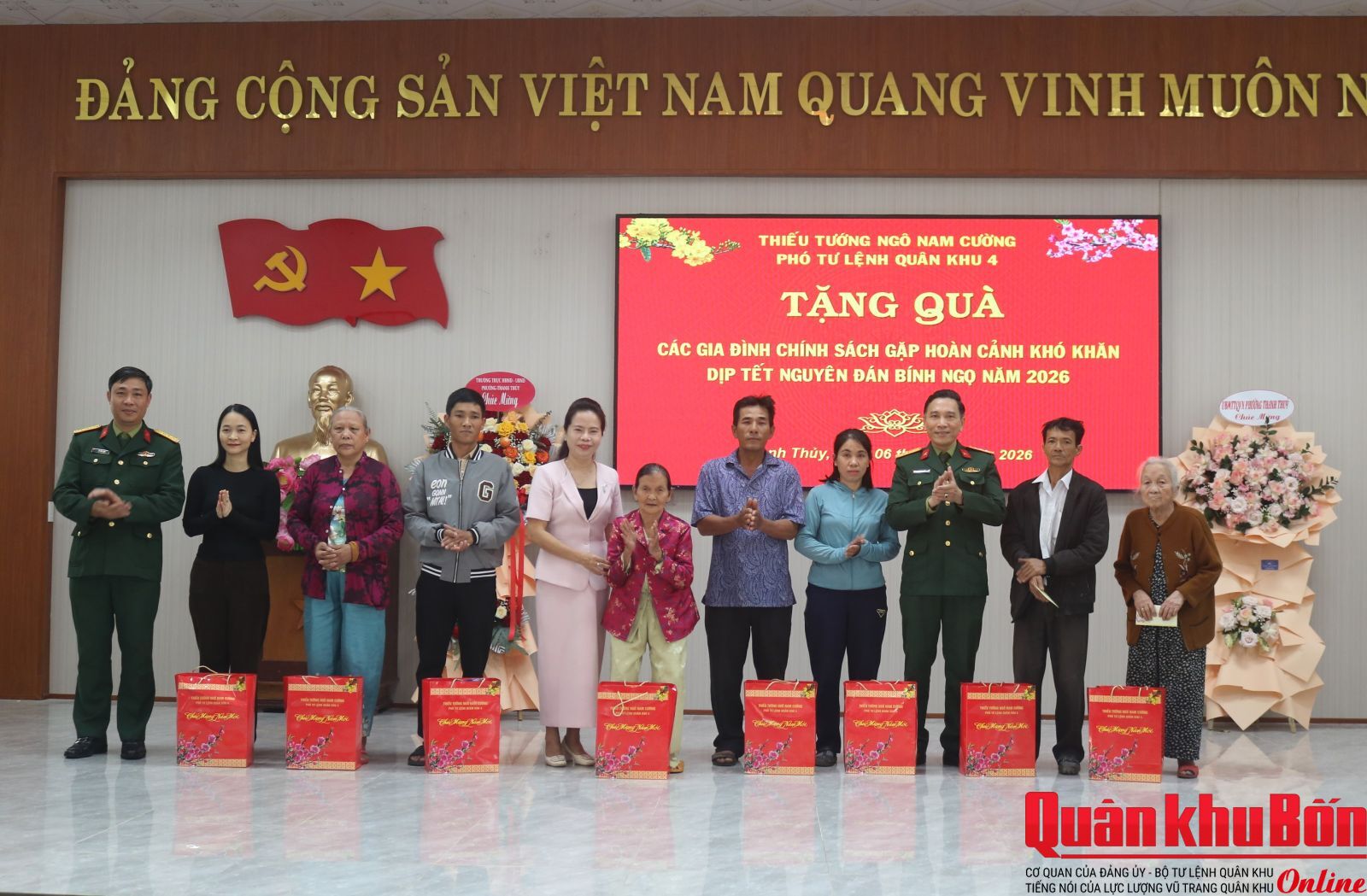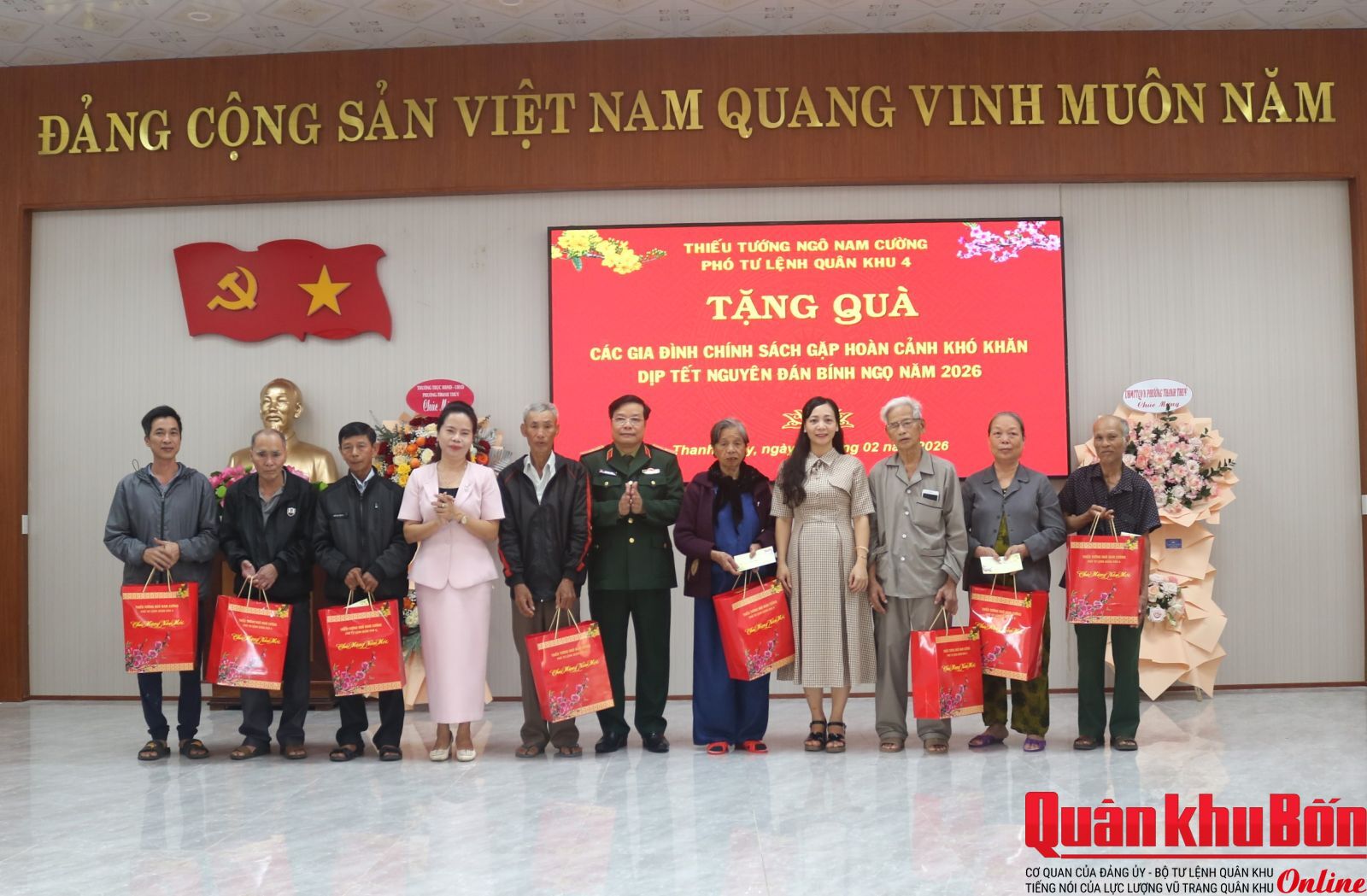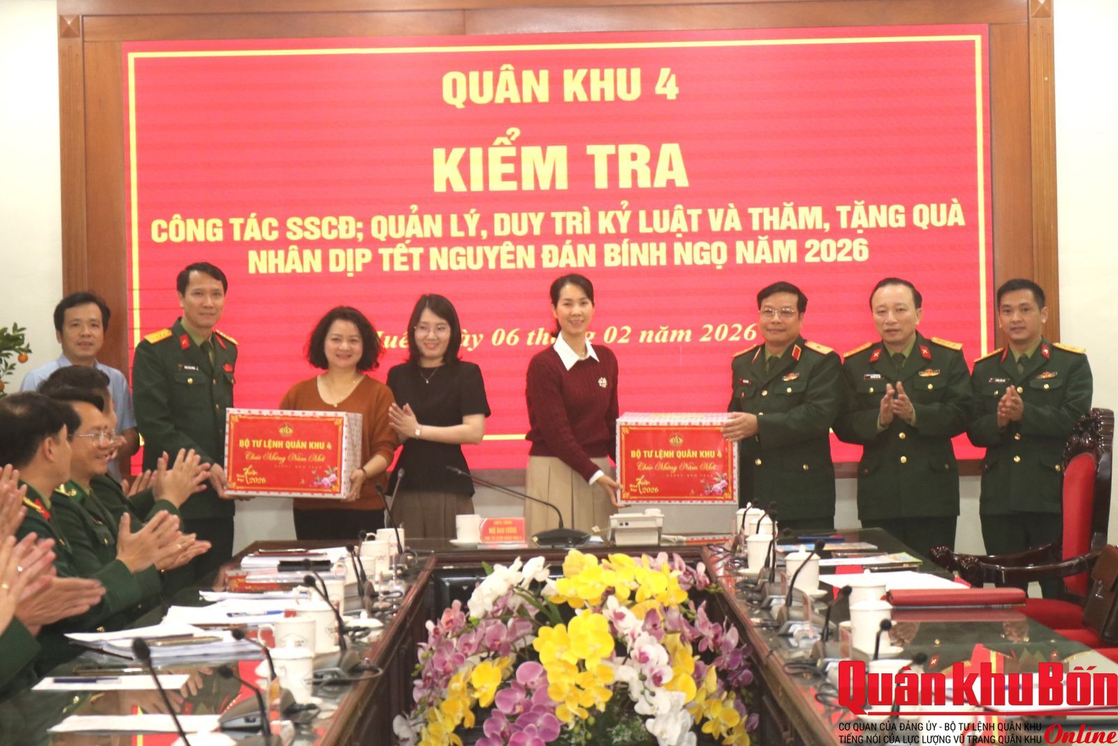 Nhân dịp đón Tết cổ truyền Bính Ngọ 2026, ngày 6/2/2026, Đoàn công tác của Quân khu do Thiếu tướng Ngô Nam Cường, Phó Tư lệnh Quân khu làm trưởng đoàn đã đến kiểm tra công tác sẵn sàng chiến đấu và chúc Tết cán bộ, chiến sĩ Bộ CHQS thành phố Huế và các cơ quan, đơn vị trên địa bàn. Đại tá Đinh Xuân Hướng, Phó Chủ nhiệm Chính trị Quân khu tham gia đoàn công tác.