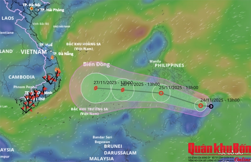Dự báo đến ngày 26/11, áp thấp nhiệt đới mạnh lên thành bão, đi vào vùng biển phía Đông Bắc đặc khu Trường Sa (là cơn bão số 15) với cường độ cấp 8, giật cấp 10.