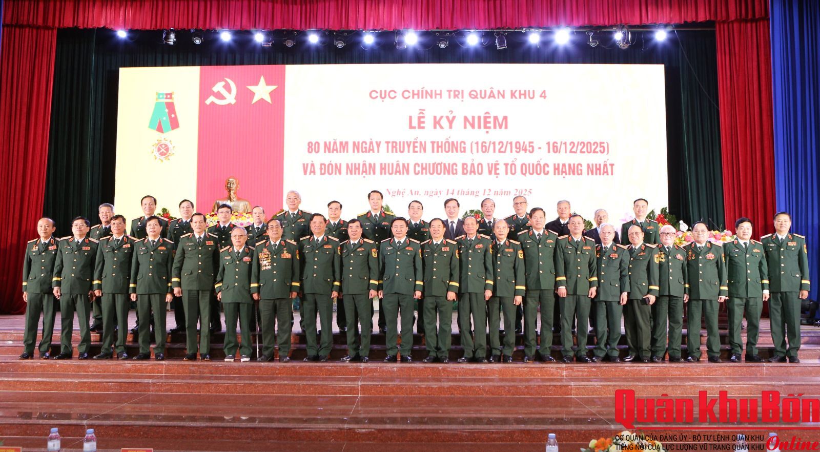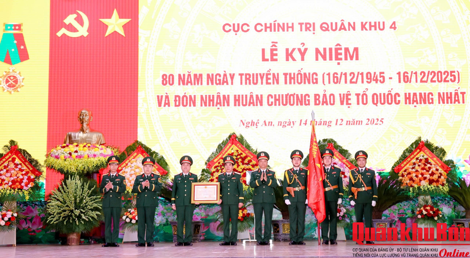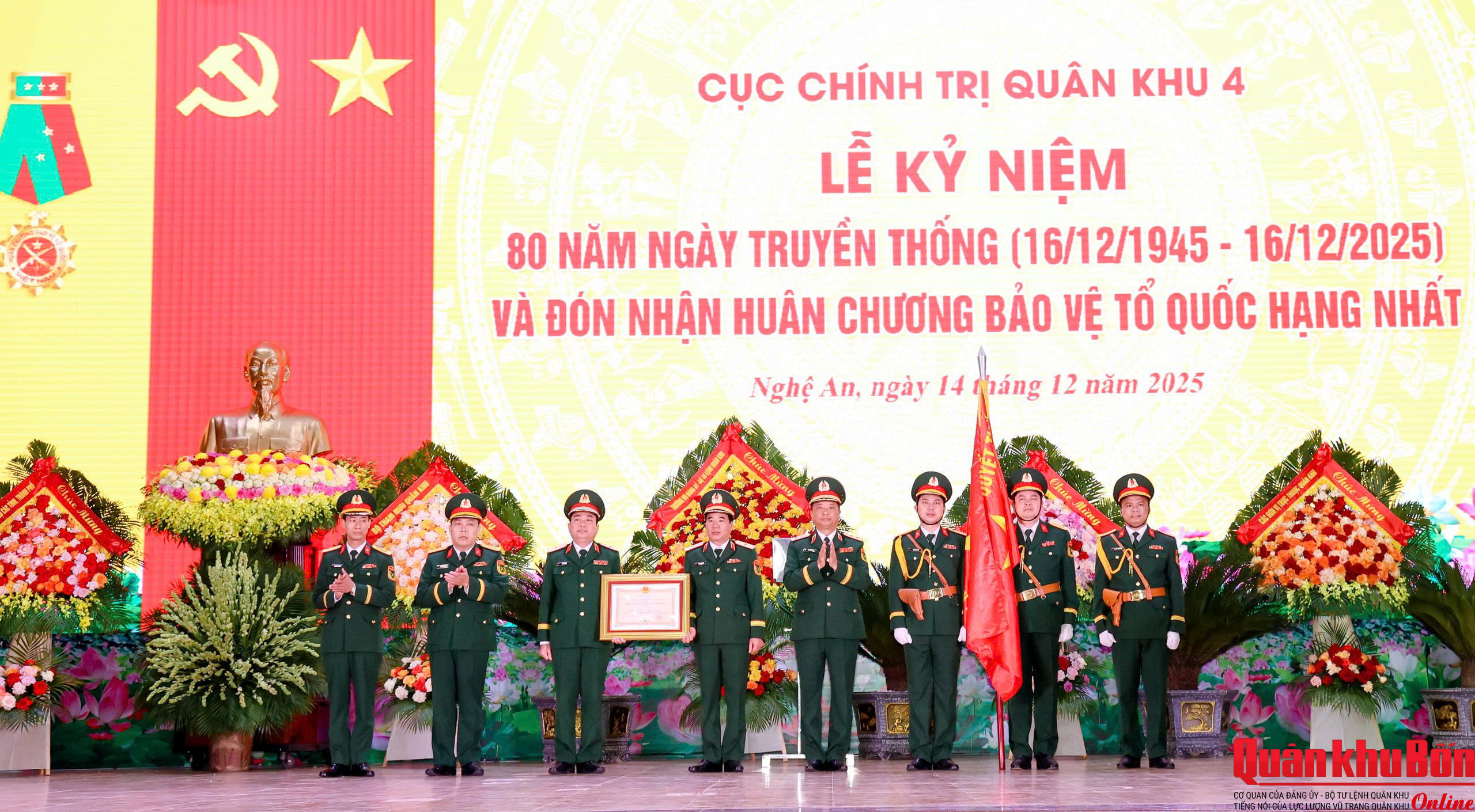 Sáng ngày 14/12/2025, Cục Chính trị Quân khu 4 long trọng tổ chức Lễ kỷ niệm 80 năm Ngày truyền thống (16/12/1945 - 16/12/2025) và đón nhận Huân chương Bảo vệ Tổ quốc hạng Nhất. Đại tướng Phan Văn Giang, Ủy viên Bộ Chính trị, Phó Bí thư Quân ủy Trung ương, Bộ trưởng Bộ Quốc phòng gửi thư khen, ghi nhận và biểu dương những đóng góp to lớn của Cục Chính trị Quân khu 4 trong sự nghiệp xây dựng và bảo vệ Tổ quốc.
