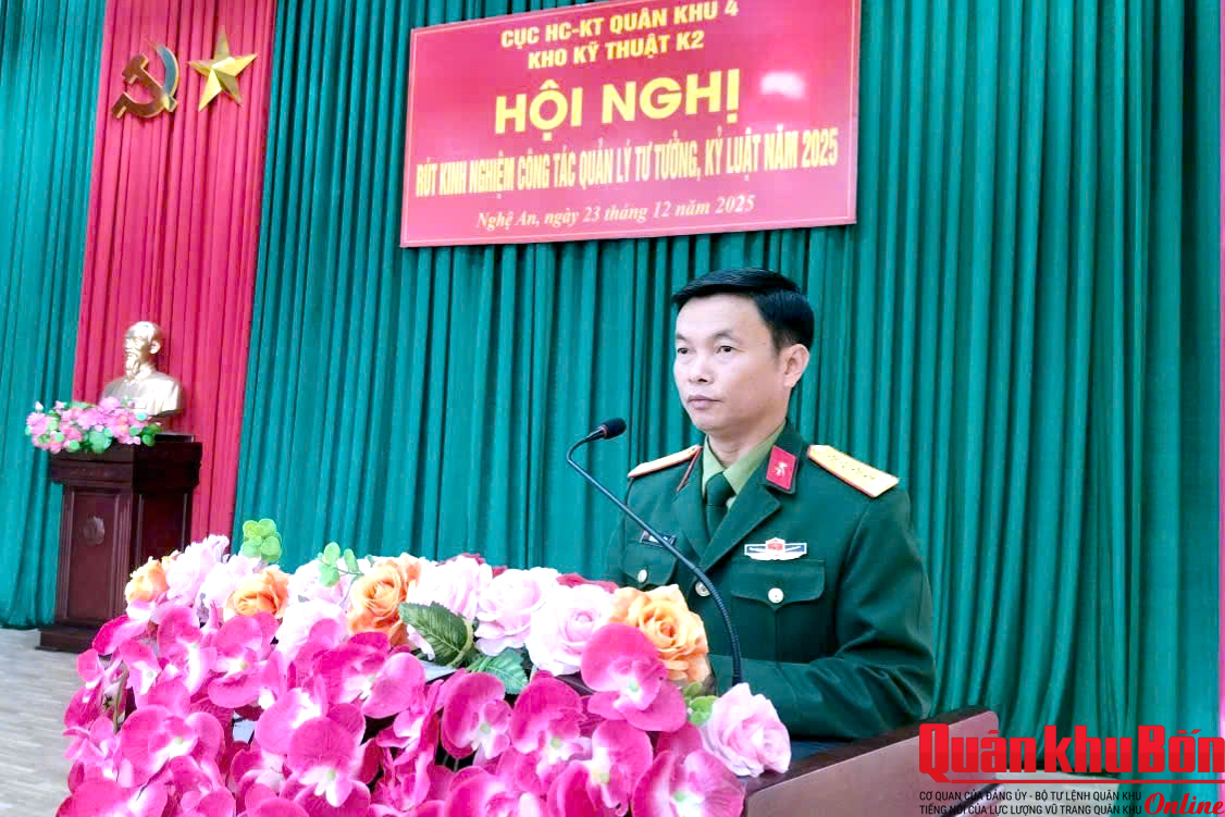 Sáng 23/12/2025, Đảng ủy, Chỉ huy Kho Kỹ thuật K2 (Cục Hậu cần - Kỹ thuật) tổ chức Hội nghị rút kinh nghiệm công tác quản lý tư tưởng, kỷ luật năm 2025. Đại tá Phan Đông Sáng, Bí thư Đảng ủy, Chính trị viên Kho chủ trì hội nghị. Dự hội nghị có các đồng chí trong Thường vụ Đảng ủy, Chỉ huy Kho; đại diện các tổ chức quần chúng và cán bộ cấp đại đội, tương đương trở lên trong toàn Kho.
