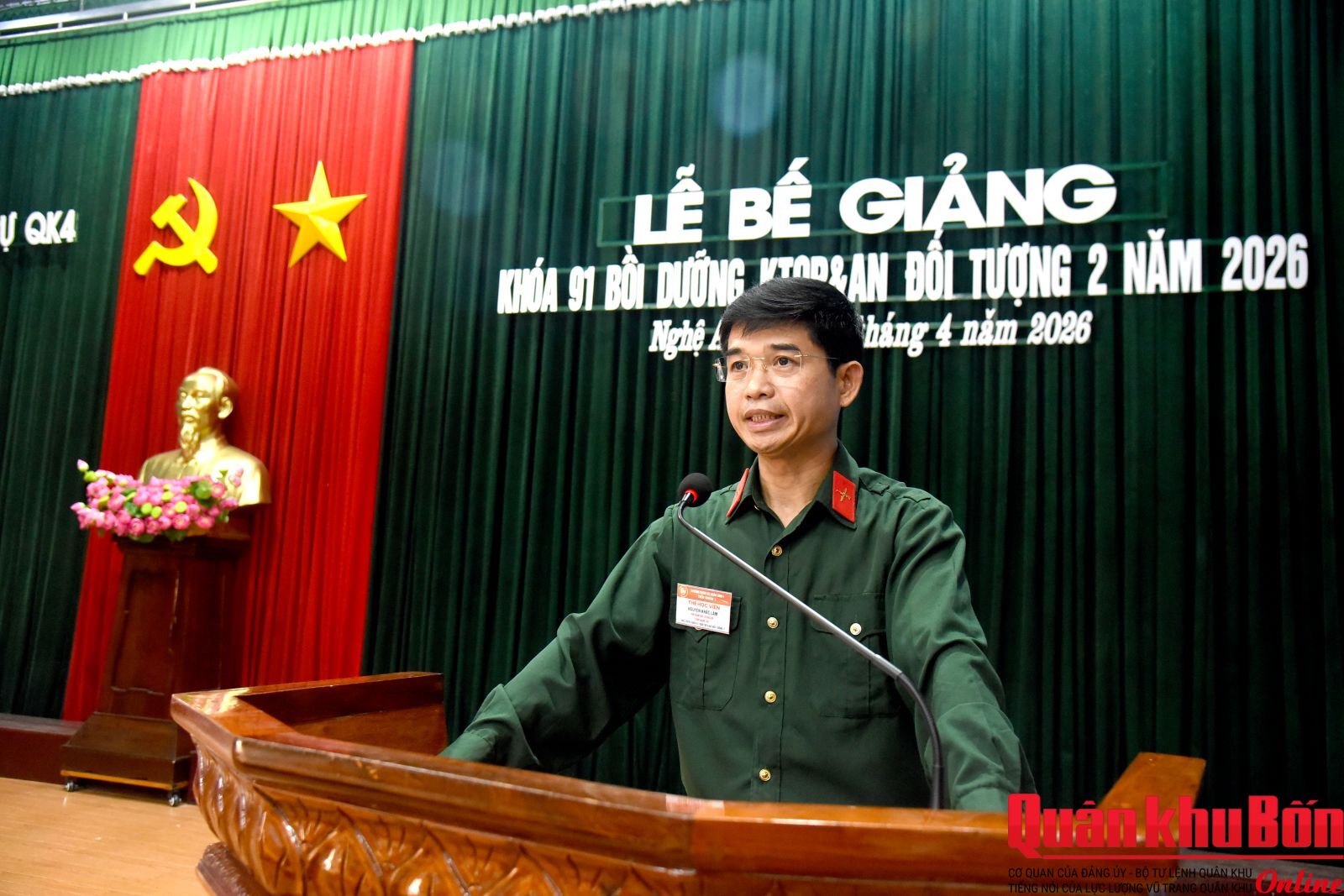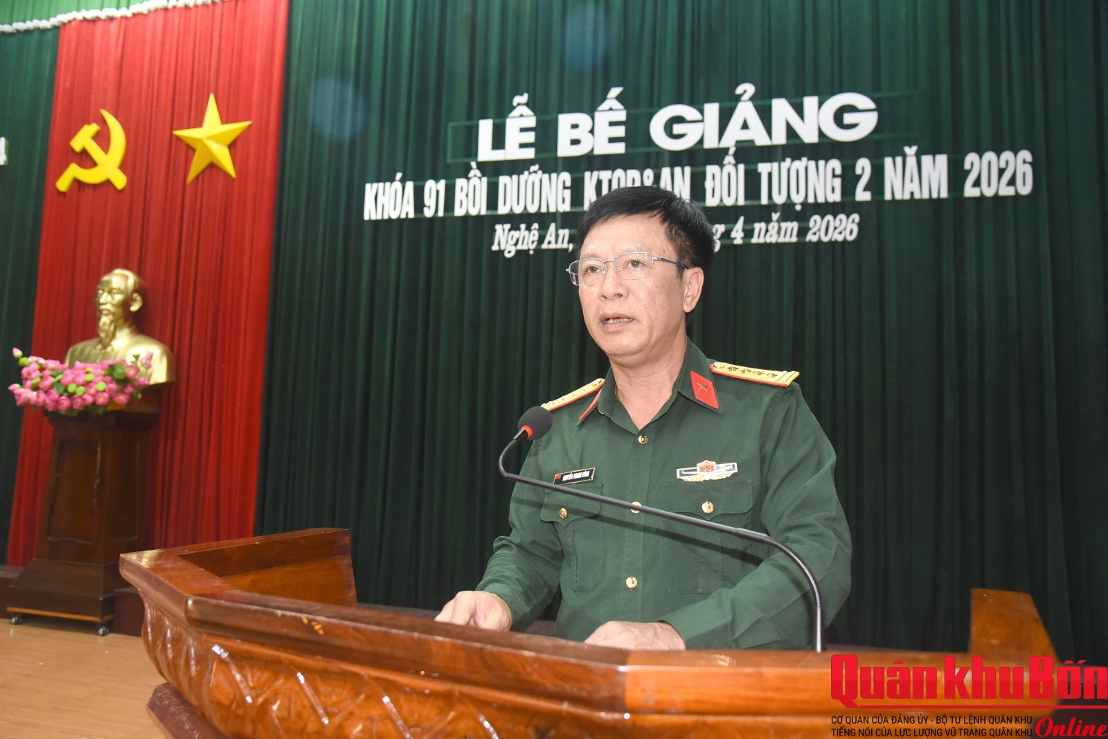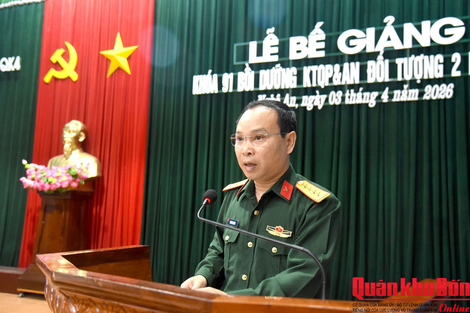 Sáng 3/4/2026, Trường Quân sự Quân khu 4 tổ chức Lễ bế giảng Khóa 91 bồi dưỡng kiến thức quốc phòng và an ninh đối tượng 2 năm 2026. Thiếu tướng Lê Hồng Nhân, Phó Tư lệnh kiêm Tham mưu trưởng Quân khu, Phó Chủ tịch Thường trực Hội đồng Giáo dục Quốc phòng và An ninh Quân khu dự, chỉ đạo buổi lễ.
