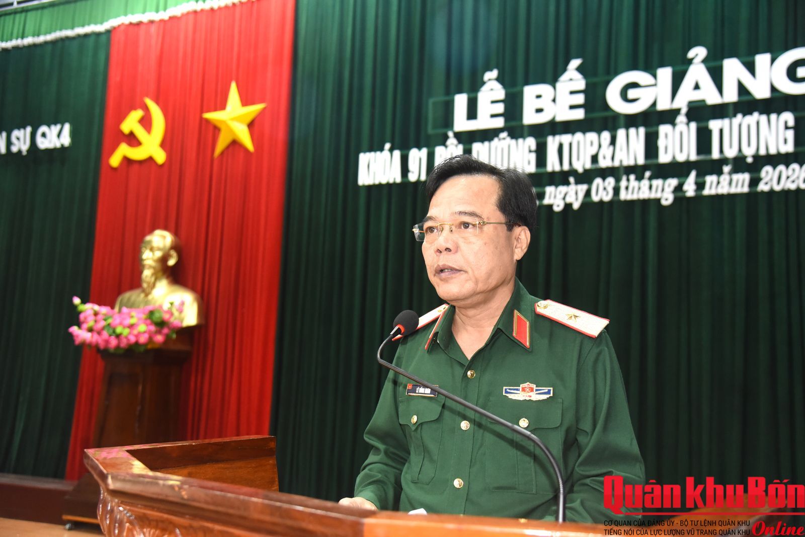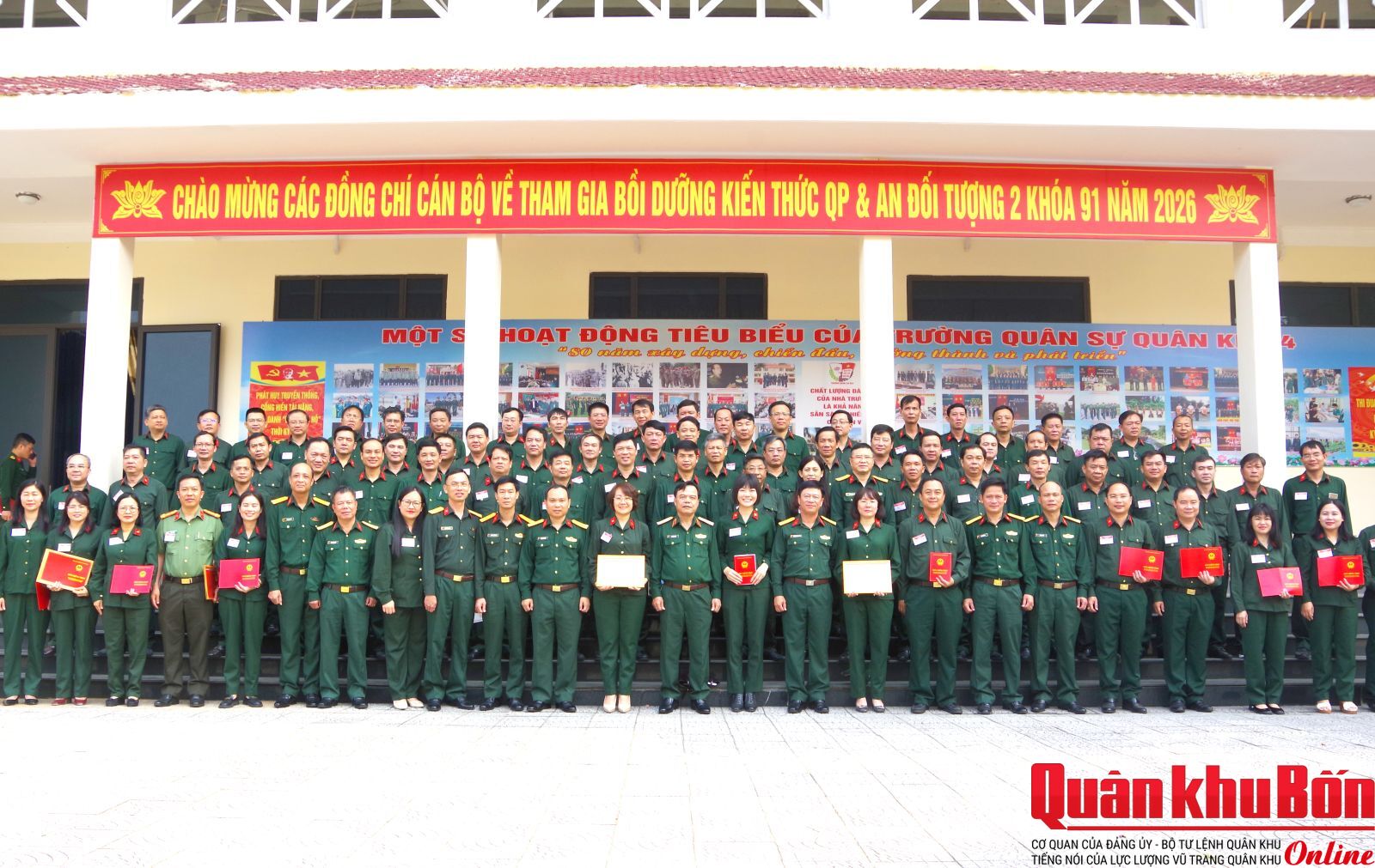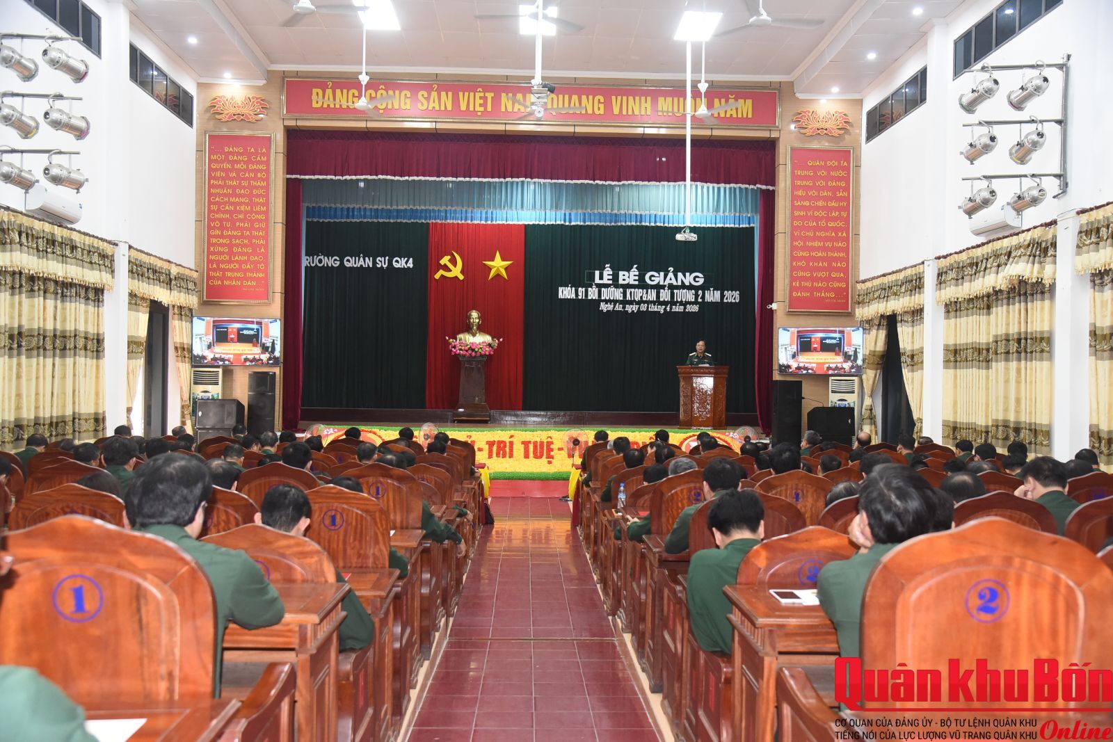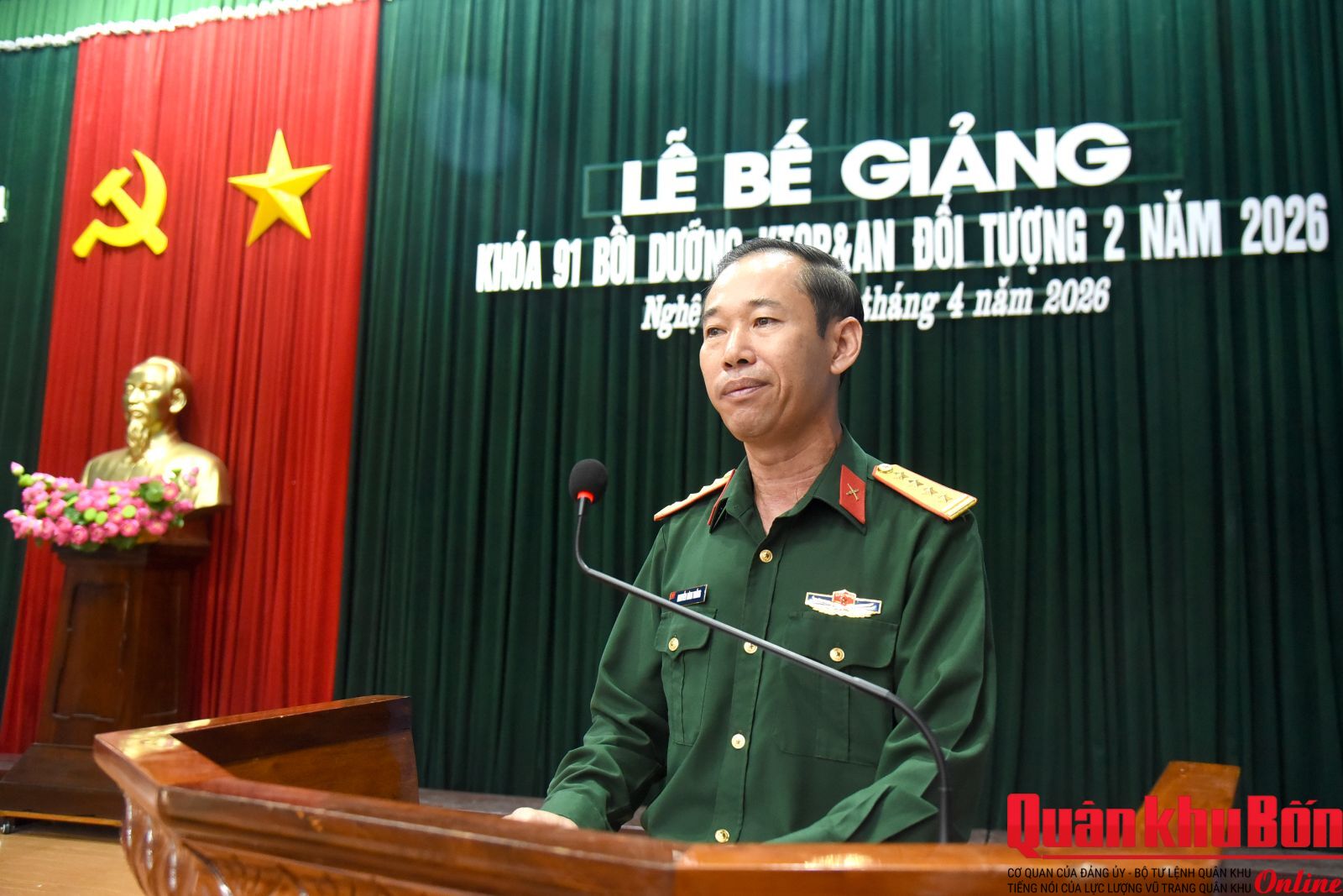Sáng 3/4/2026, Trường Quân sự Quân khu 4 tổ chức Lễ bế giảng Khóa 91 bồi dưỡng kiến thức quốc phòng và an ninh đối tượng 2 năm 2026. Thiếu tướng Lê Hồng Nhân, Phó Tư lệnh kiêm Tham mưu trưởng Quân khu, Phó Chủ tịch Thường trực Hội đồng Giáo dục Quốc phòng và An ninh Quân khu dự, chỉ đạo buổi lễ.