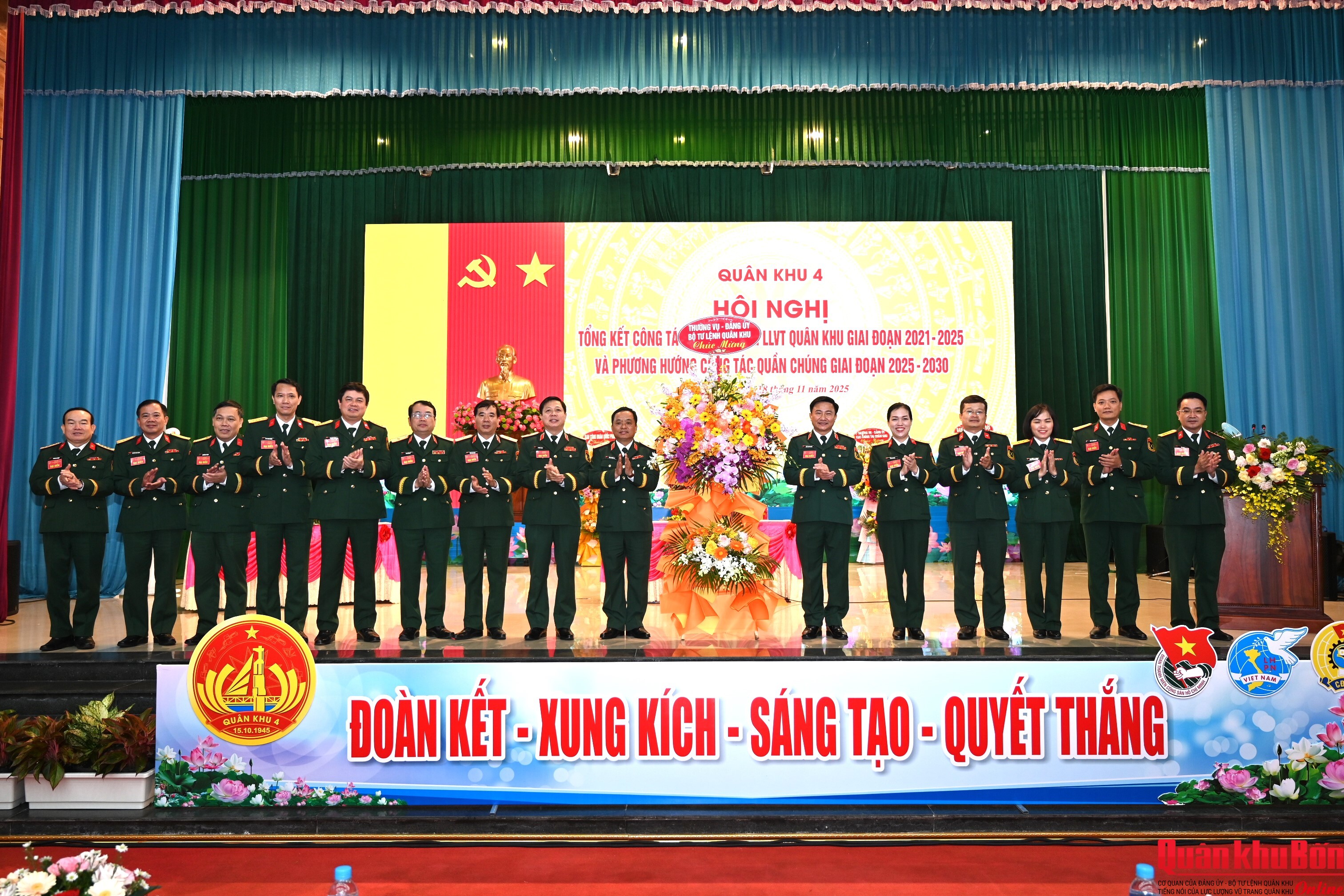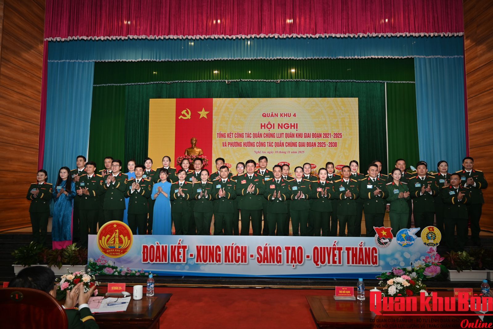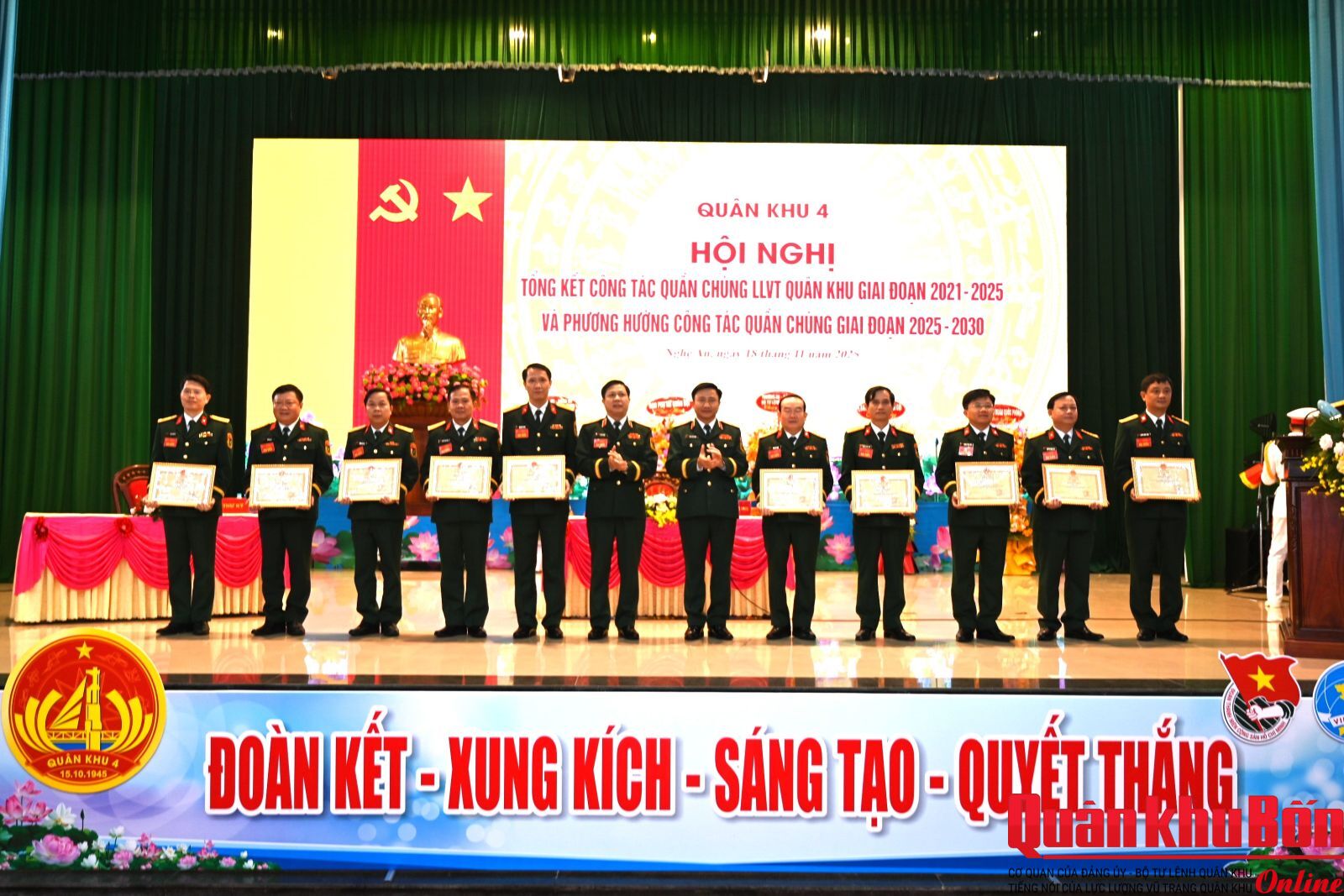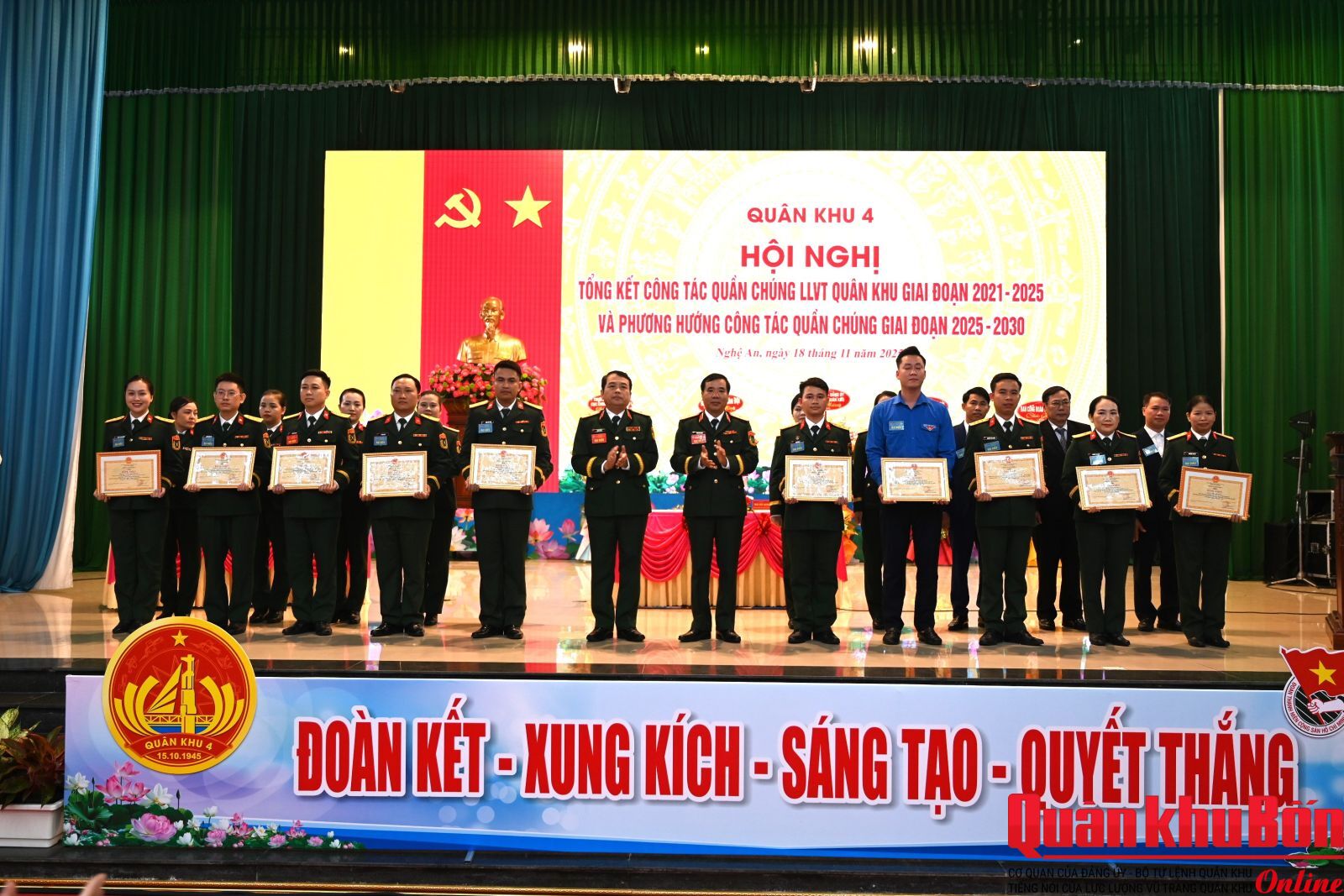 Dịp này, Bộ Tư lệnh Quân khu 4 đã trao tặng Bằng khen cho 10 tập thể có thành tích xuất sắc trong thực hiện công tác quần chúng; 20 cá nhân có thành tích xuất sắc trong thực hiện các phong trào thi đua của các tổ chức quần chúng giai đoạn 2021-2025.
