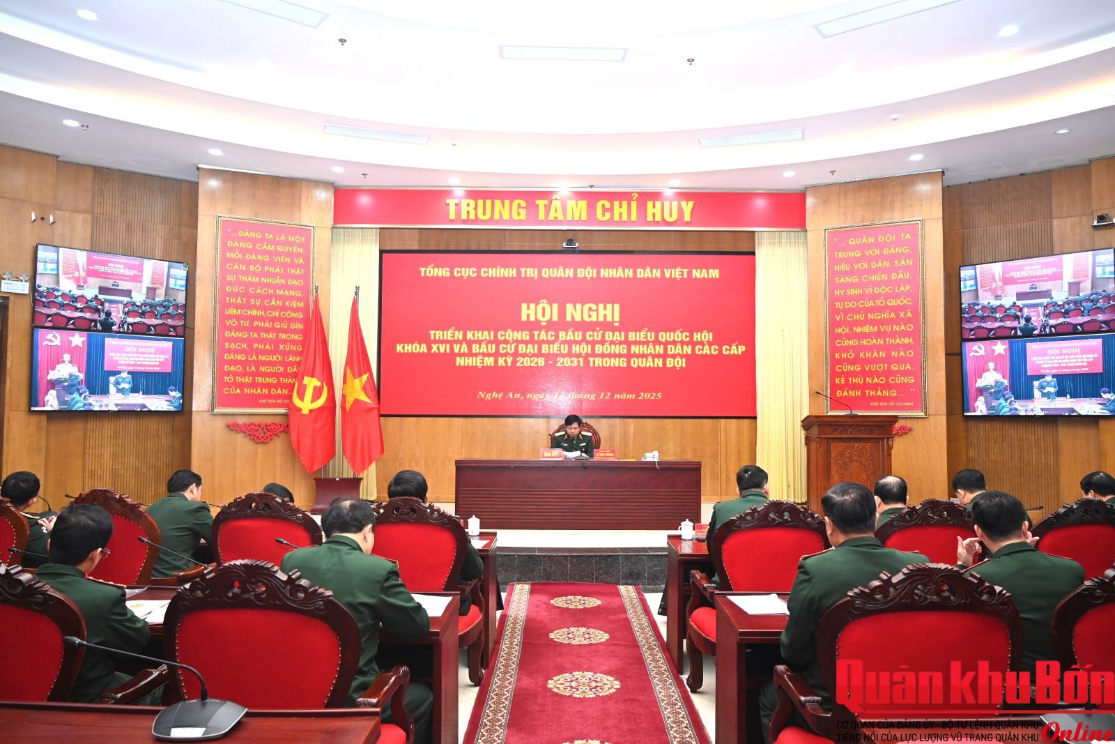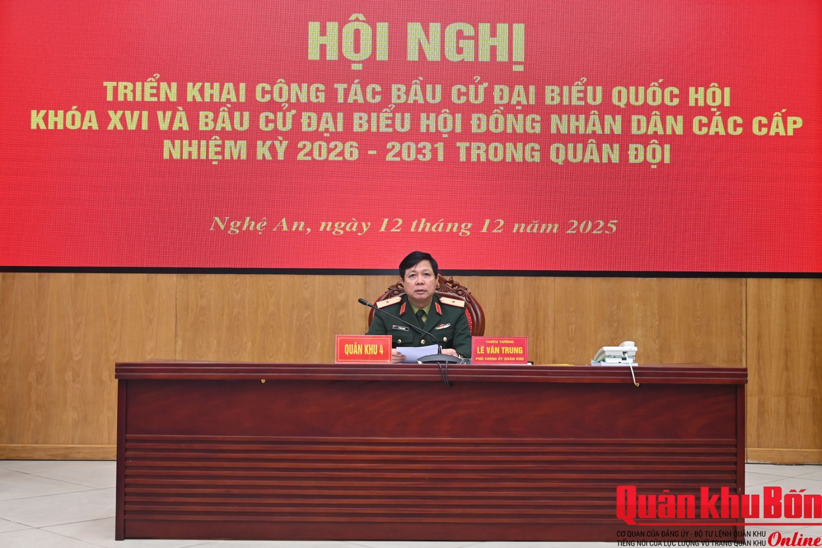 Ngày 12/12/2025, Tổng cục Chính trị Quân đội nhân dân Việt Nam tổ chức hội nghị triển khai các văn bản về công tác bầu cử đại biểu Quốc hội khóa XVI và bầu cử đại biểu Hội đồng nhân dân các cấp, nhiệm kỳ 2021 – 2026 trong Quân đội. Thượng tướng Trương Thiên Tô, Phó Chủ nhiệm Tổng cục Chính trị chủ trì buổi làm việc. Hội nghị được tổ chức trực tiếp và trực tuyến tới 48 điểm cầu trong toàn quân. Thiếu tướng Lê Văn Trung, Ủy viên Ban Thường vụ Đảng ủy, Phó Chính ủy Quân khu chủ trì tại điểm cầu Quân khu 4.