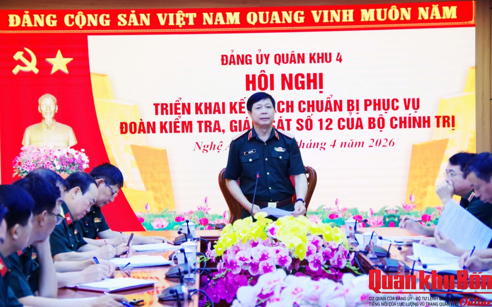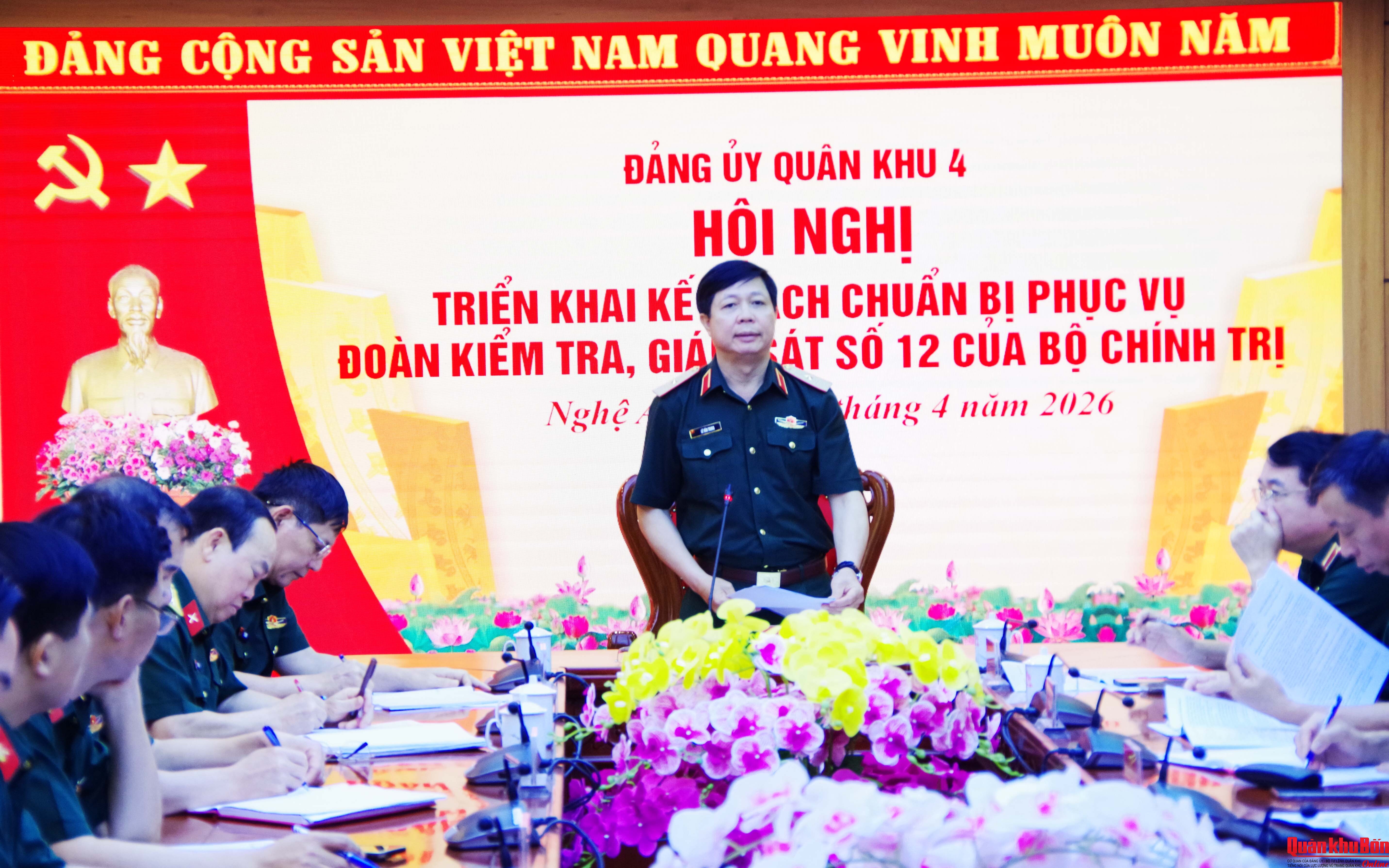 Sáng 21/4/2026, Đảng ủy Quân khu 4 triển khai công tác chuẩn bị phục vụ Đoàn Kiểm tra, giám sát số 12 của Bộ Chính trị làm việc với Ban Thường vụ Đảng ủy Quân khu. Thiếu tướng Lê Văn Trung, Ủy viên Ban Thường vụ Đảng ủy, Phó Chính ủy Quân khu chủ trì Hội nghị. Đại biểu Thủ trưởng Cục Chính trị, Bộ Tham mưu, Cục Hậu cần - Kỹ thuật, Ủy ban Kiểm tra Đảng ủy Quân khu và một số cơ quan, đơn vị dự hội nghị.
