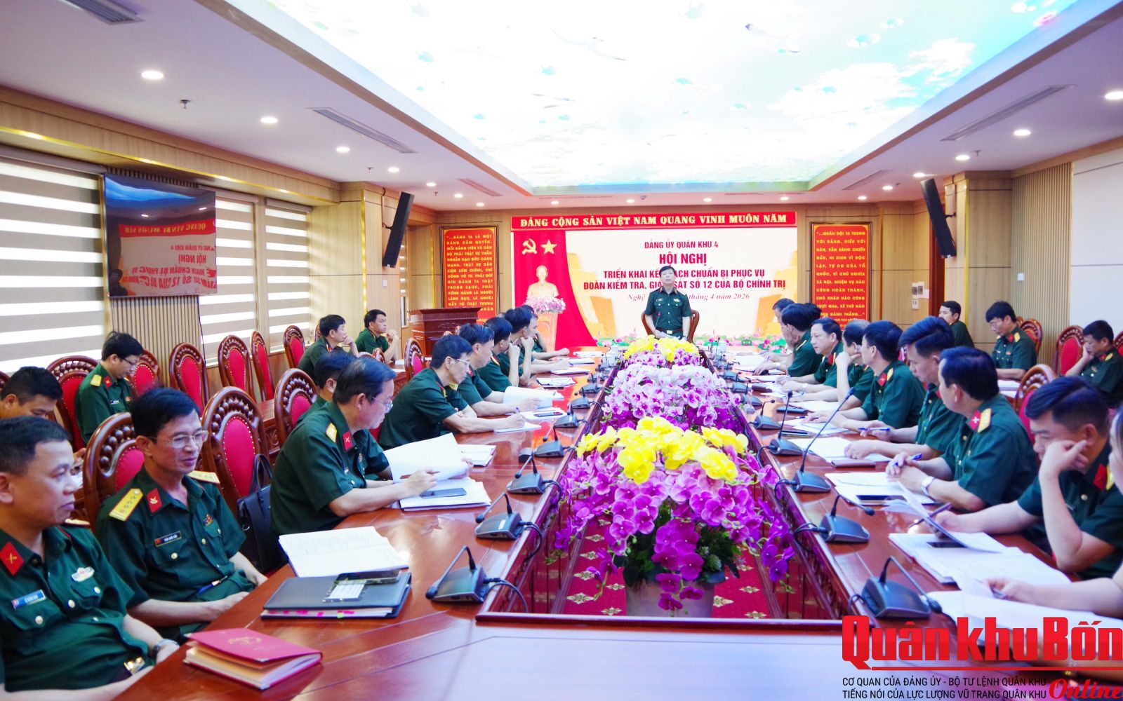 Tại Hội nghị, các đại biểu đã được quán triệt Kế hoạch của Đảng ủy Quân khu về triển khai công tác chuẩn bị phục vụ Đoàn Kiểm tra, giám sát số 12 của Bộ Chính trị. Theo kế hoạch, Đoàn công tác sẽ tiến hành kiểm tra đợt 2 năm 2026 đối với Ban Thường vụ Quân ủy Trung ương; trong đó, có nội dung kiểm tra đối với Đảng ủy Quân khu 4.