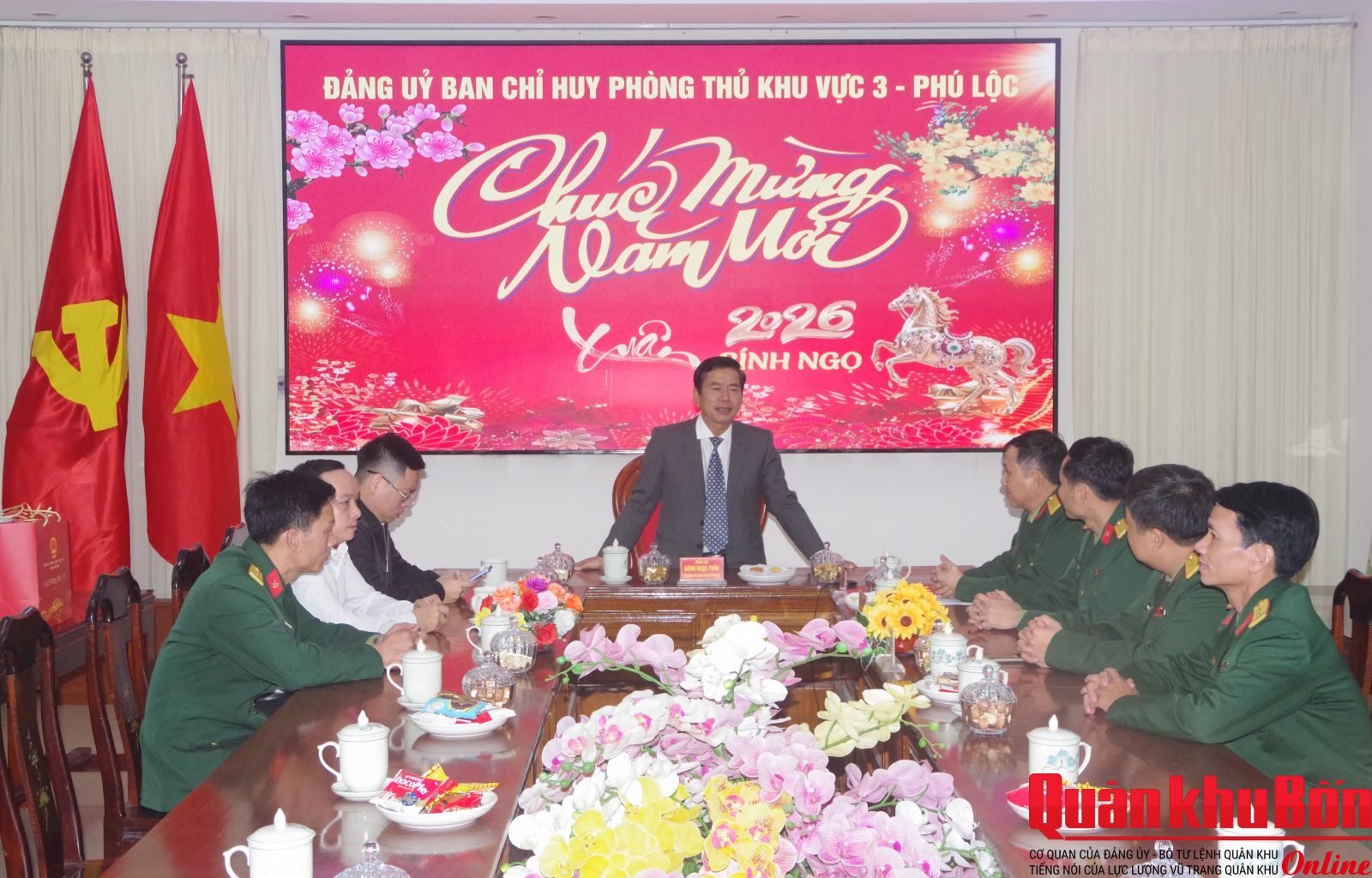Chiều ngày 03/2/2025, Đoàn công tác Thành ủy thành phố Huế do Đồng chí Đặng Ngọc Trân, Ủy viên Ban Thường vụ Thành ủy, Trưởng Ban Nội chính làm trưởng đoàn đã đến thăm, chúc tết cán bộ, nhân viên Ban Chỉ huy Phòng thủ khu vực 3 - Phú Lộc, Bộ Chỉ huy Quân sự thành phố Huế nhân dịp tết Bính Ngọ 2026.