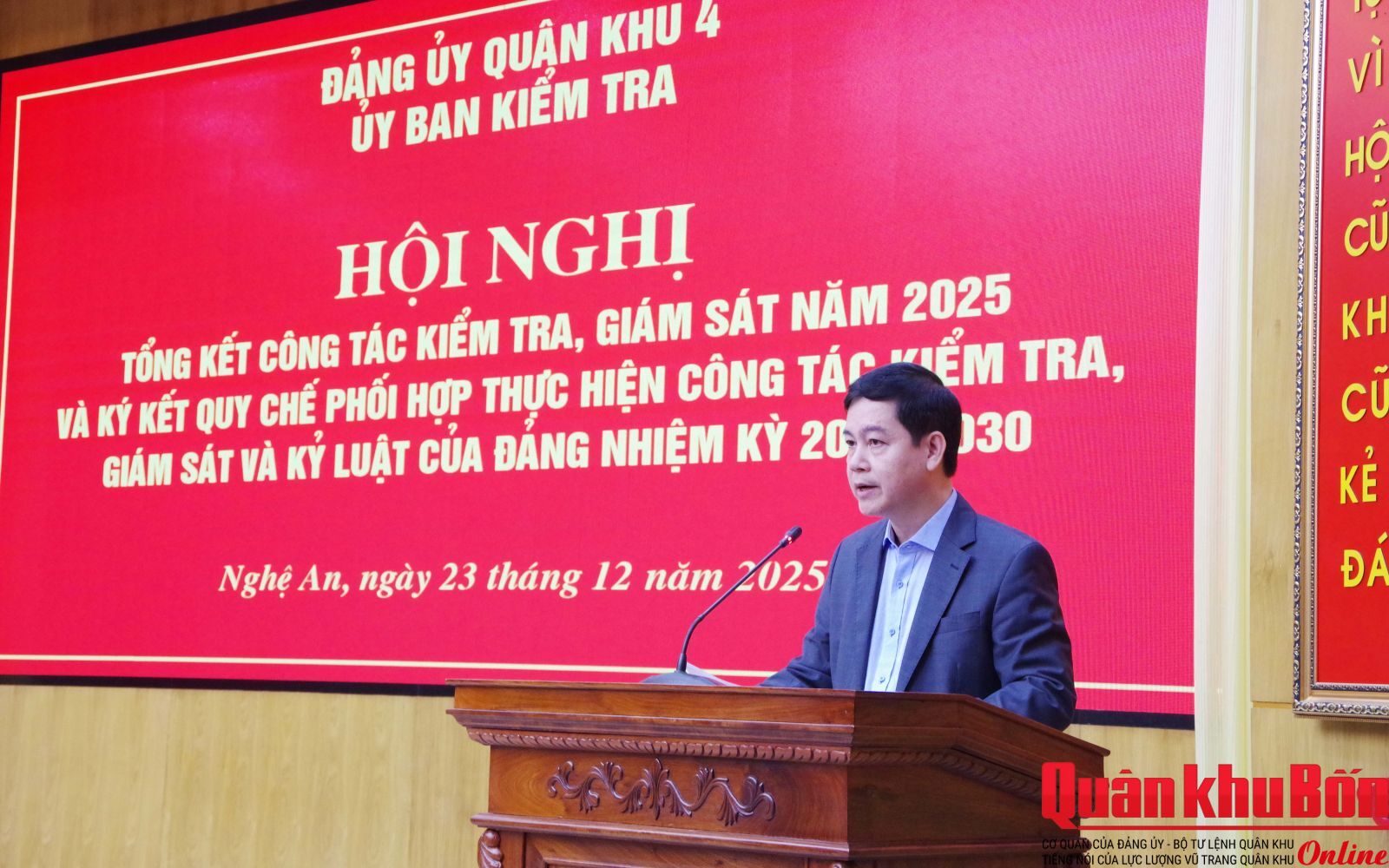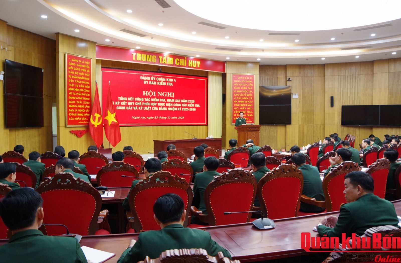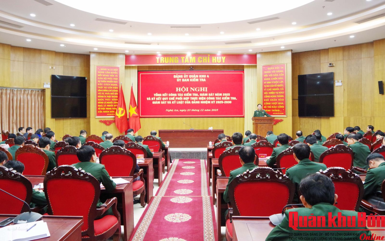 Sáng ngày 23/12/2025, Ủy ban Kiểm tra Đảng ủy Quân khu 4 đã tổ chức Hội nghị tổng kết công tác kiểm tra, giám sát năm 2025 và ký kết Quy chế phối hợp thực hiện công tác kiểm tra, giám sát và kỷ luật của Đảng nhiệm kỳ 2025 - 2030. Thiếu tướng Ngô Quang Tuấn, Ủy viên chuyên trách Ủy ban Kiểm tra Quân ủy Trung ương dự, chỉ đạo Hội nghị. Thiếu tướng Lê Văn Trung, Ủy viên Ban Thường vụ Đảng ủy, Phó Chính ủy Quân khu, Chủ nhiệm Ủy ban Kiểm tra Đảng ủy Quân khu 4 chủ trì Hội nghị.