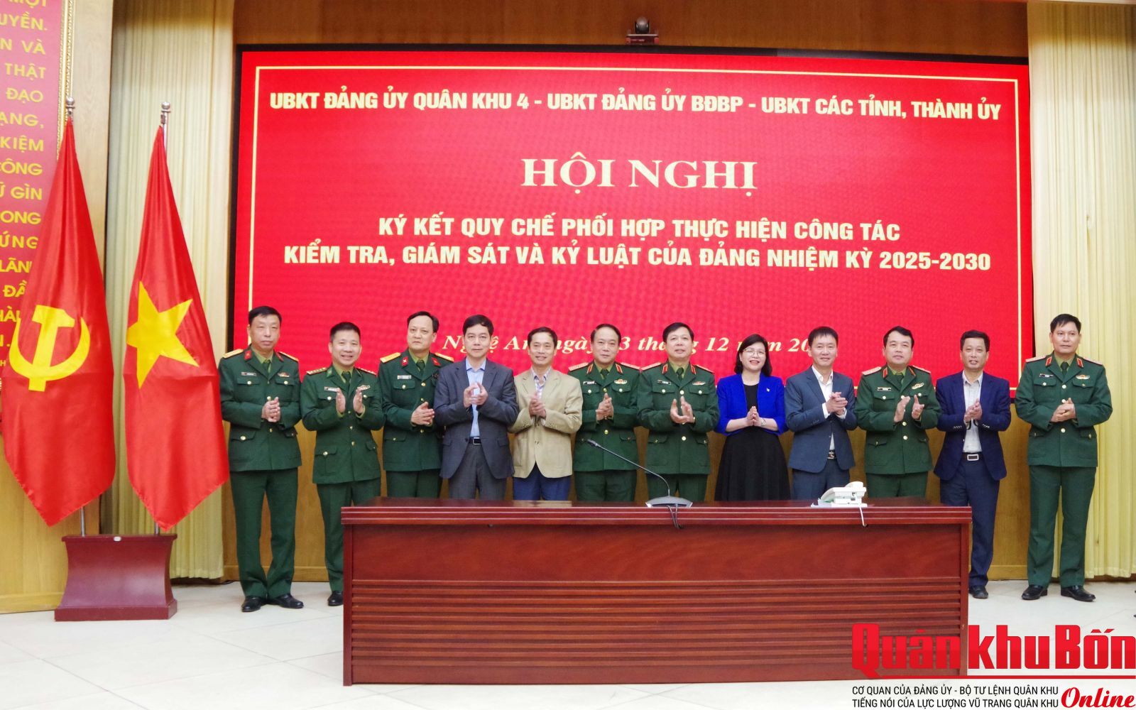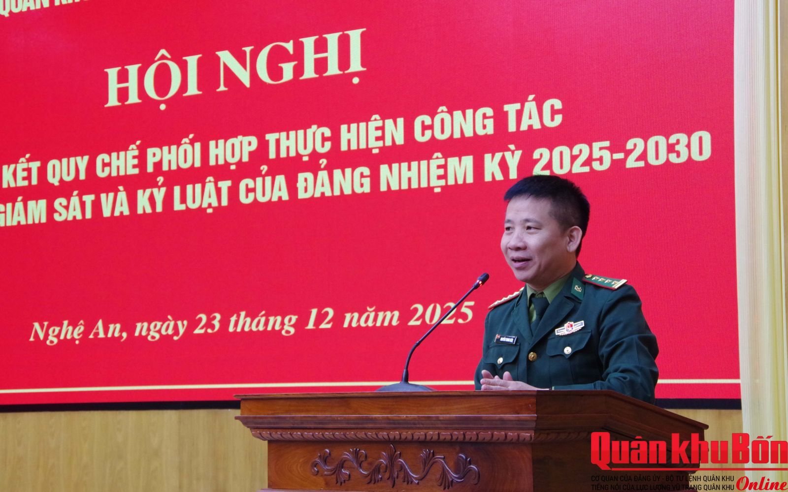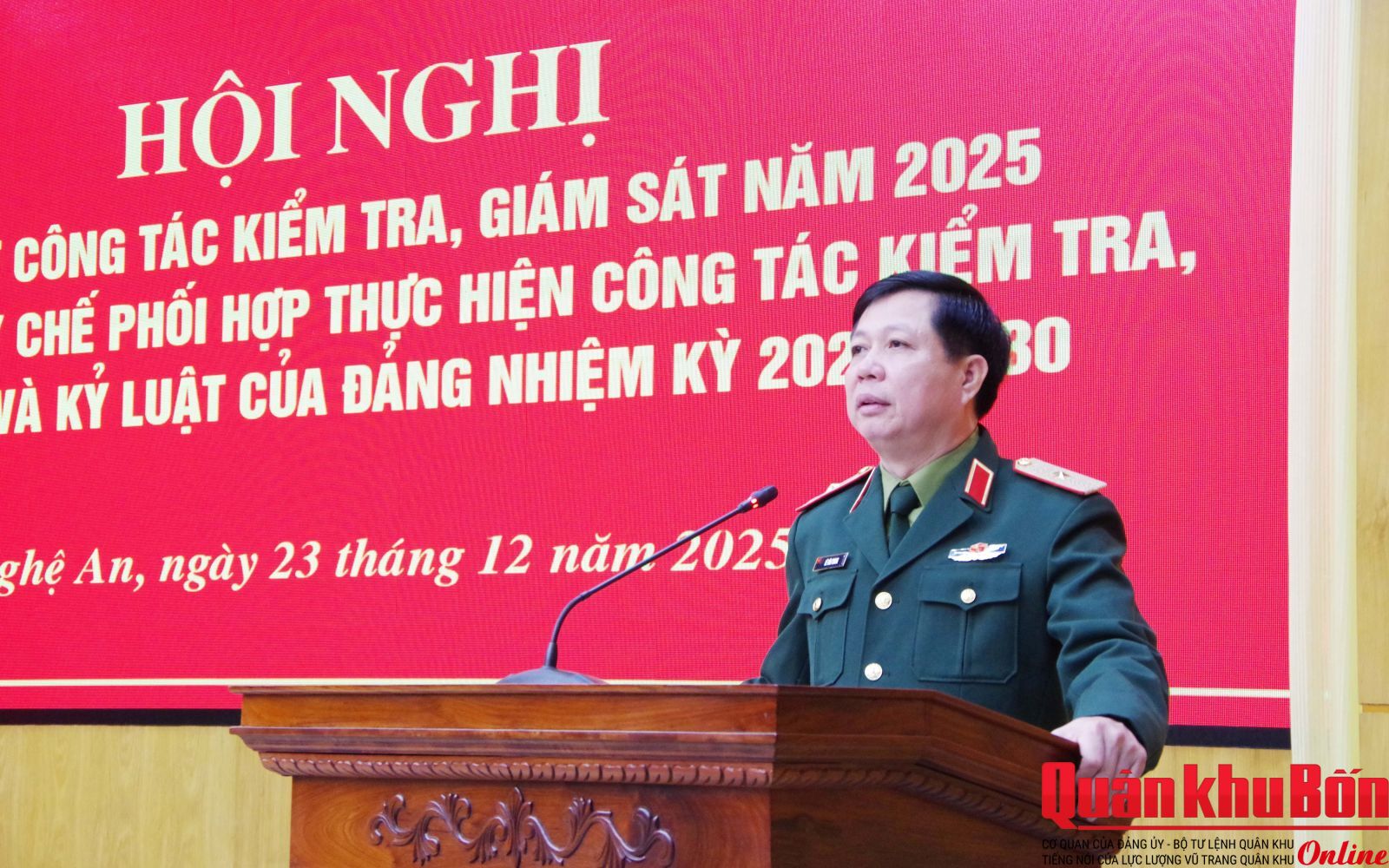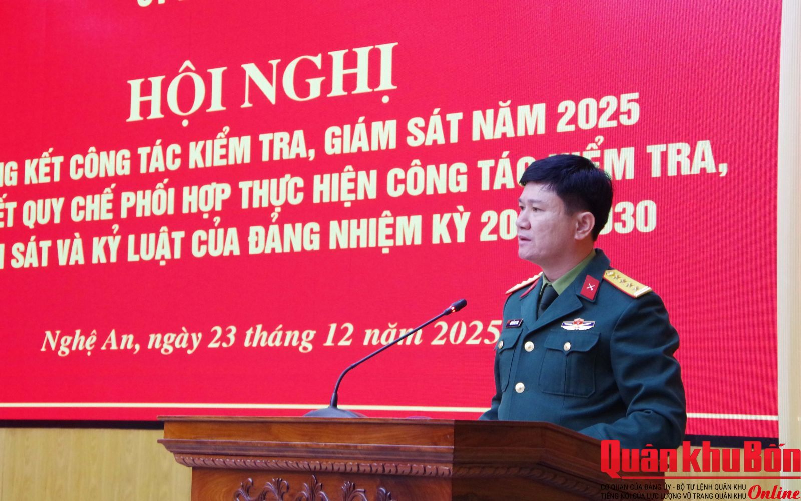 Sáng ngày 23/12/2025, Ủy ban Kiểm tra Đảng ủy Quân khu 4 đã tổ chức Hội nghị tổng kết công tác kiểm tra, giám sát năm 2025 và ký kết Quy chế phối hợp thực hiện công tác kiểm tra, giám sát và kỷ luật của Đảng nhiệm kỳ 2025 - 2030. Thiếu tướng Ngô Quang Tuấn, Ủy viên chuyên trách Ủy ban Kiểm tra Quân ủy Trung ương dự, chỉ đạo Hội nghị. Thiếu tướng Lê Văn Trung, Ủy viên Ban Thường vụ Đảng ủy, Phó Chính ủy Quân khu, Chủ nhiệm Ủy ban Kiểm tra Đảng ủy Quân khu 4 chủ trì Hội nghị.