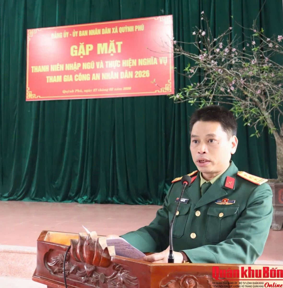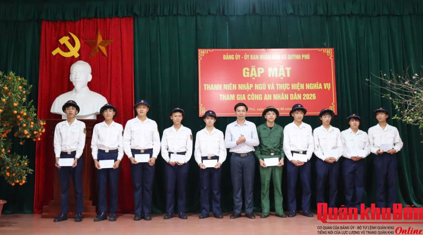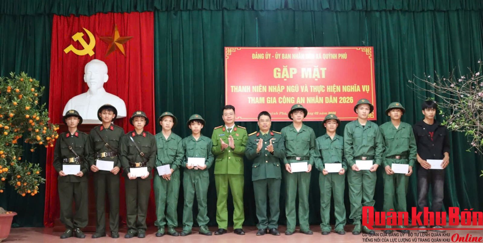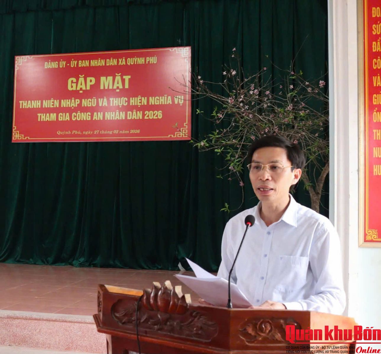 Ngày 27/2/2026, Đảng ủy, UBND xã Quỳnh Phú, tỉnh Nghệ An tổ chức gặp mặt, tặng quà cho thanh niên lên đường nhập ngũ năm 2026. Dự buổi gặp mặt có các đồng chí: Hồ Văn Thanh, Phó Bí thư Đảng ủy, Chủ tịch UBND, Chủ tịch Hội đồng nghĩa vụ Quân sự xã; Lê Khánh Toàn, UVBTV Đảng ủy, Phó Chủ tịch HĐND xã; Thượng tá Hồ Xuân Tiến, Chỉ huy trưởng Ban CHQS xã, cùng đại diện lãnh đạo UBMTTQ Việt Nam xã, các phòng, ngành liên quan.