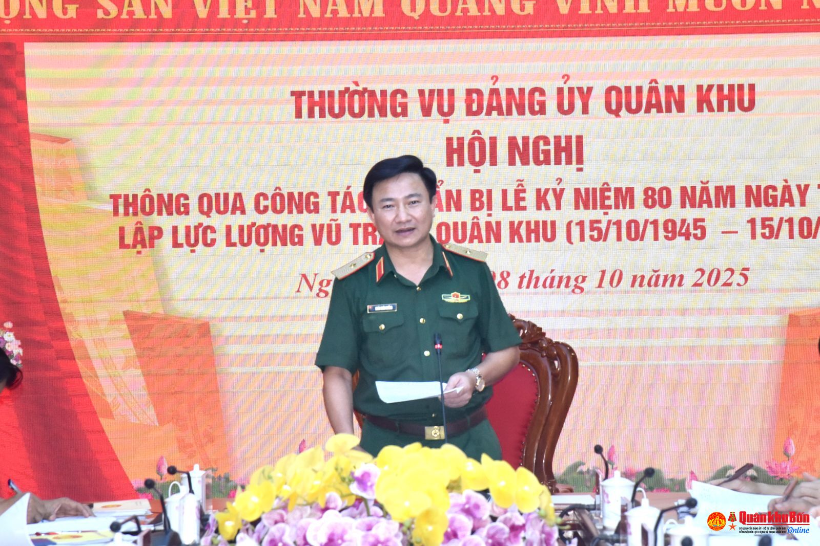 Chiều 8/10/2025, Ban Thường vụ Đảng ủy Quân khu 4 tổ chức Hội nghị mở rộng thông qua công tác chuẩn bị Lễ kỷ niệm 80 năm Ngày truyền thống Lực lượng vũ trang Quân khu (15/10/1945 - 15/10/2025). Thiếu tướng Đoàn Xuân Bường, Bí thư Đảng ủy, Chính ủy Quân khu chủ trì hội nghị. Trung tướng Hà Thọ Bình, Phó Bí thư Đảng ủy, Tư lệnh Quân khu cùng các đồng chí trong Ban Thường vụ Đảng ủy Quân khu dự hội nghị. Cùng dự có các Tiểu ban giúp việc Lễ kỷ niệm và đại diện các cơ quan, đơn vị liên quan.