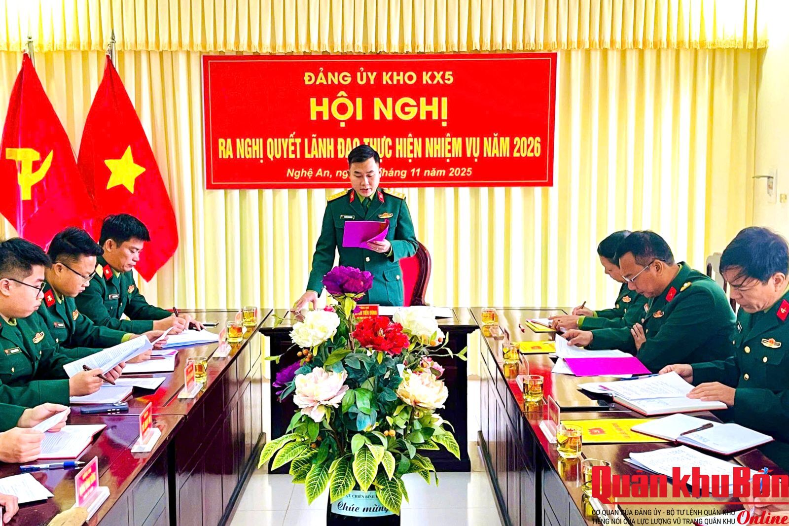 Sáng ngày 24/11, Đảng ủy Kho KX5, Cục Hậu cần - Kỹ thuật Quân khu 4, tổ chức Hội nghị ra Nghị quyết lãnh đạo thực hiện nhiệm vụ năm 2026. Đại tá Hà Huy Hoàng, Ủy viên Ban Thường vụ Đảng ủy, Chủ nhiệm Chính trị Cục Hậu cần - Kỹ thuật dự và phát biểu chỉ đạo. Cùng dự có các đại biểu các phòng: Tham mưu -Kế hoạch; Chính trị; Xe máy - Vận tải.