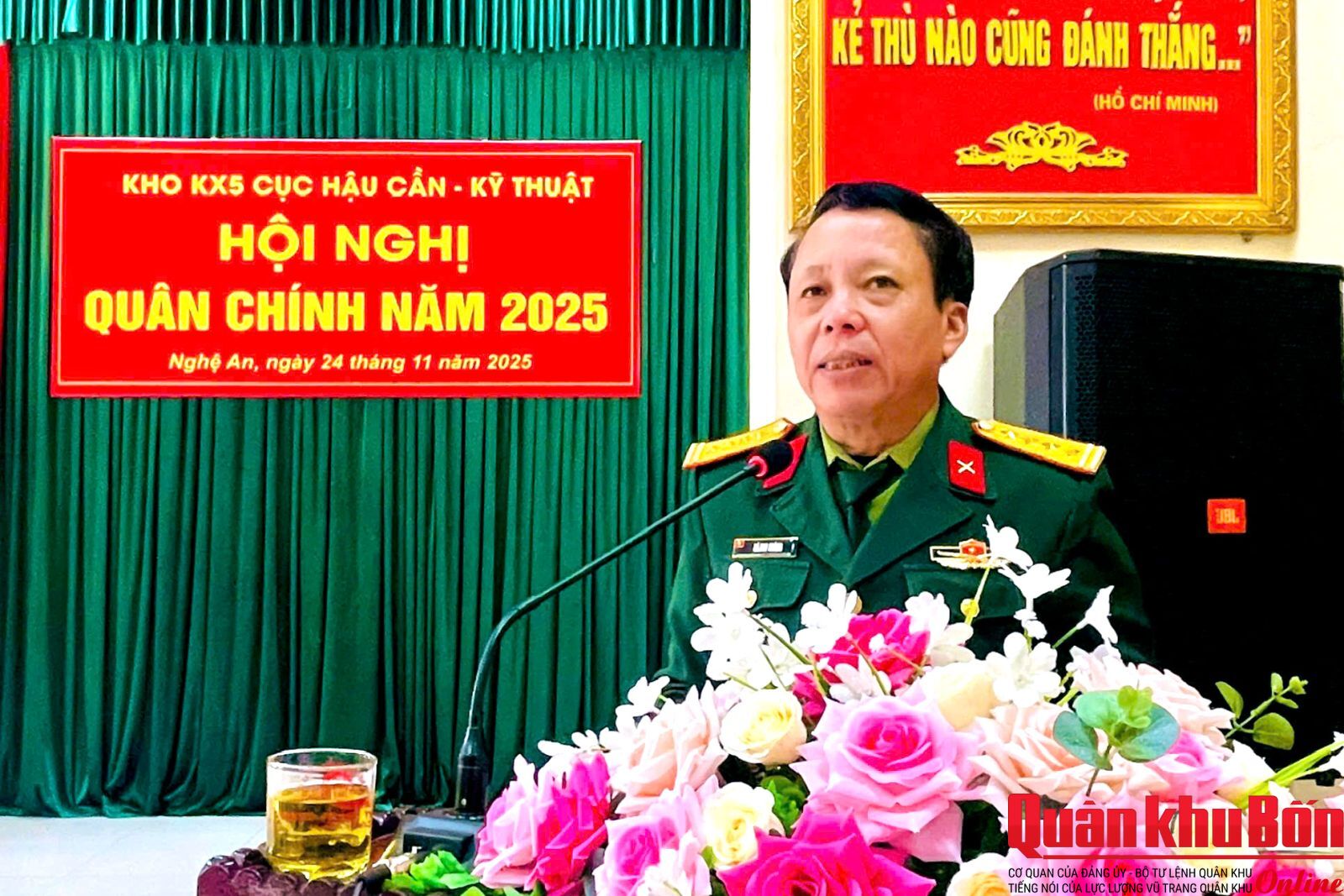 Phát biểu chỉ đạo tại Hội nghị, thay mặt Thường vụ Đảng ủy Cục Hậu cần - Kỹ thuật, Đại tá Hà Huy Hoàng ghi nhận và biểu dương những kết quả nổi bật của Đảng ủy Kho KX5 trong năm 2025; nhất là công tác bảo đảm vật tư, trang bị kỹ thuật, xây dựng nền nếp chính quy và triển khai hiệu quả các hoạt động thi đua. Đồng chí Chủ nhiệm Chính trị Cục nhấn mạnh, năm 2026 Đảng ủy Kho cần tập trung lãnh đạo nâng cao chất lượng công tác kỹ thuật, thực hiện nghiêm quy trình bảo quản, bảo dưỡng và niêm cất; duy trì hệ số vật tư, trang bị sẵn sàng đáp ứng các nhiệm vụ thường xuyên và đột xuất. Tiếp tục đẩy mạnh chuyển đổi số trong quản lý, kiểm kê kho tàng; chú trọng xây dựng chính quy, rèn luyện kỷ luật, bảo đảm an toàn trong mọi hoạt động. Quan tâm phát huy vai trò nêu gương của đội ngũ cán bộ, đảng viên; xây dựng khối đoàn kết thống nhất trong toàn Đảng bộ; tạo động lực hoàn thành xuất sắc các mục tiêu, chỉ tiêu Nghị quyết đề ra.
