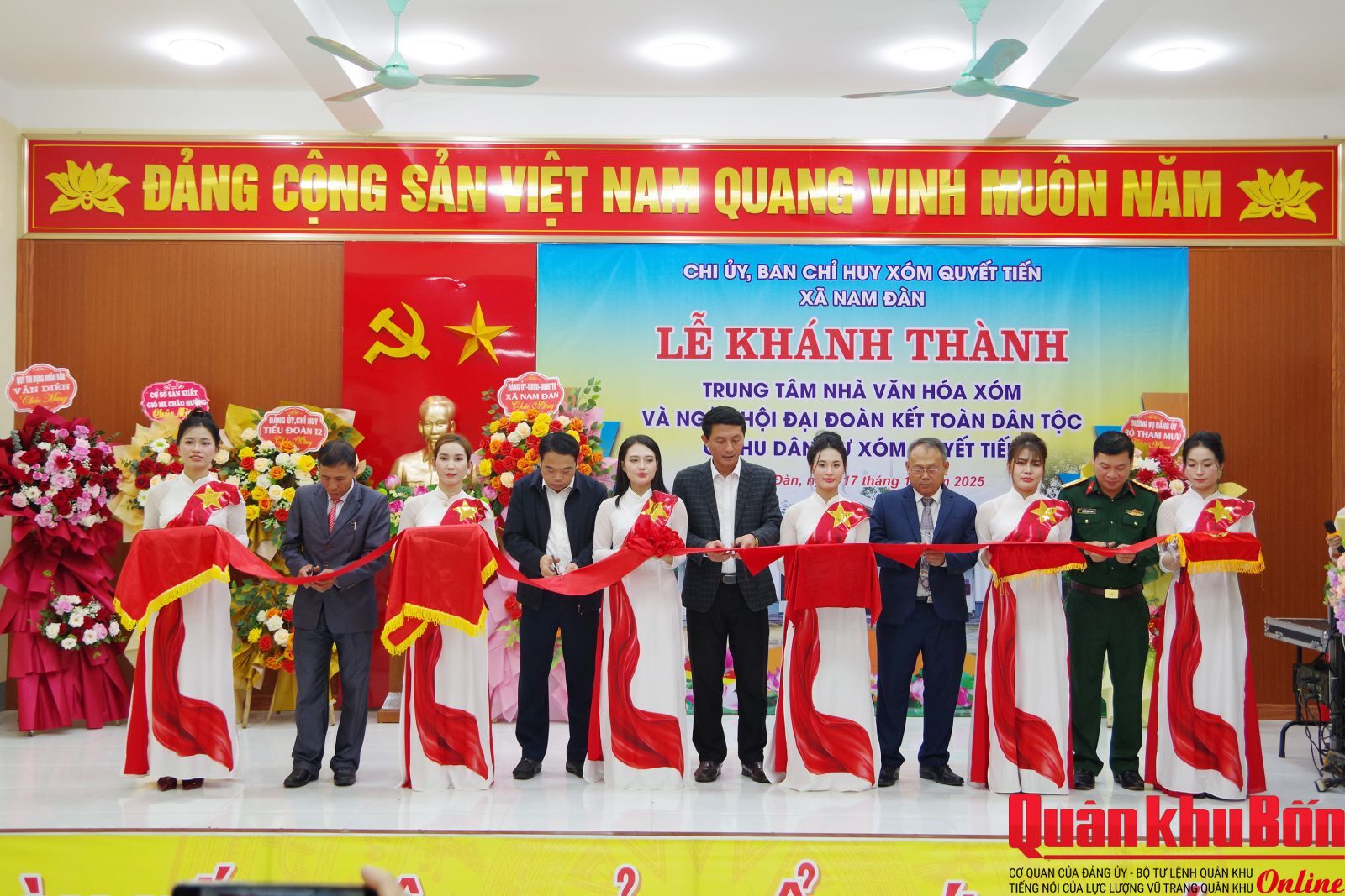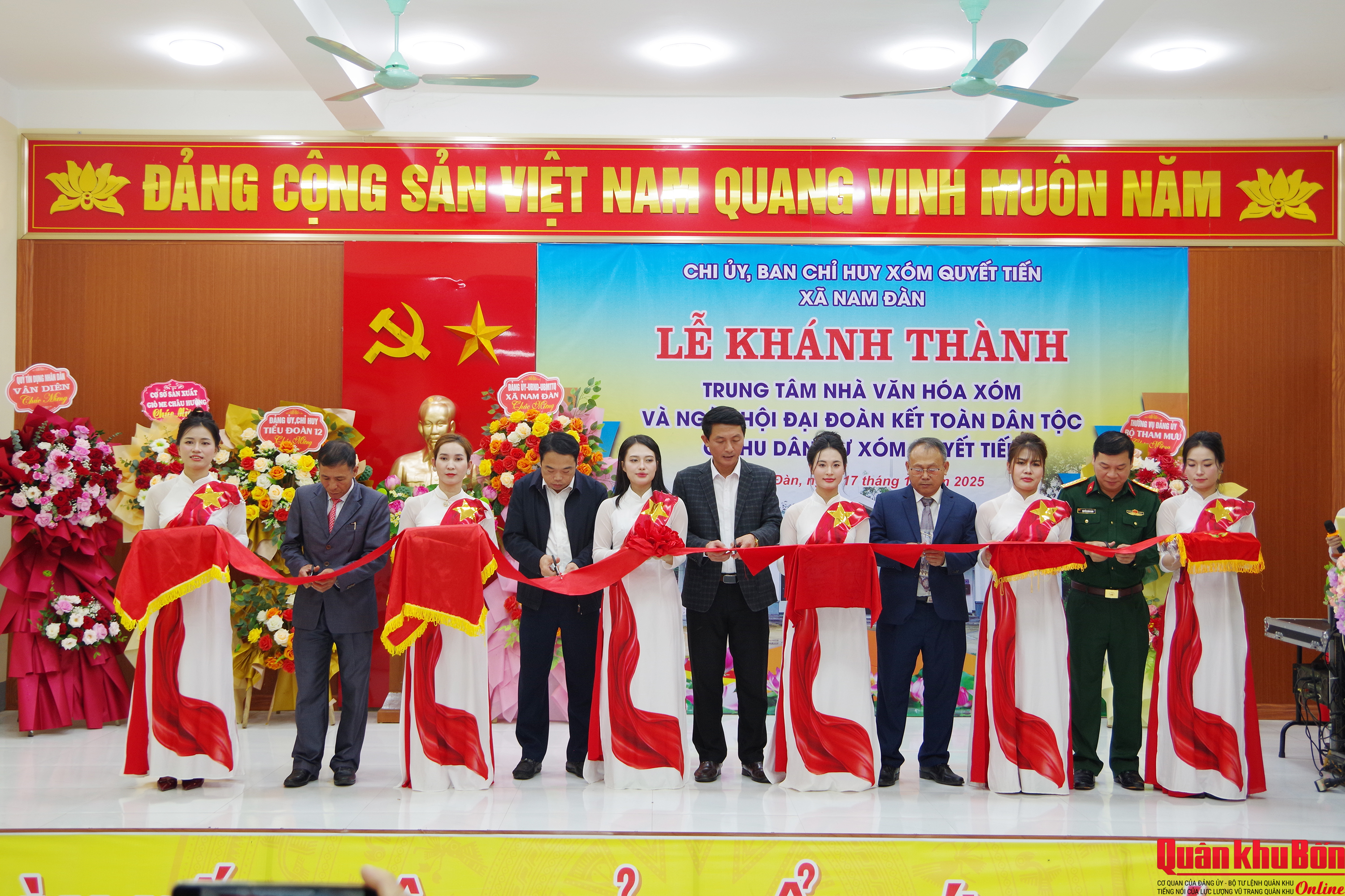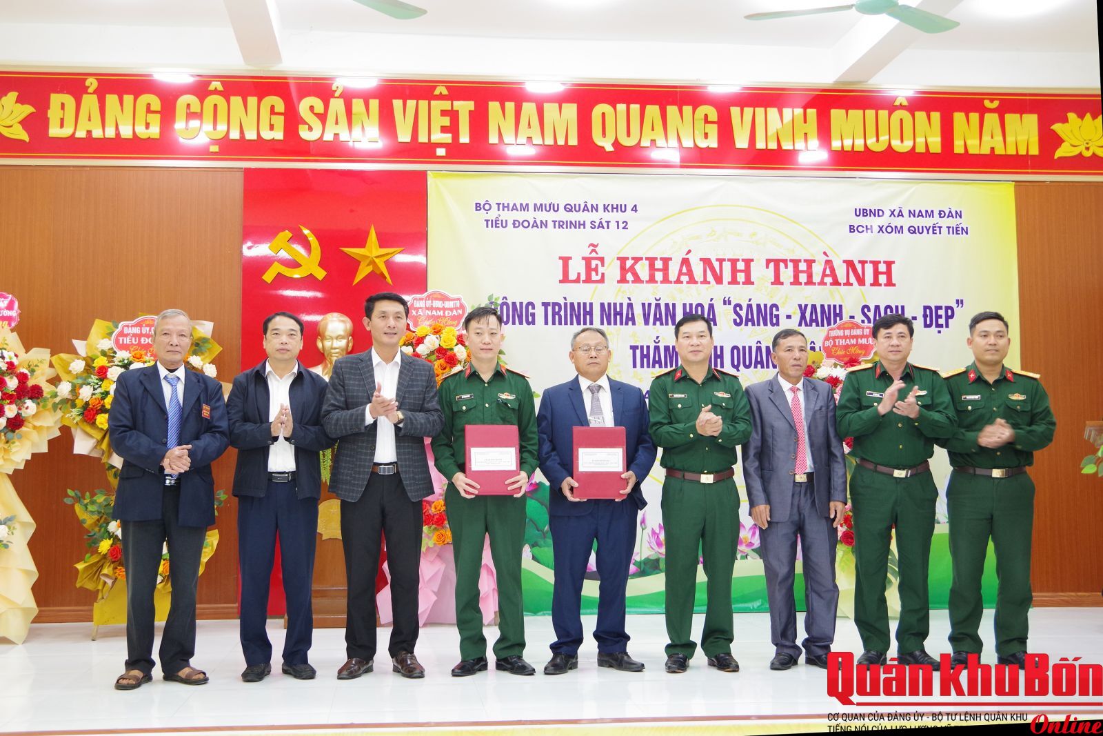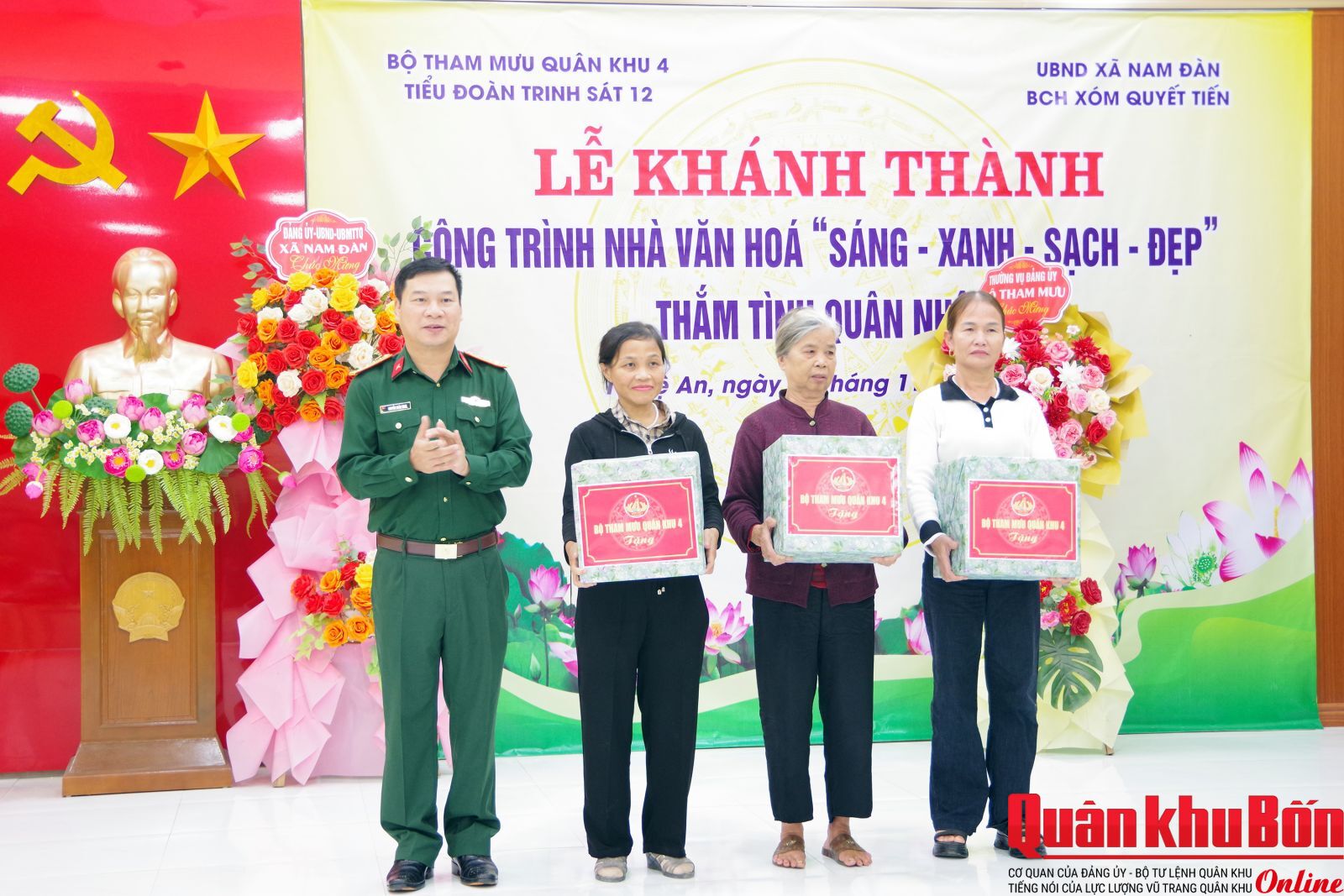 Chiều 17/11/2025, Bộ Tham mưu Quân khu 4 chỉ đạo Tiểu đoàn Trinh sát 12 phối hợp cấp ủy, chính quyền xóm Quyết Tiến, xã Nam Đàn, tỉnh Nghệ An tổ chức khánh thành Nhà văn hóa “Sáng - Xanh - Sạch - Đẹp” và trao quà tặng các gia đình có hoàn cảnh đặc biệt khó khăn.