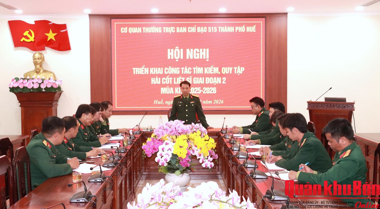 Chiều 26/2/2026, Bộ Chỉ huy Quân sự (CHQS) - Cơ quan Thường trực Ban Chỉ đạo 515 thành phố Huế tổ chức hội nghị triển khai nhiệm vụ tìm kiếm, quy tập hài cốt liệt sĩ (HCLS) trên địa bàn trong nước, giai đoạn 2 mùa khô 2025-2026. Đại tá Hà Văn Ái, Phó Chính ủy Bộ CHQS thành phố chủ trì hội nghị.