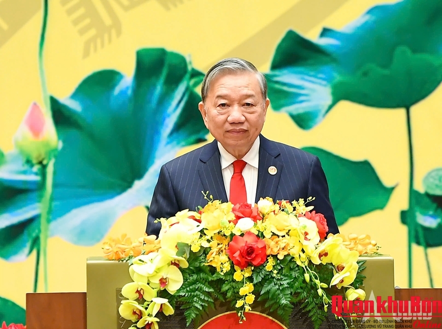 Thay mặt lãnh đạo Đảng, Nhà nước, Tổng Bí thư trân trọng gửi tới các đồng chí lãnh đạo, nguyên lãnh đạo Đảng, Nhà nước, Mặt trận Tổ quốc Việt Nam; các đồng chí lãnh đạo, nguyên lãnh đạo Quốc hội và các đại biểu Quốc hội qua các thời kỳ, đồng bào, chiến sĩ lời thăm hỏi ân cần và lời chúc mừng tốt đẹp nhất.