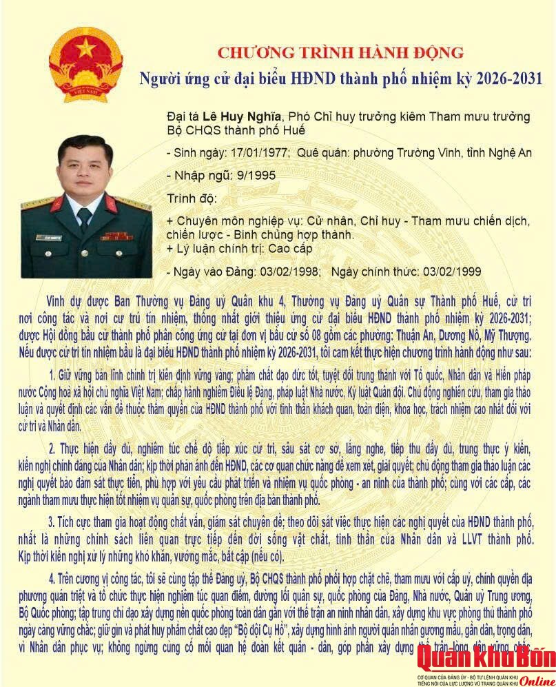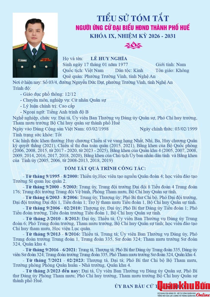 Ngày 23/2/2026, Ủy ban bầu cử thành phố Huế ban hành Nghị quyết số 72/NQ-UBBC về việc công bố danh sách chính thức những người ứng cử đại biểu Hội đồng nhân dân thành phố Huế khóa IX, nhiệm kỳ 2026 - 2031. Theo đó, tại Đơn vị bầu cử số 08 (gồm các phường Thuận An, Dương Nỗ, Mỹ Thượng), Đại tá Lê Huy Nghĩa - Phó Chỉ huy trưởng, Tham mưu trưởng Bộ CHQS thành phố Huế được tín nhiệm giới thiệu ứng cử đại biểu Hội đồng nhân dân thành phố Huế khóa IX, nhiệm kỳ 2026 - 2031.